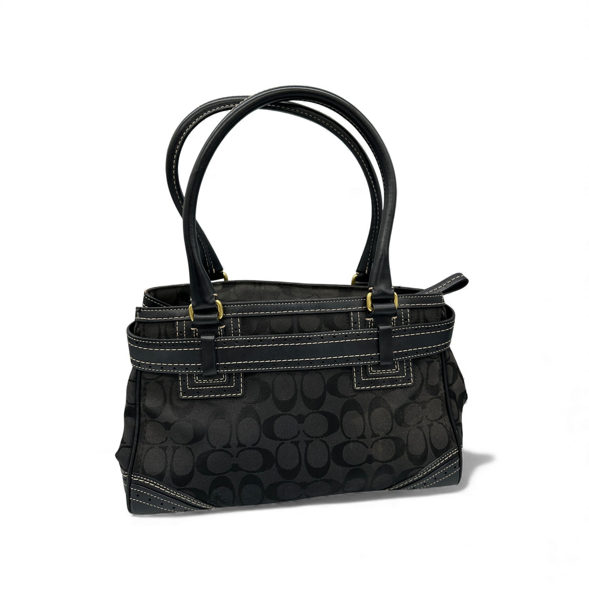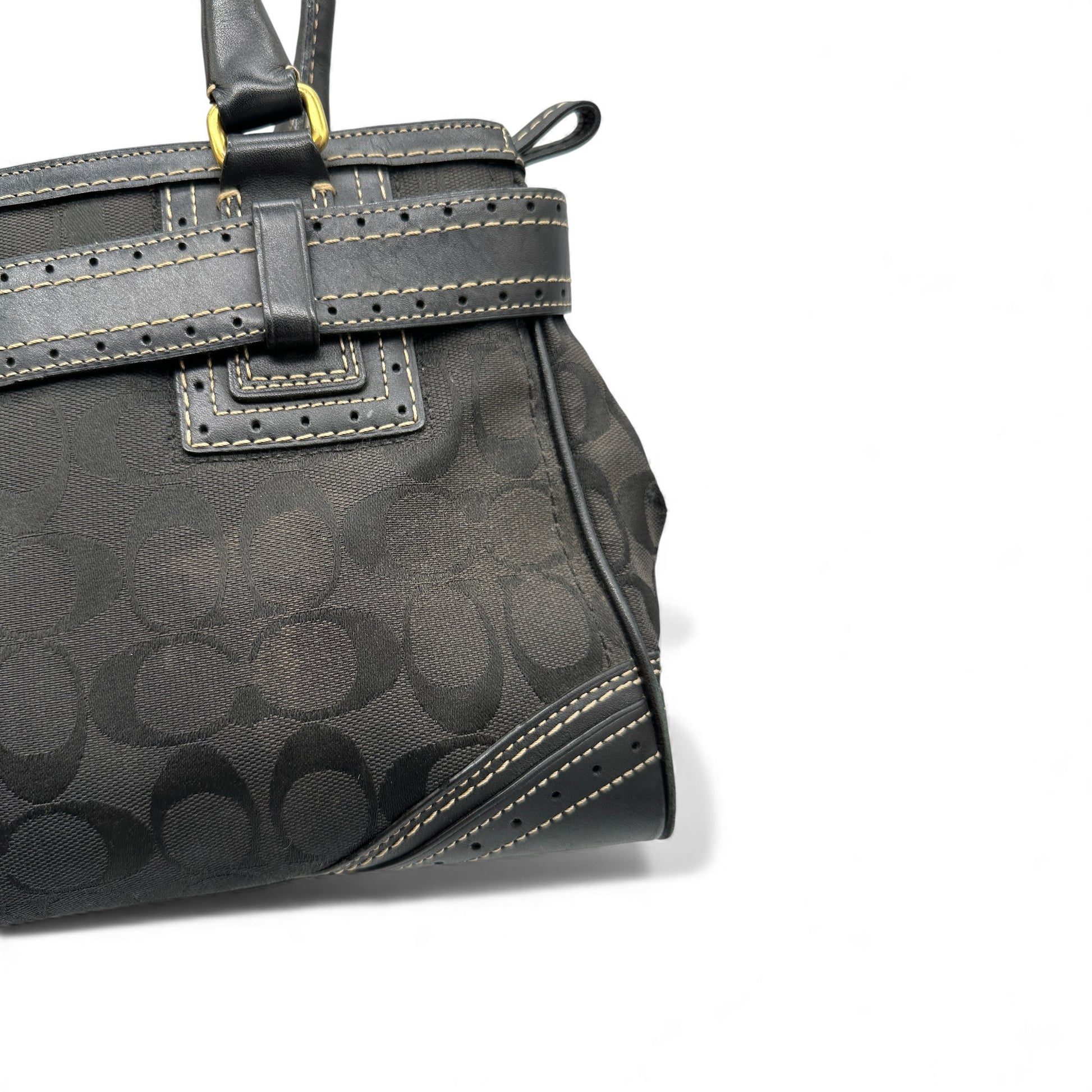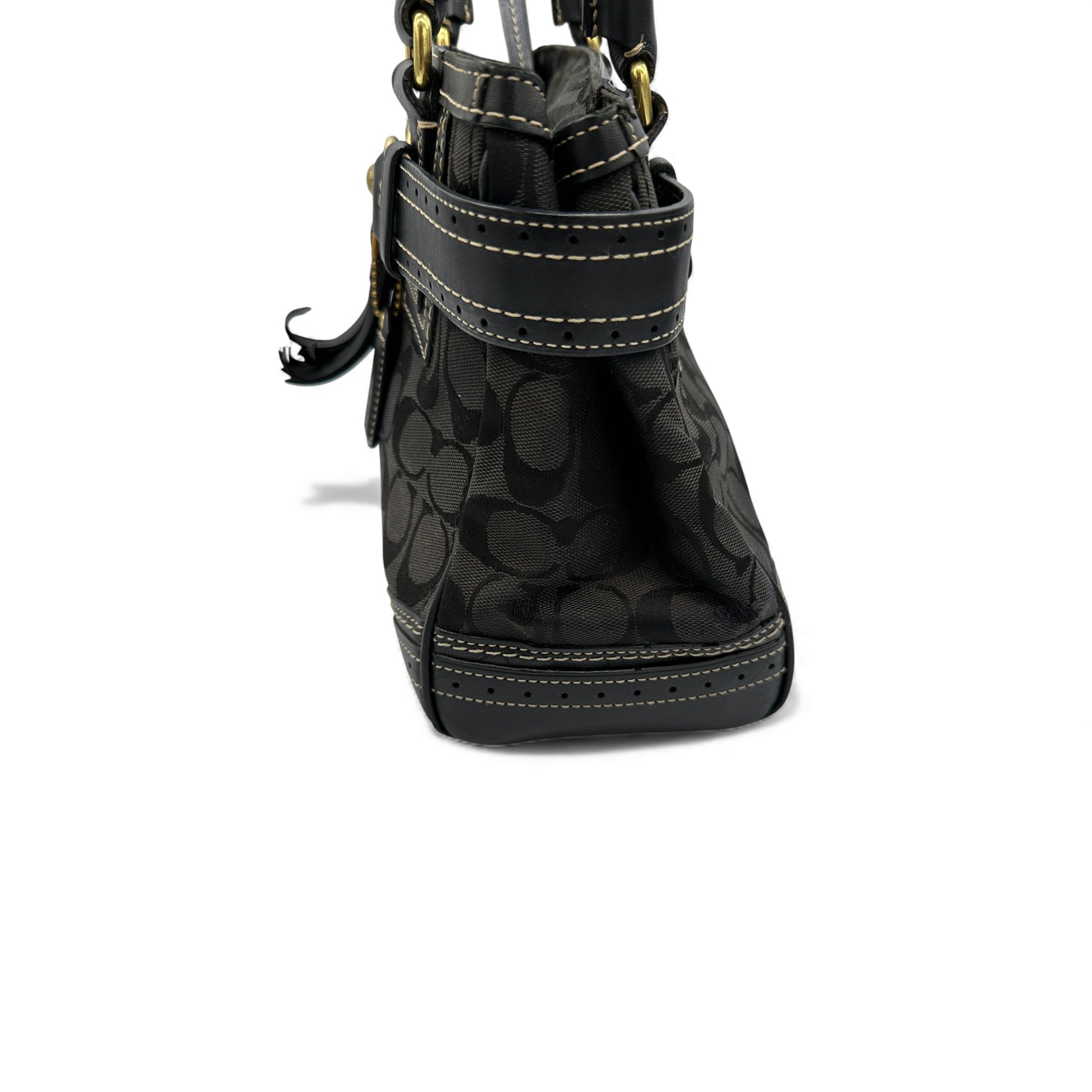 Vintage Coach Hampton Clip Handtasche (Modell 10507) in Schwarz und Grau mit charakteristischem Monogramm, schwarzem Lederbesatz und goldfarbenen Beschlägen. Ein Y2K-Modell aus dem Jahr 2007.