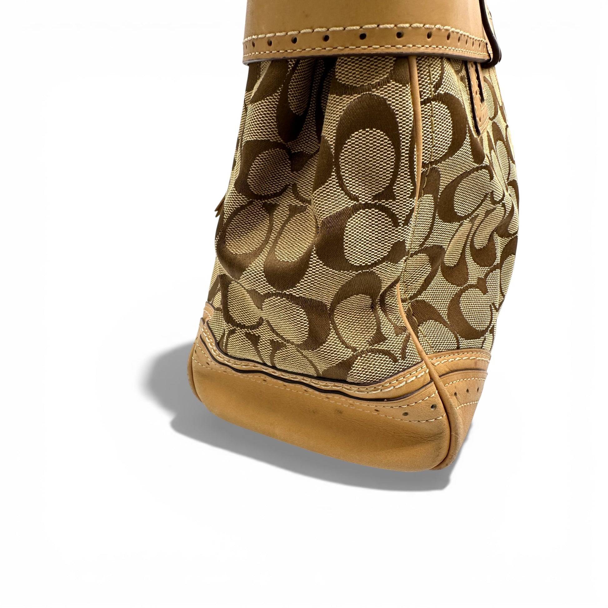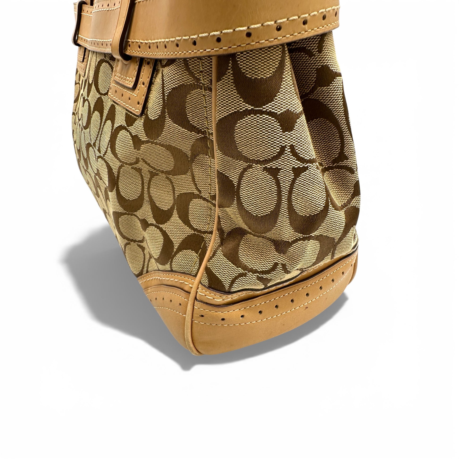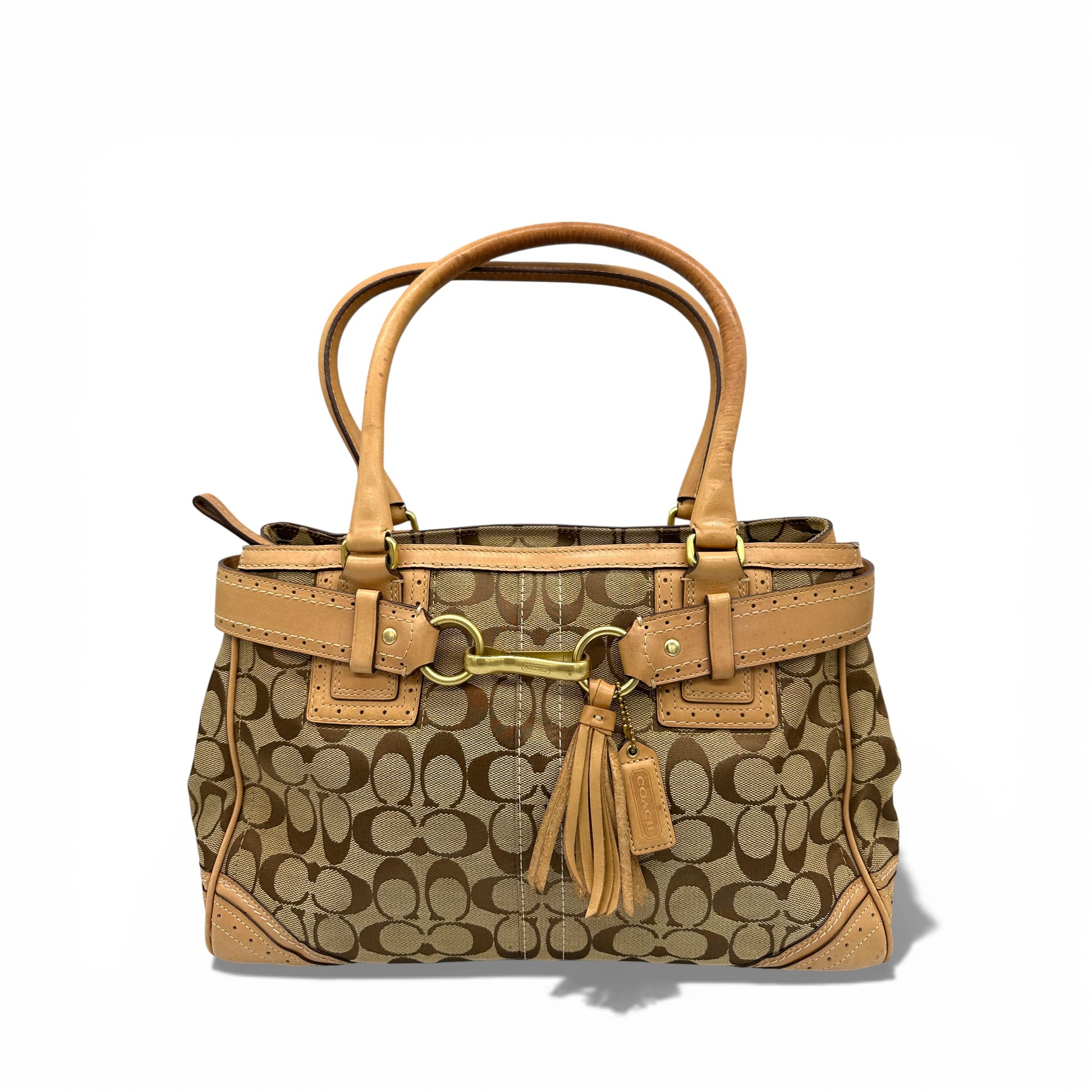 Vintage Coach 10508 Hamptons Horsebit Tote Handtasche. In Braun und Beige mit dem charakteristischen Coach-Monogramm und braun-braunem Lederbesatz. Mit Messing-Horsebit-Verschluss und Lederquaste. Ein Y2K-Modell aus dem Jahr 2007.