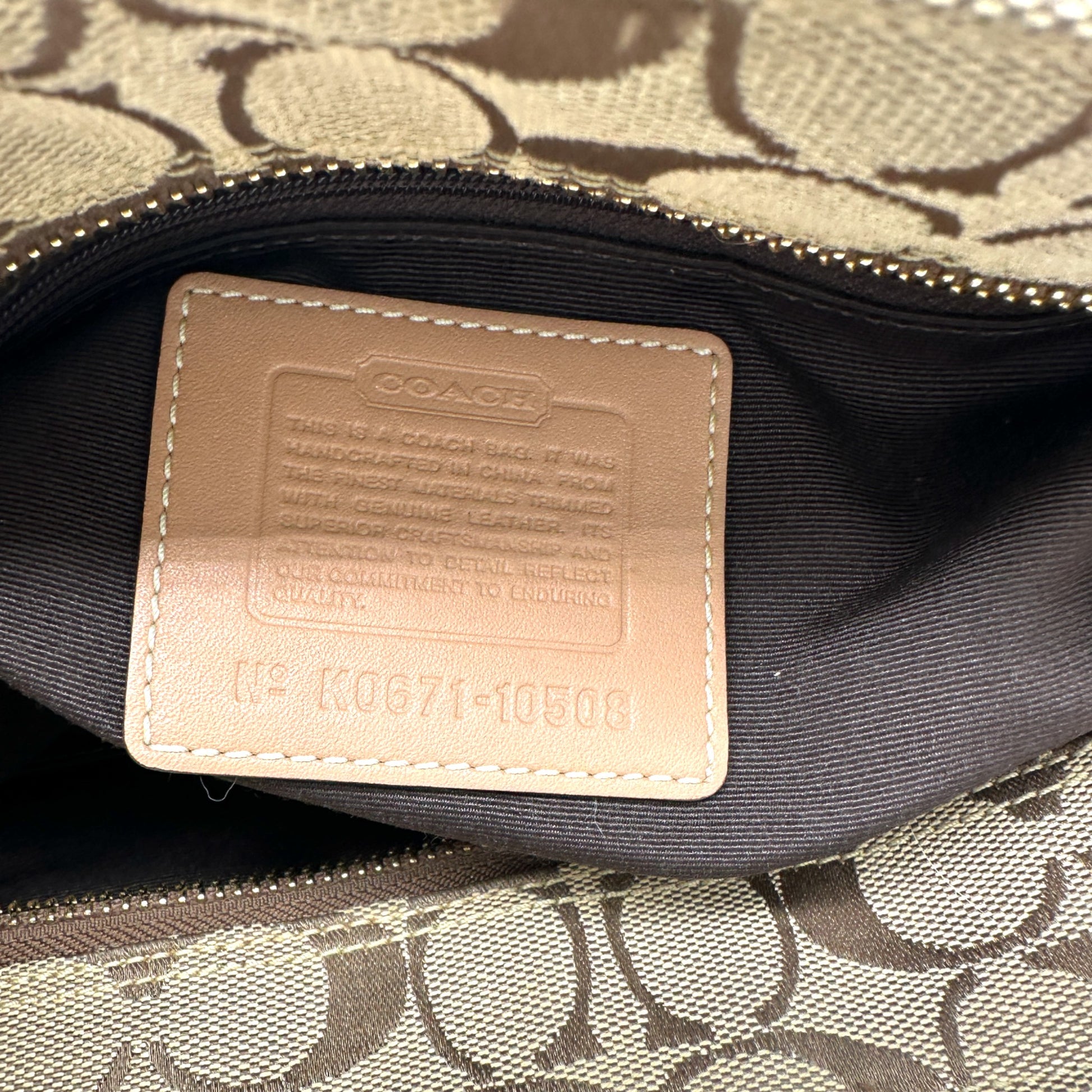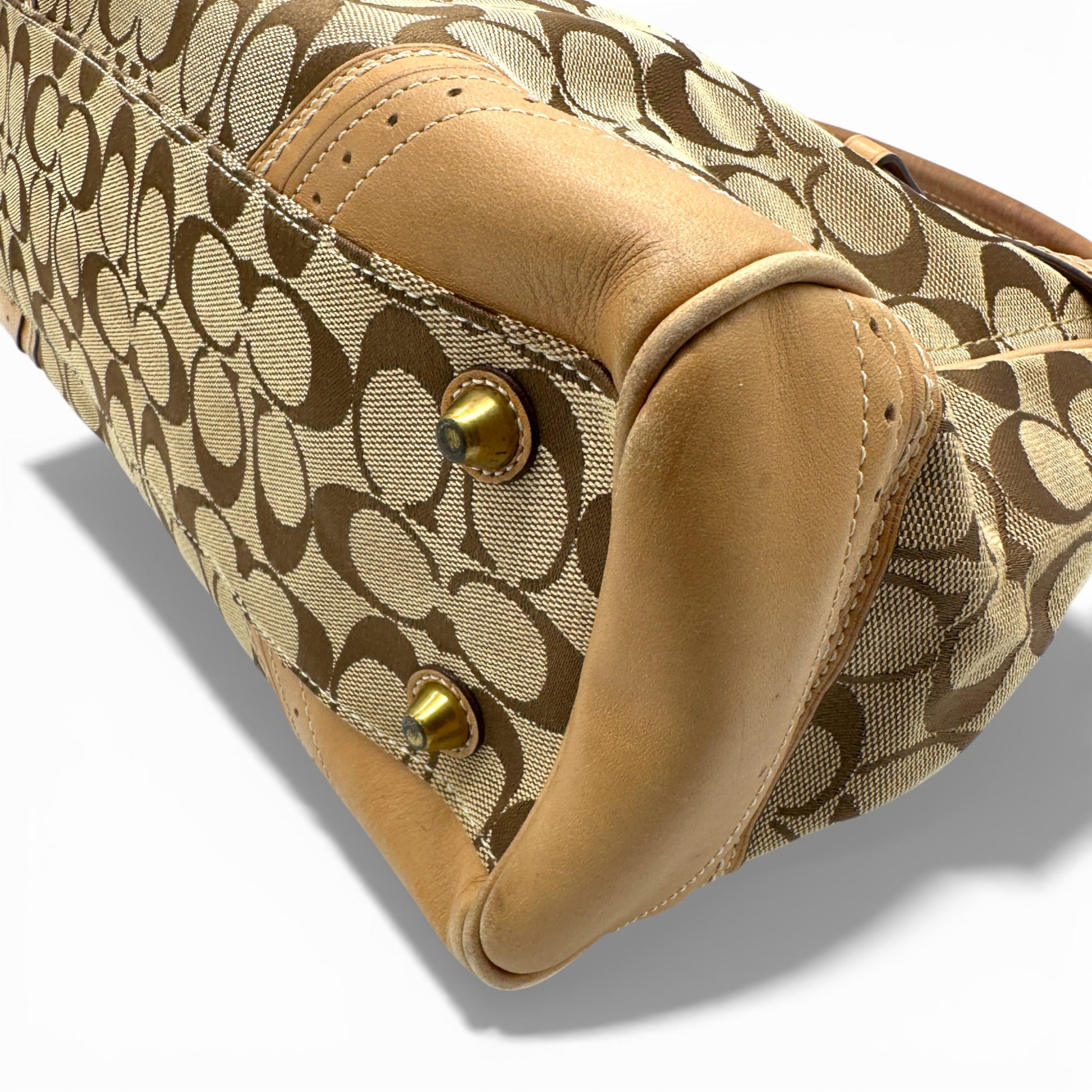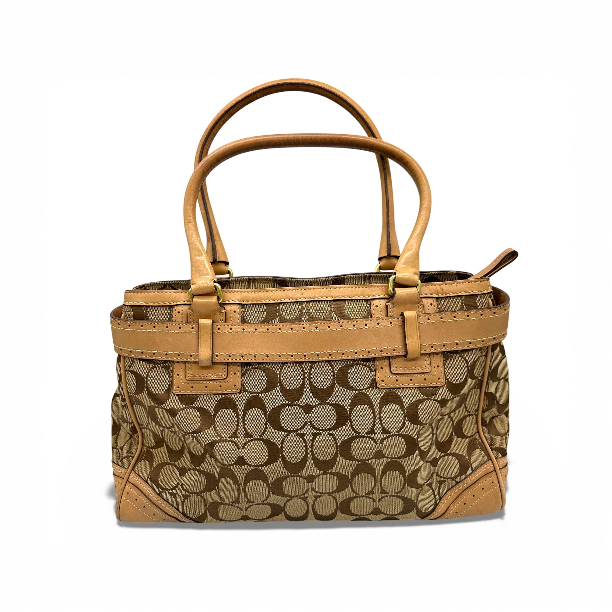 Vintage Coach 10508 Hamptons Horsebit Tote Handtasche. In Braun und Beige mit dem charakteristischen Coach-Monogramm und braun-braunem Lederbesatz. Mit Messing-Horsebit-Verschluss und Lederquaste. Ein Y2K-Modell aus dem Jahr 2007.