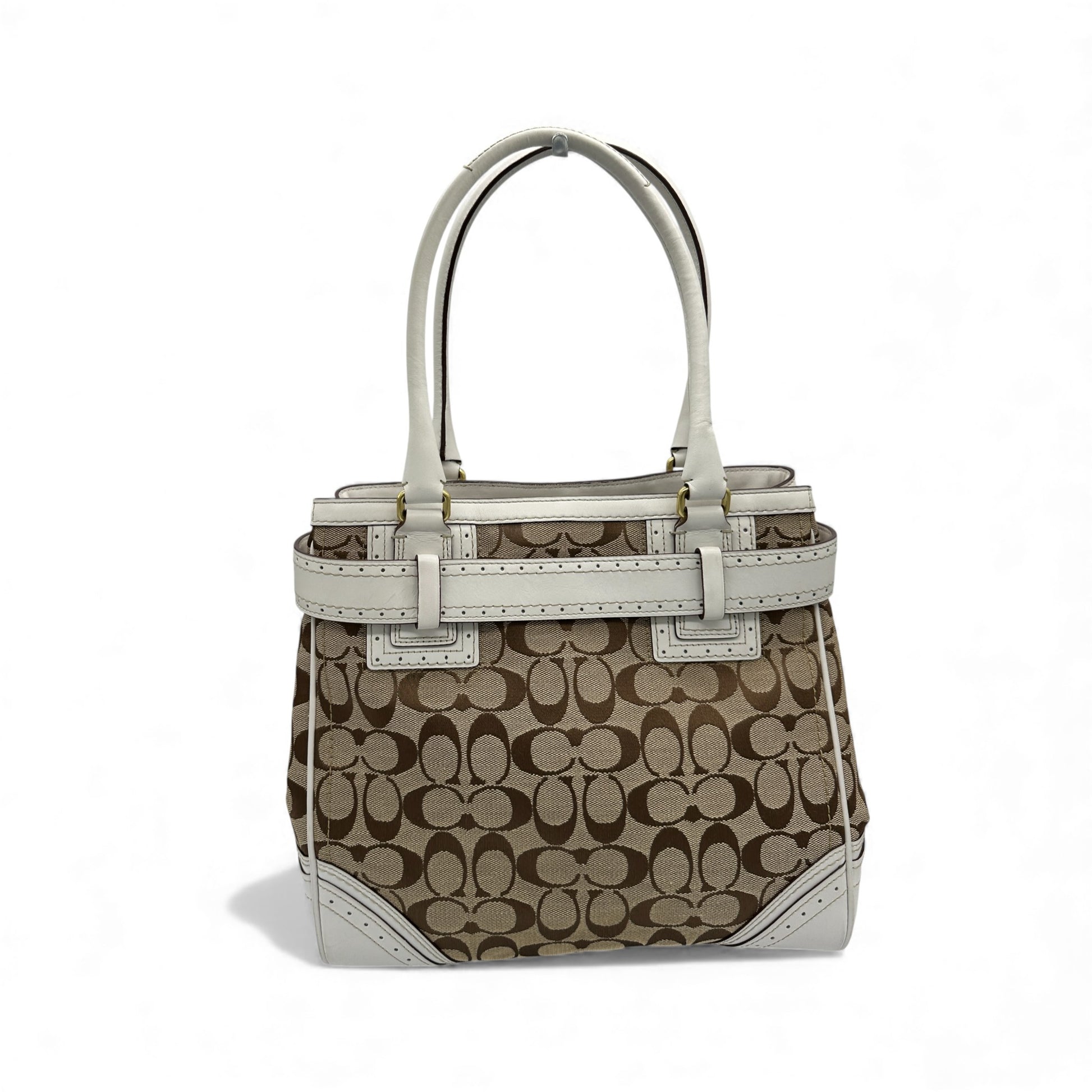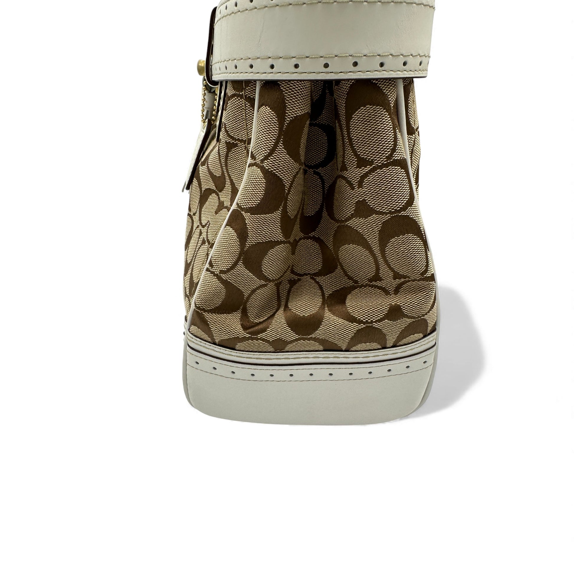 Vintage Coach Hampton Clip Handtasche (Modell 10509). In Braun und Beige mit dem charakteristischen Coach-Monogramm und weißem Lederbesatz. Mit goldfarbener Messingschnalle in Pferdegebissform und Lederquaste. Ein Y2K-Modell aus dem Jahr 2006.