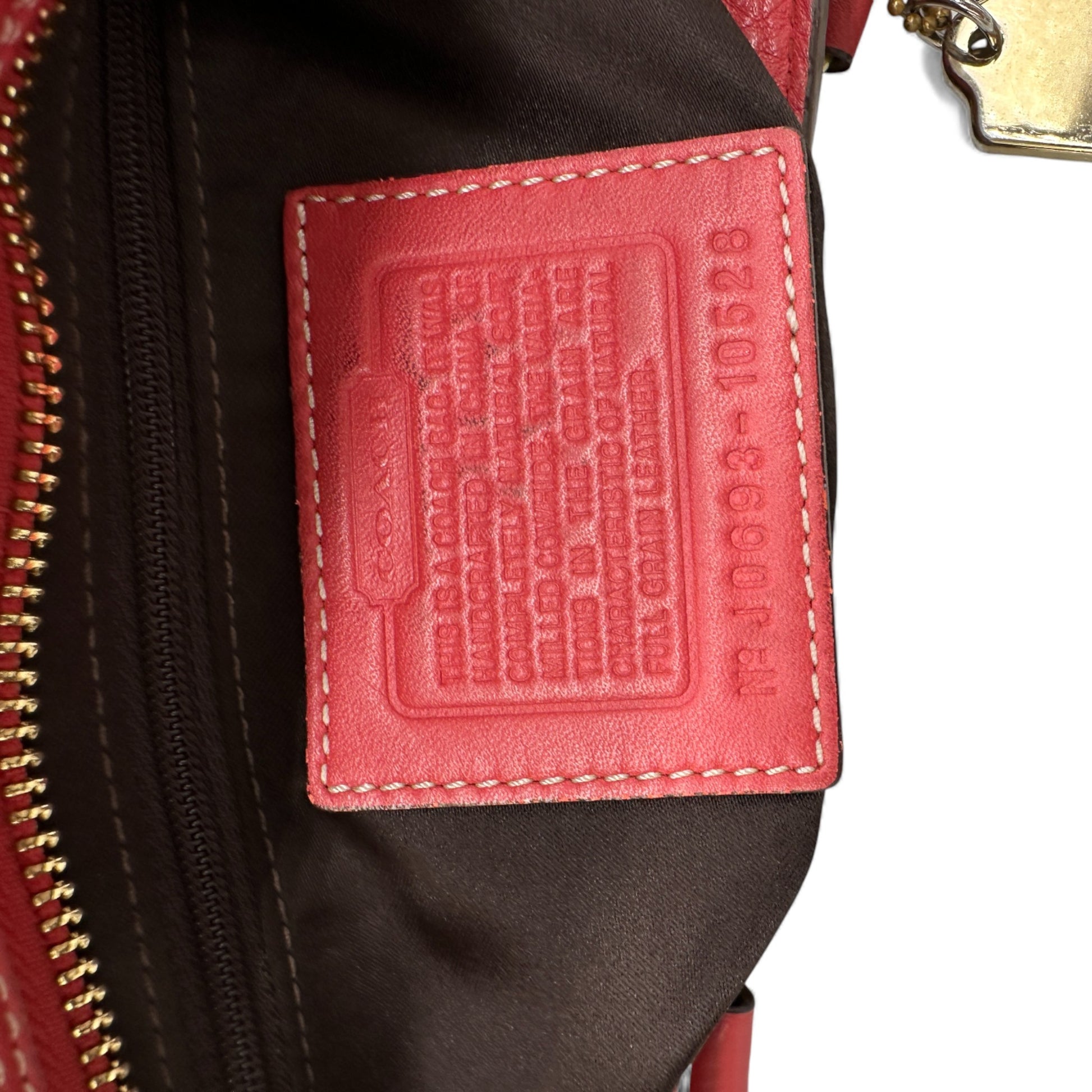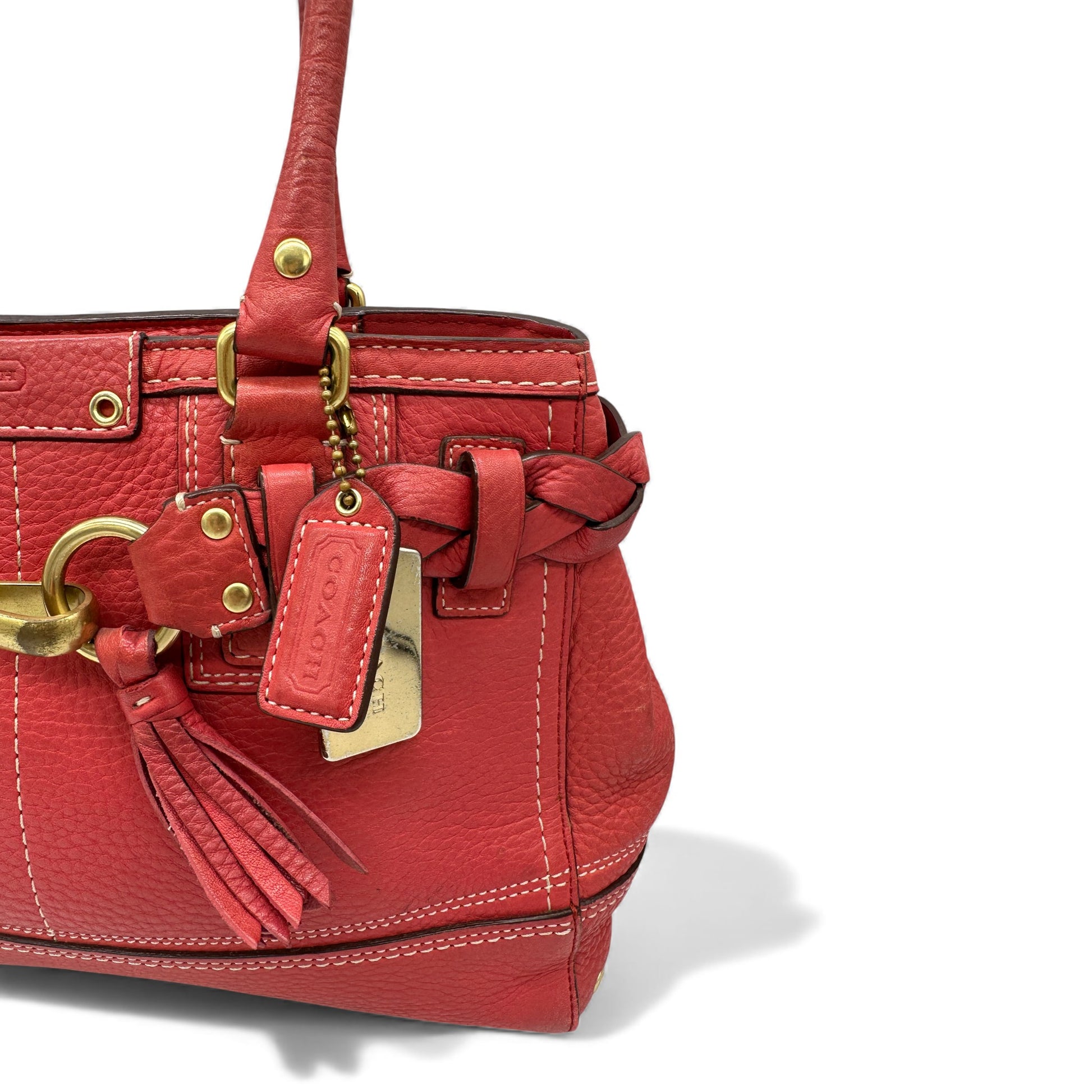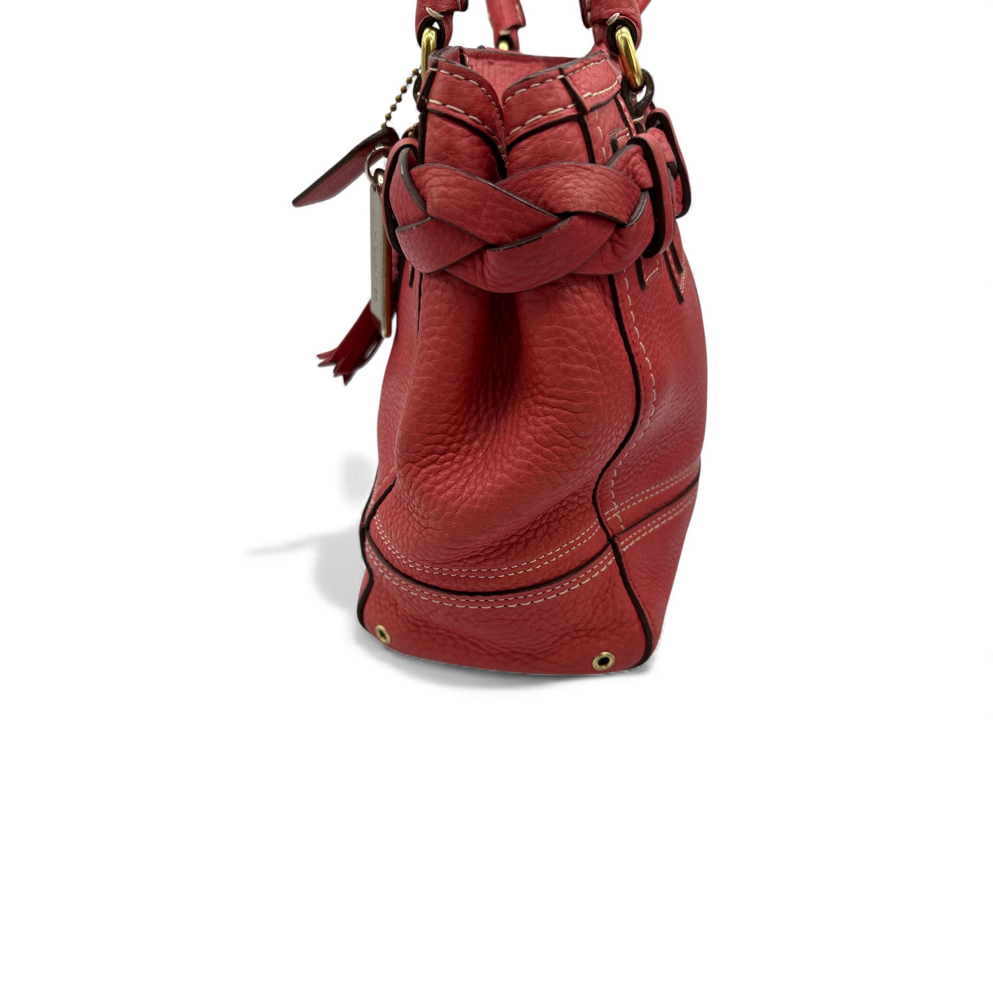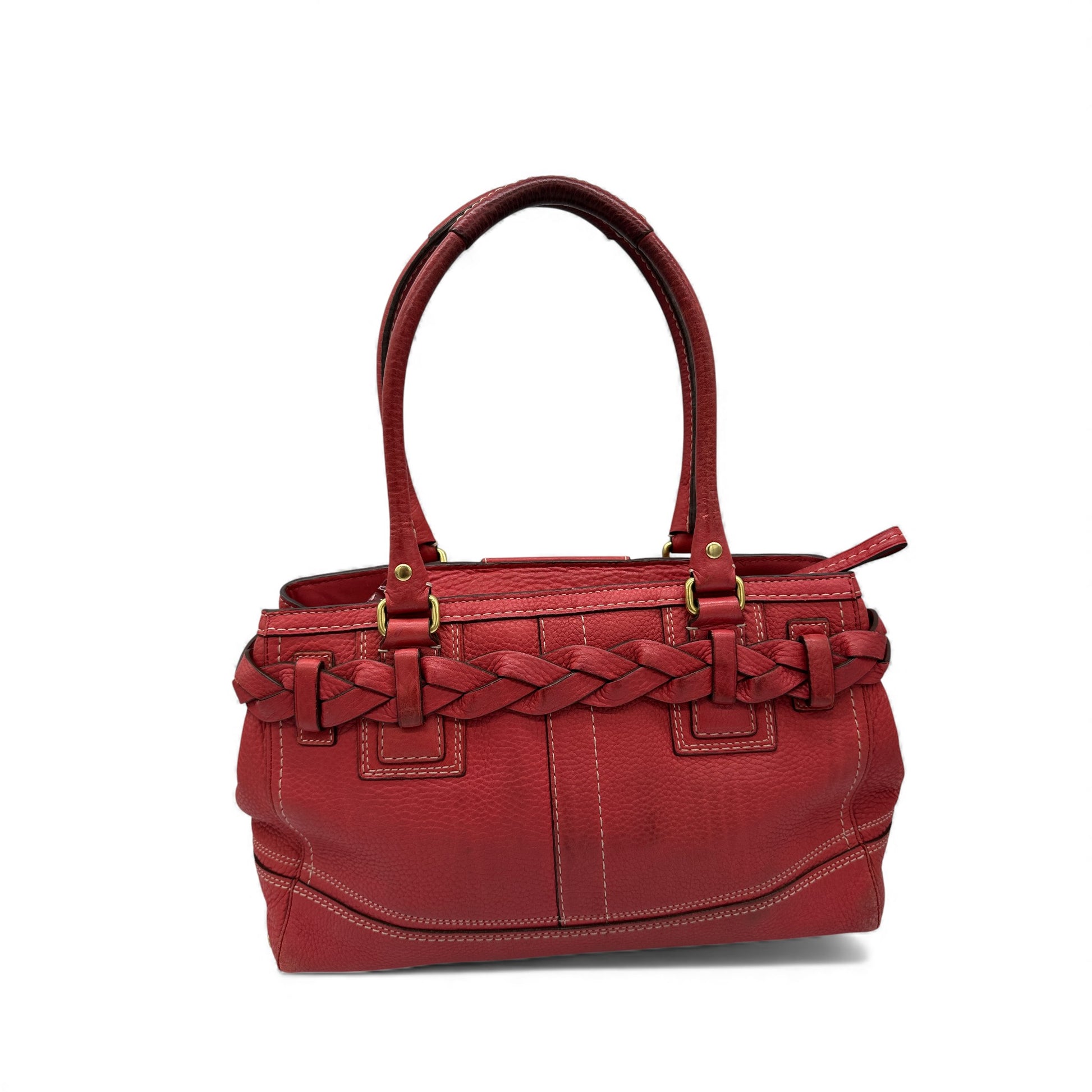 Vintage Coach Hamptons Tote Handtasche, Modell 10528. Aus weichem, genarbtem Rindsleder in Rot, mit Messing-Trageverschluss und geflochtenen Akzenten. Mit Coach-Lederanhänger und goldfarbenem Metallanhänger. Ein Y2K-Modell aus dem Jahr 2006.