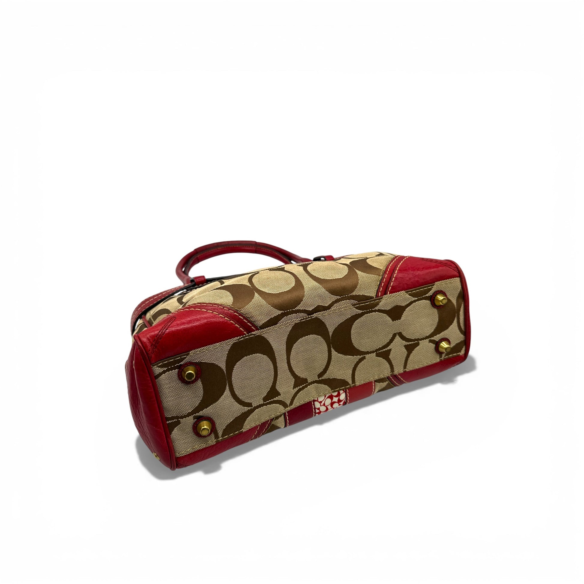 Vintage Coach F13065 Hampton Clip Handtasche in Beige und Braun mit charakteristischem Monogramm, rotem Lederbesatz und silberfarbenem Hampton-Clip. Ein Y2K-Modell aus dem Jahr 2008.