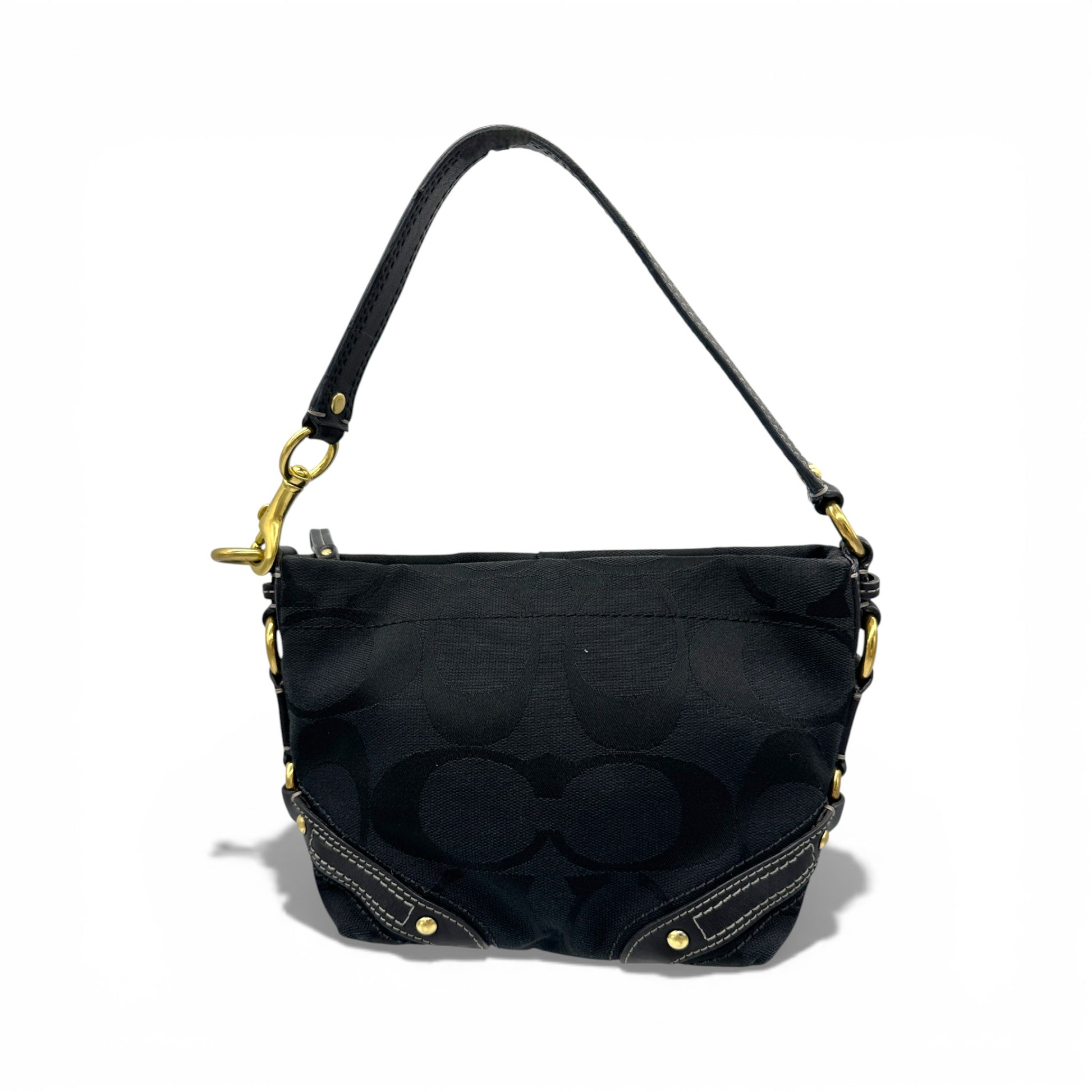 Vintage Coach 40347 Mini Carly Schultertasche, beigefarben mit charakteristischem Monogramm, dunkelbraunem/schwarzem Lederbesatz und goldfarbenen Beschlägen. Ein Y2K-Modell aus dem Jahr 2007.