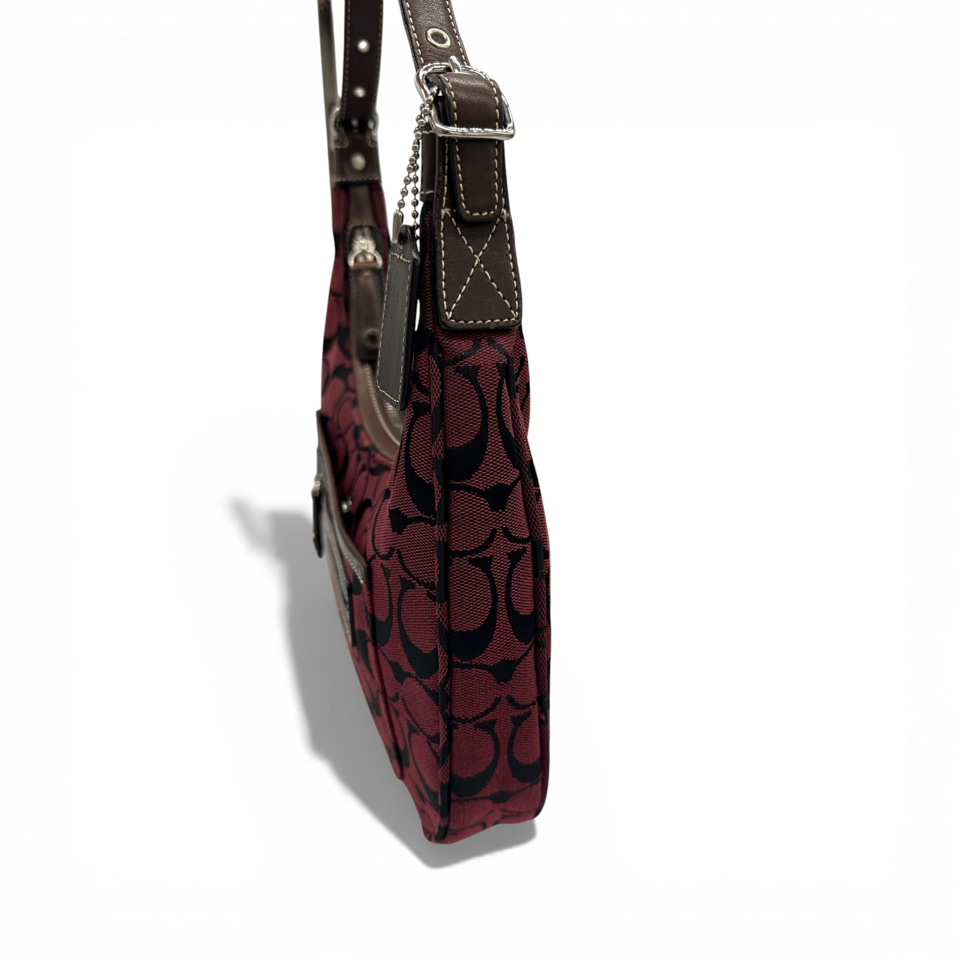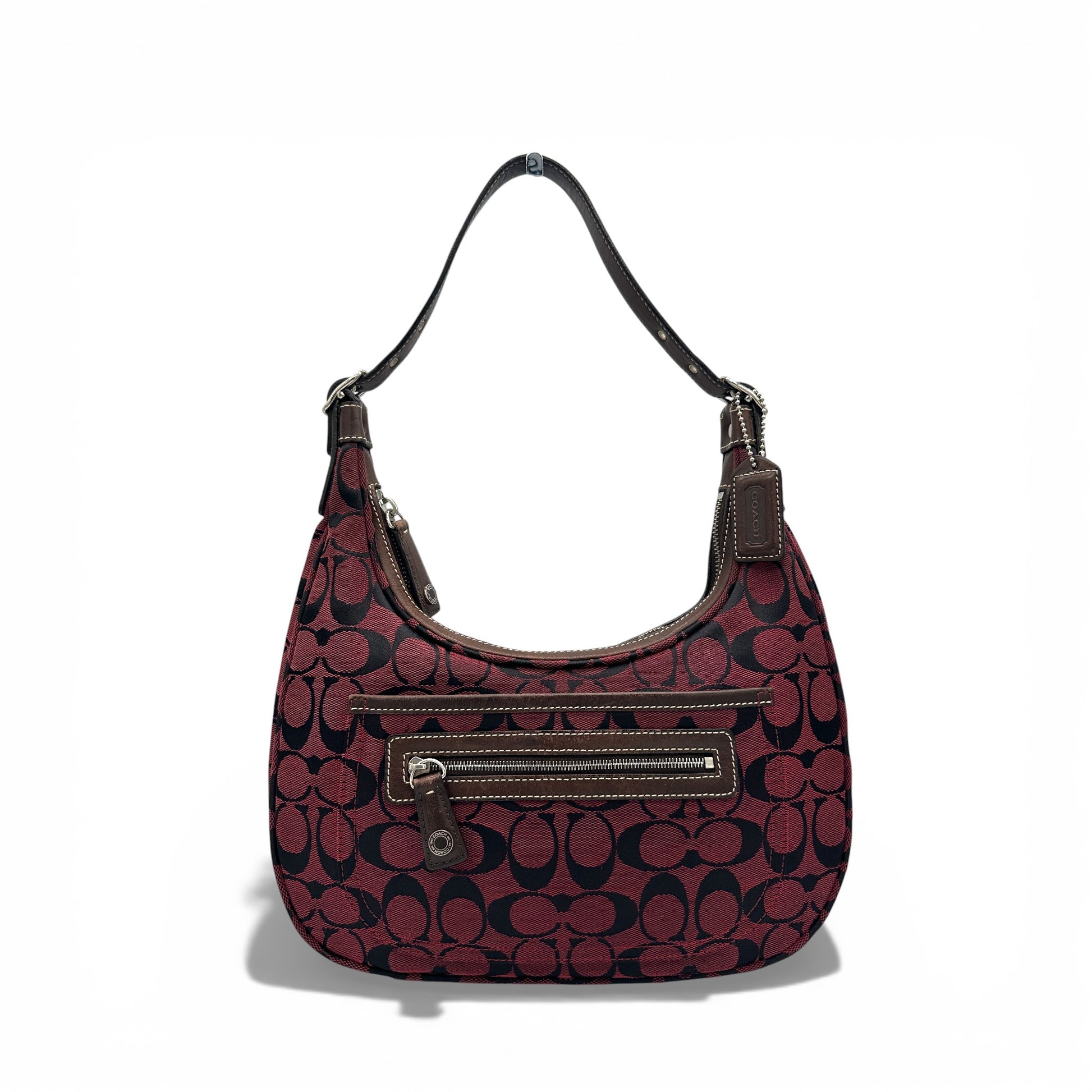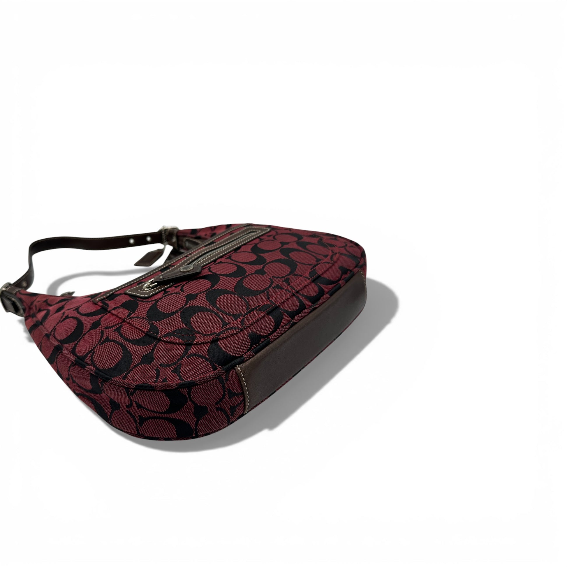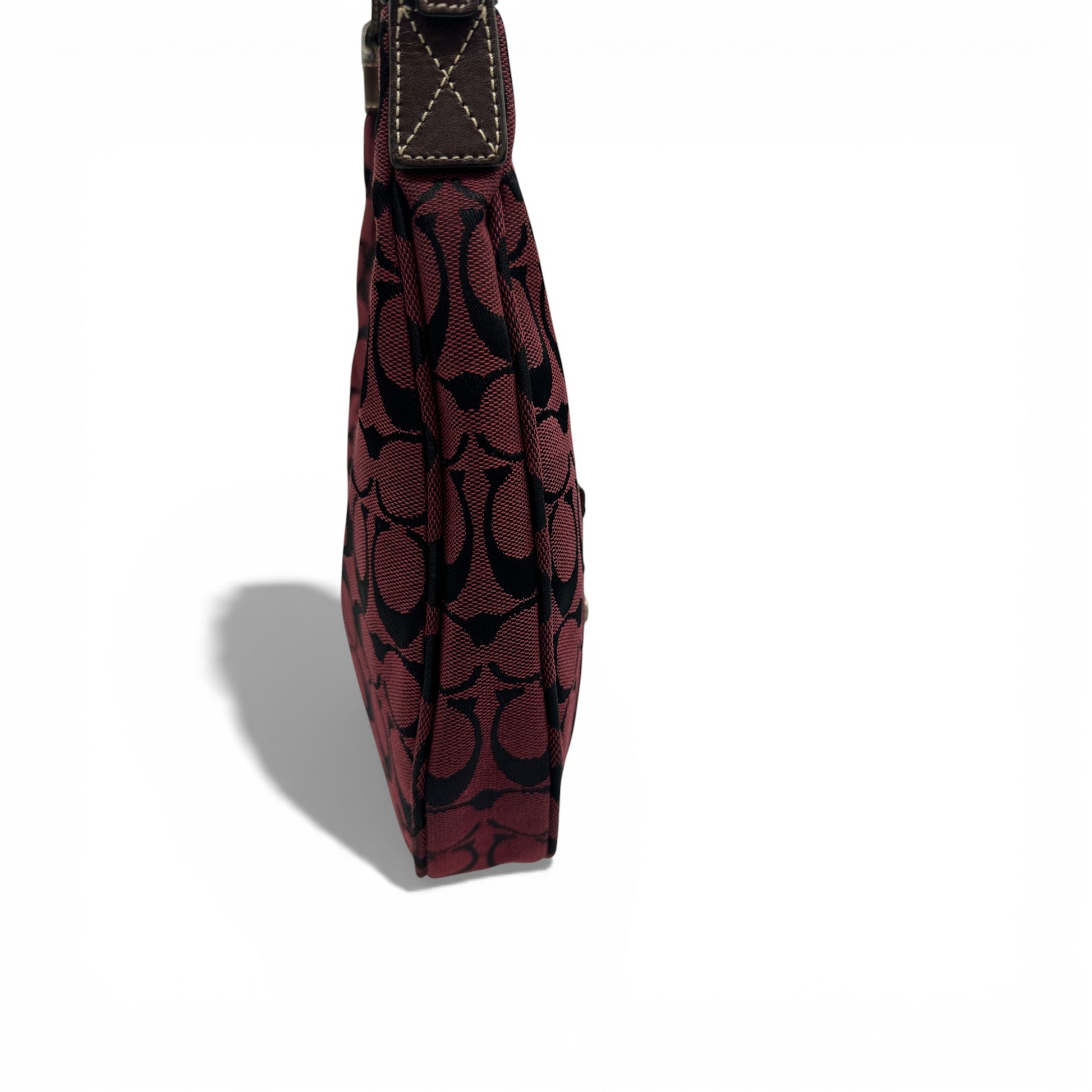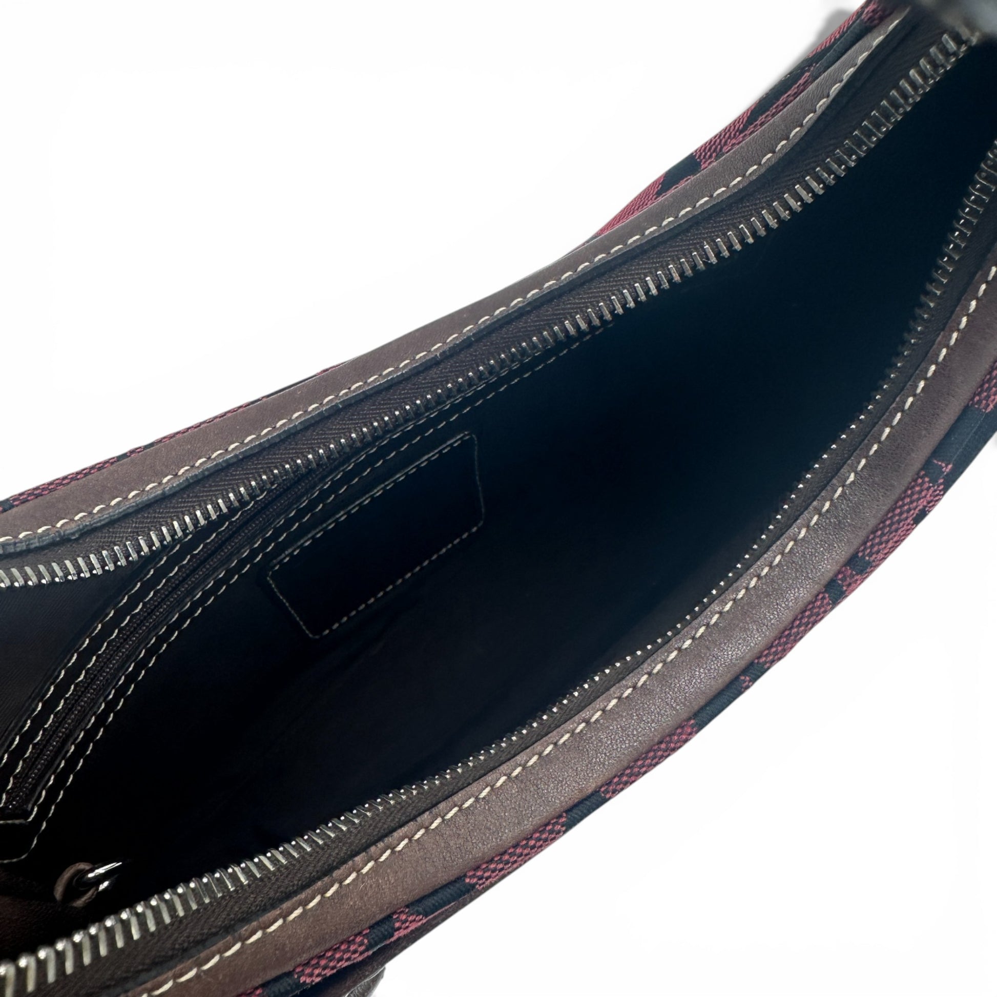 Vintage Coach 6045 Schultertasche in Halbmondform. In Burgunderrot und Schwarz mit charakteristischem Monogramm und dunkelbraunem Lederbesatz. Ein Y2K-Modell aus dem Jahr 2002.