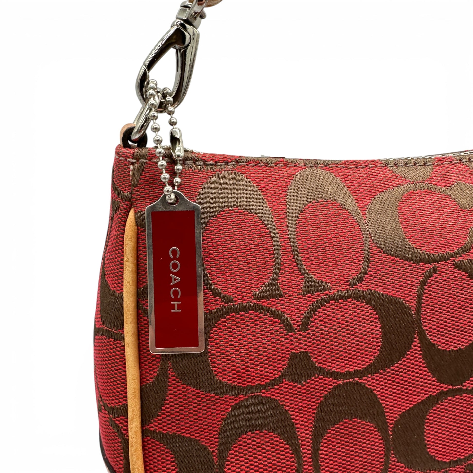 Vintage Coach 6094 Demi Mini Schultertasche in Rosa und Burgunderrot mit charakteristischem Monogramm und hellbraunem Lederbesatz. Ein Y2K-Stück aus dem Jahr 2002.