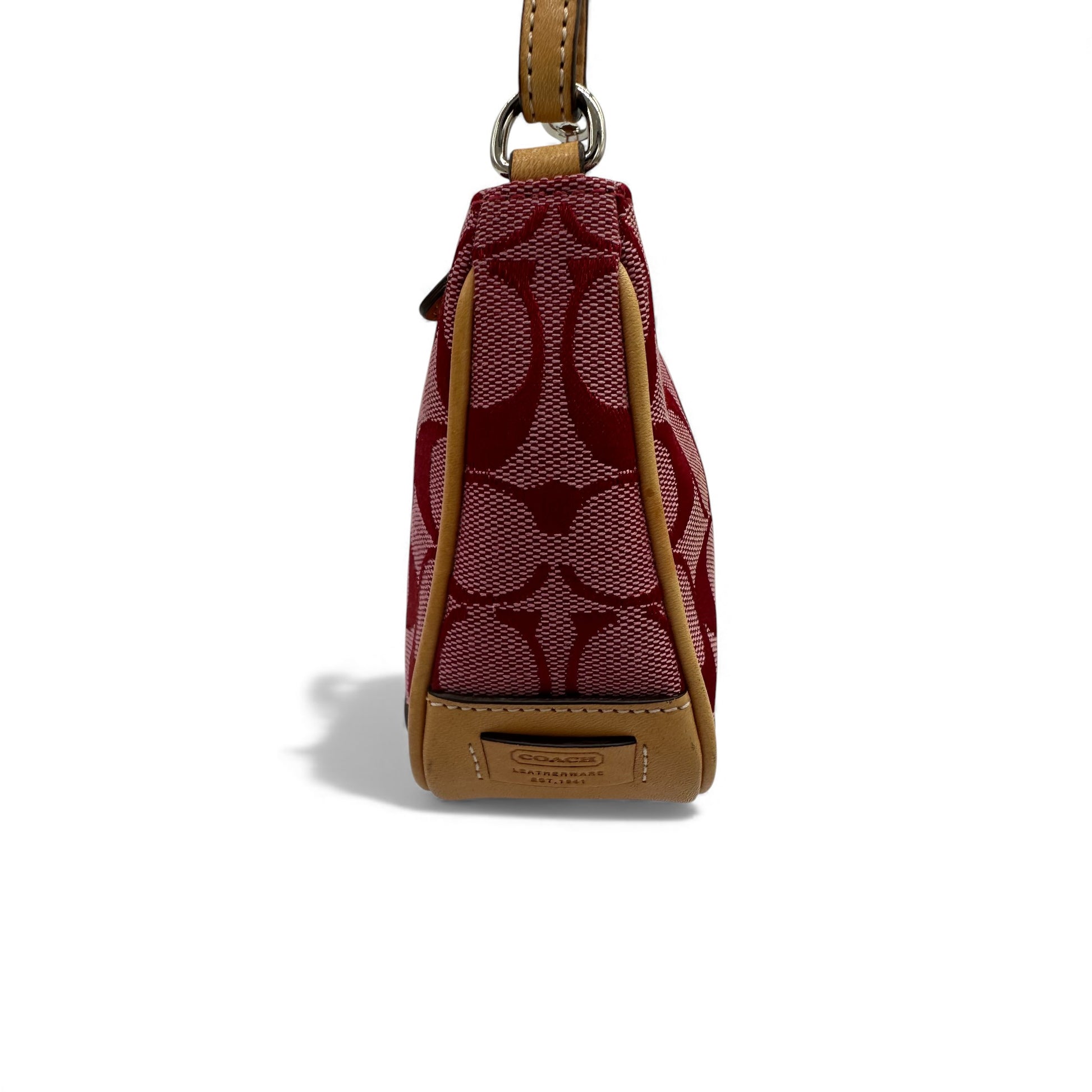Vintage Coach 6094 Demi Mini Schultertasche in Rosa und Burgunderrot mit charakteristischem Monogramm und hellbraunem Lederbesatz. Ein Y2K-Stück aus dem Jahr 2002.