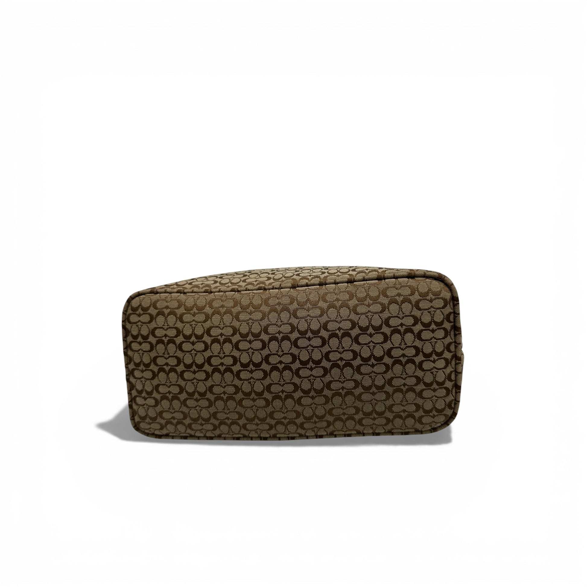 Vintage Coach 6332 Schultertasche. In Braun und Beige mit dem charakteristischen Monogramm, mit hellbraunem Lederbesatz. Mit silberfarbenen Schnallen und Reißverschlussfach vorne. Ein Y2K-Modell aus dem Jahr 2002.