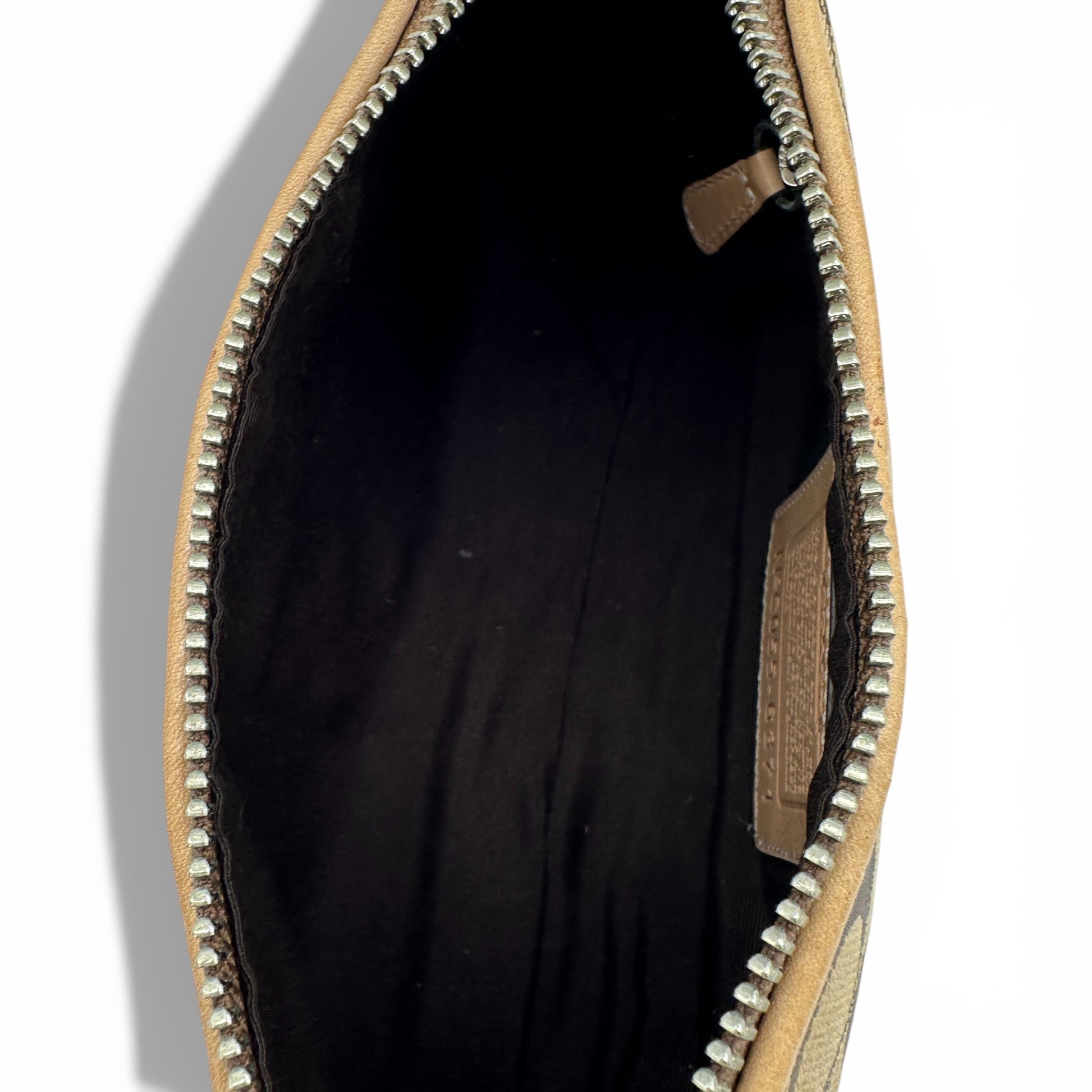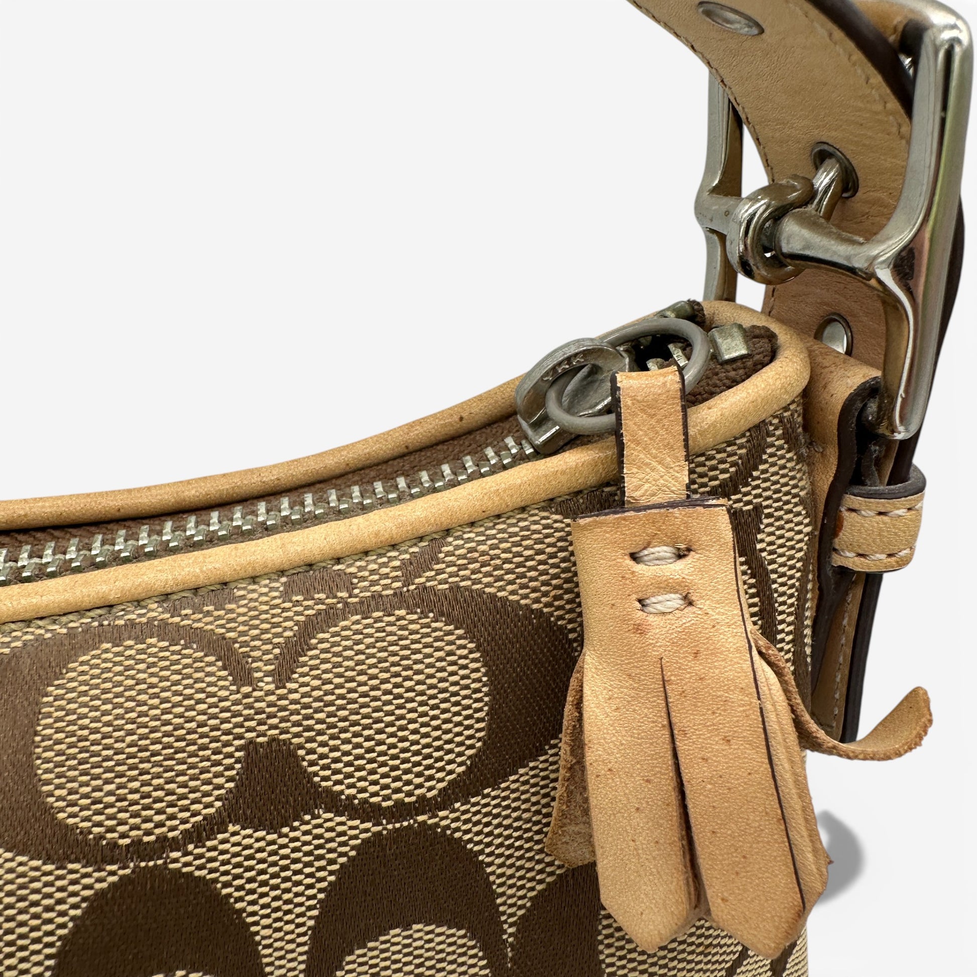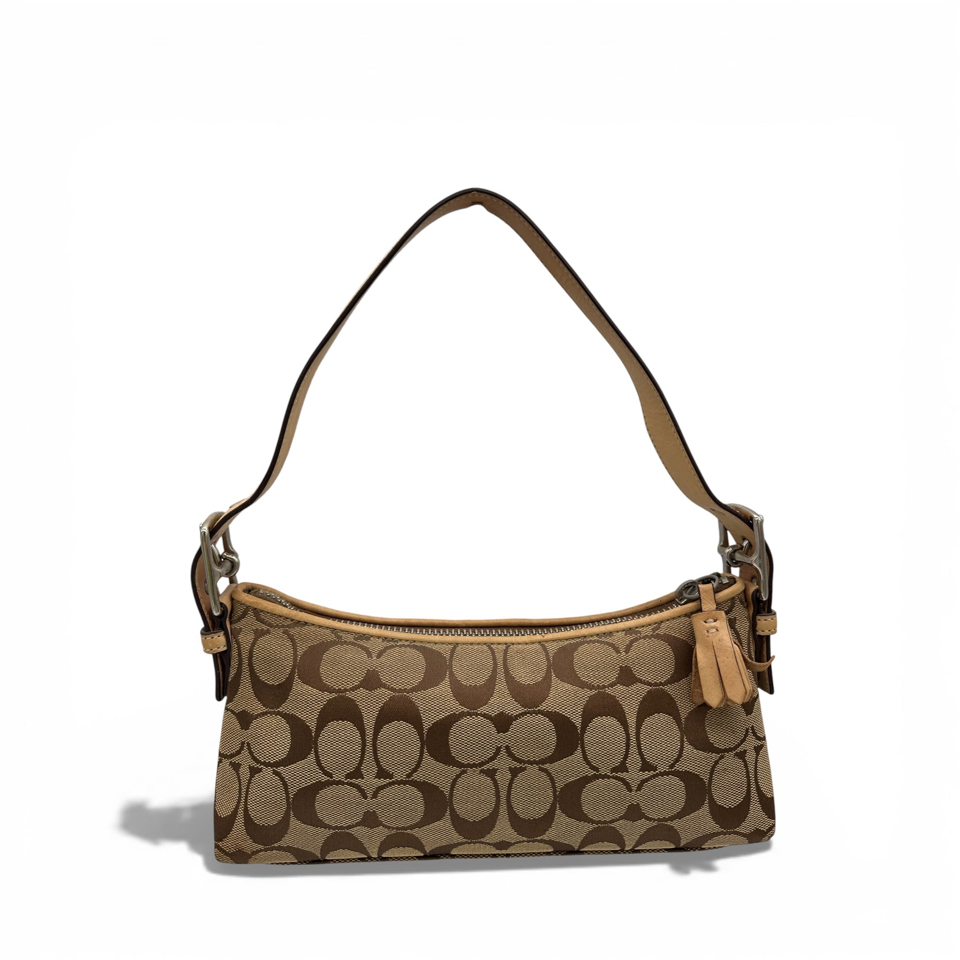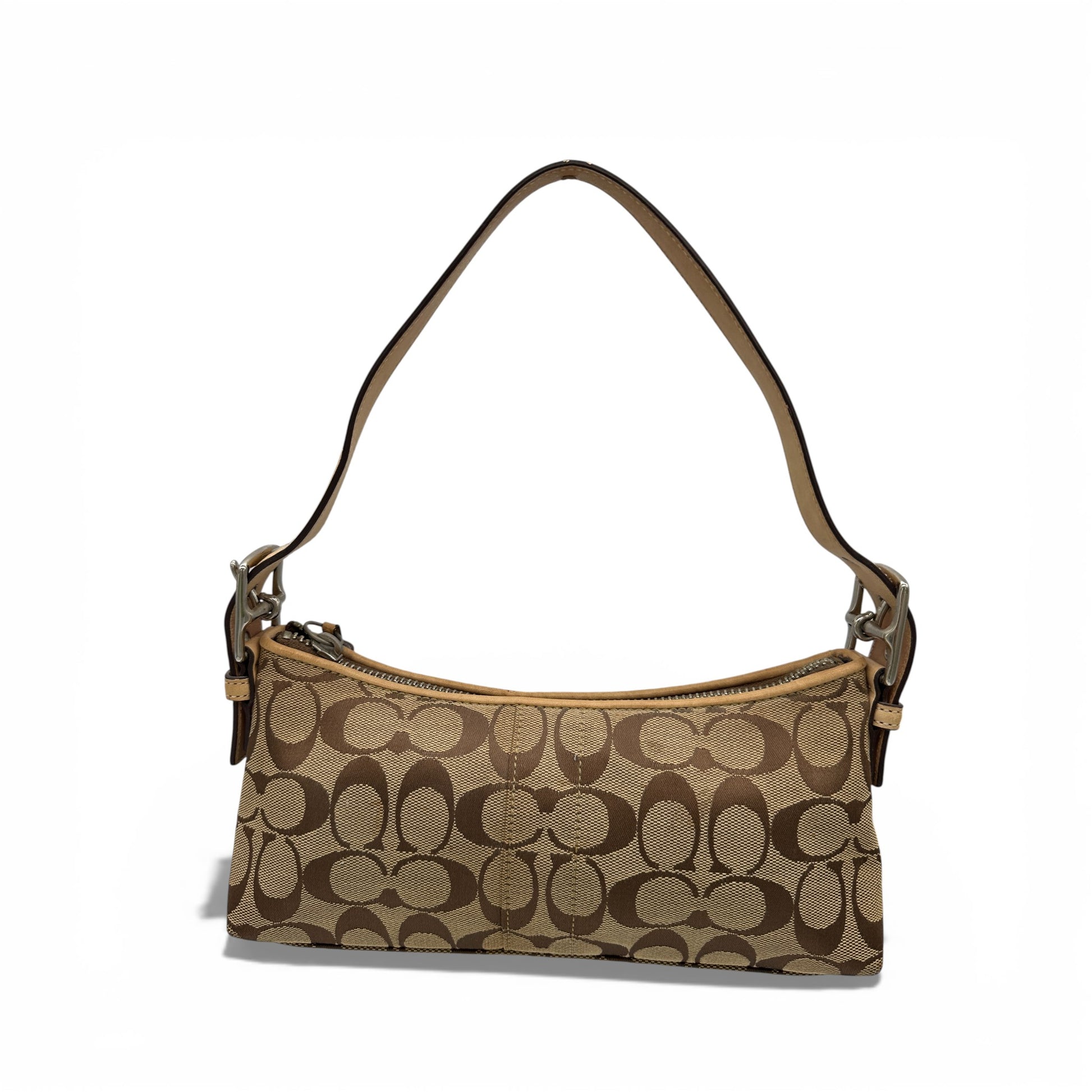 Vintage Coach 6371 Baguette Schultertasche. In Braun und Beige mit dem charakteristischen Monogramm, verziert mit braunem Leder und silberfarbenen Beschlägen. Ein ikonisches Y2K-Modell aus dem Jahr 2004.