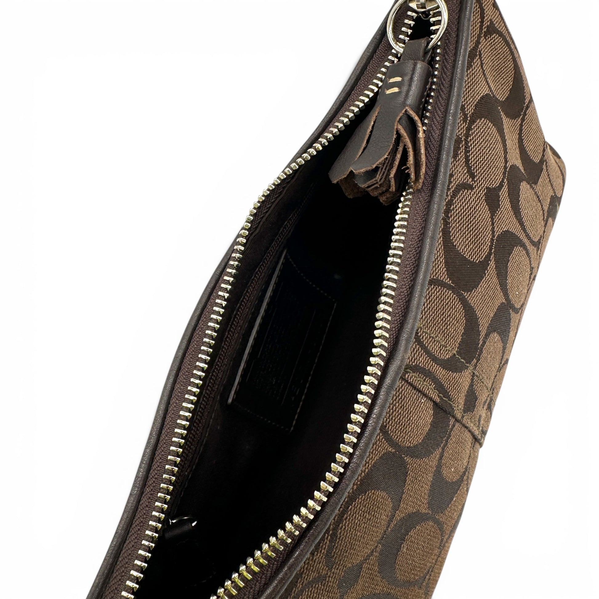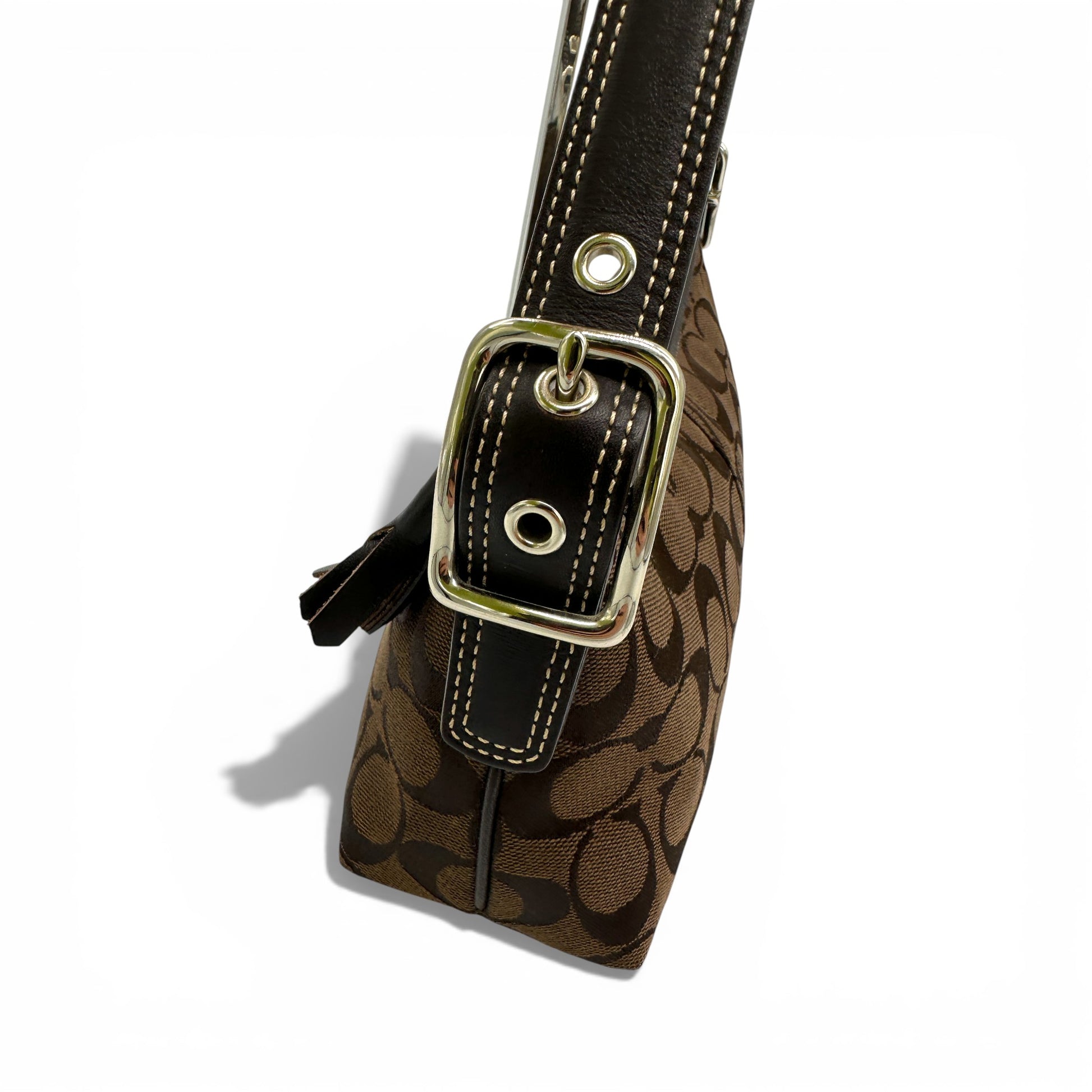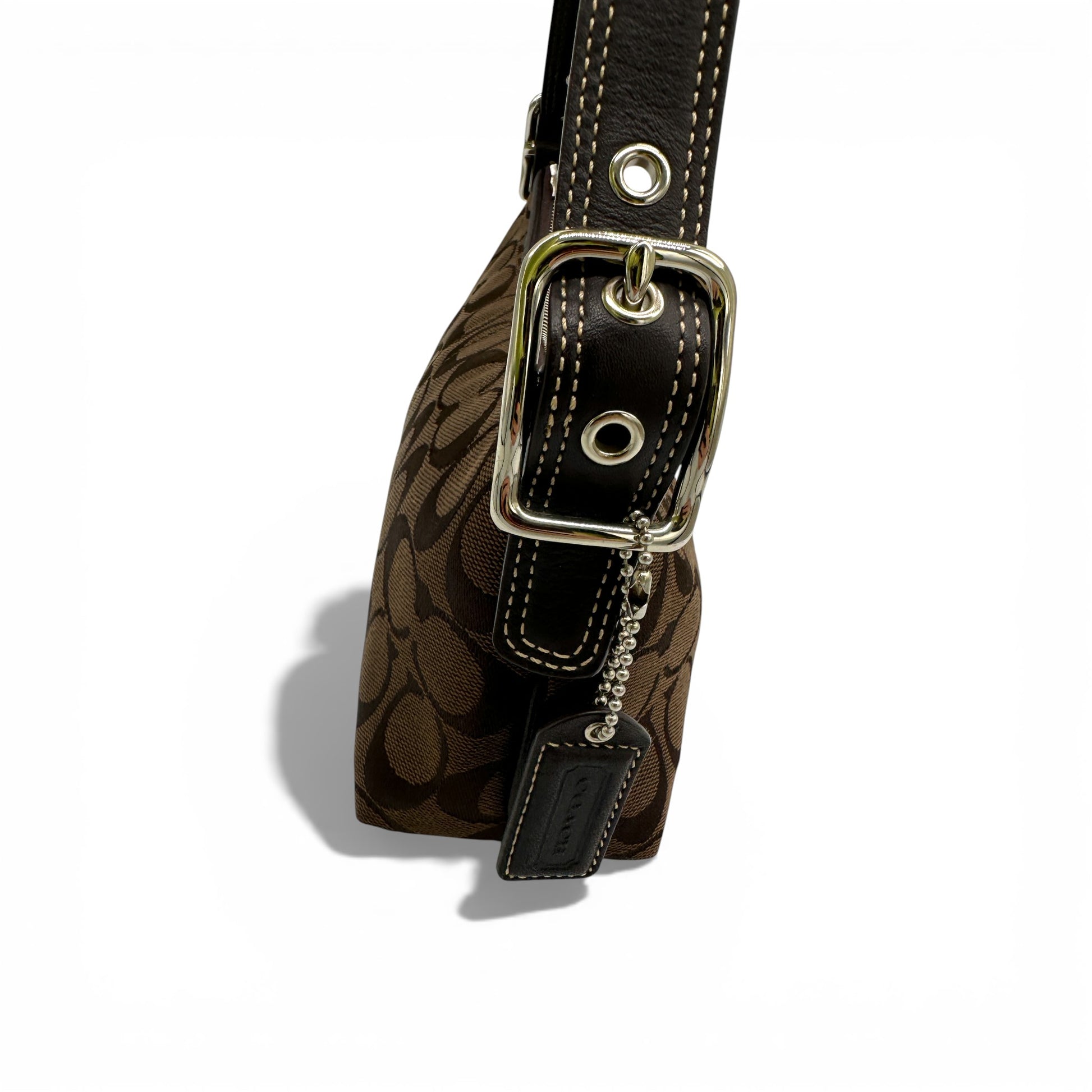 Vintage Coach 8K01 East West Baguette Schultertasche in seltenem schokoladenbraunem Monogram-Muster mit braunem Lederbesatz und silberfarbenen Beschlägen. Eine begehrte Coach-Tasche im Baguette-Stil aus dem Jahr 2005.