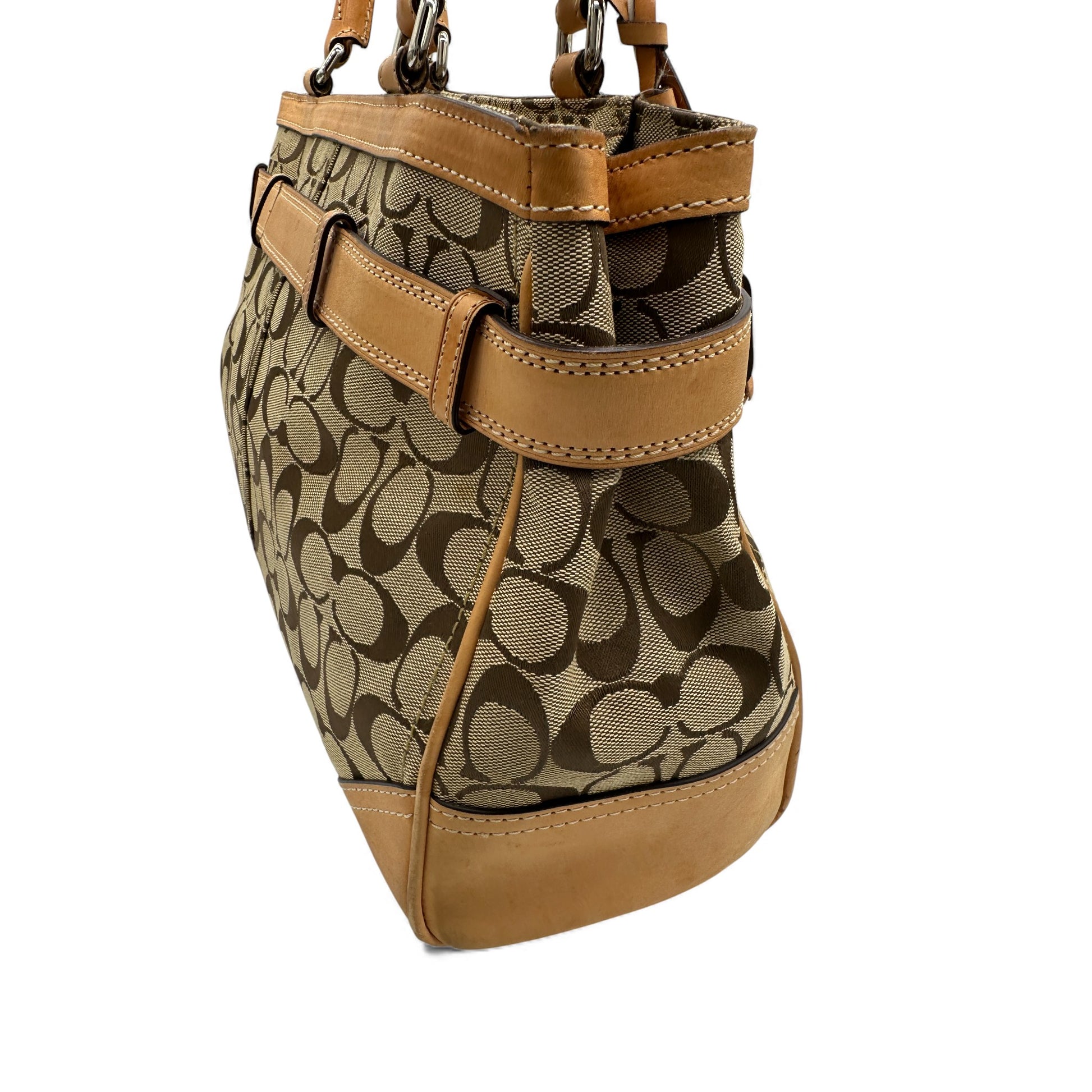 Vintage Coach F08K07 Hamptons Clip Tote Handtasche. Beige mit charakteristischem Monogramm, silberfarbenem Horsebit-Clip und hellbraunem Lederbesatz. Ein Y2K-Modell aus dem Jahr 2009.