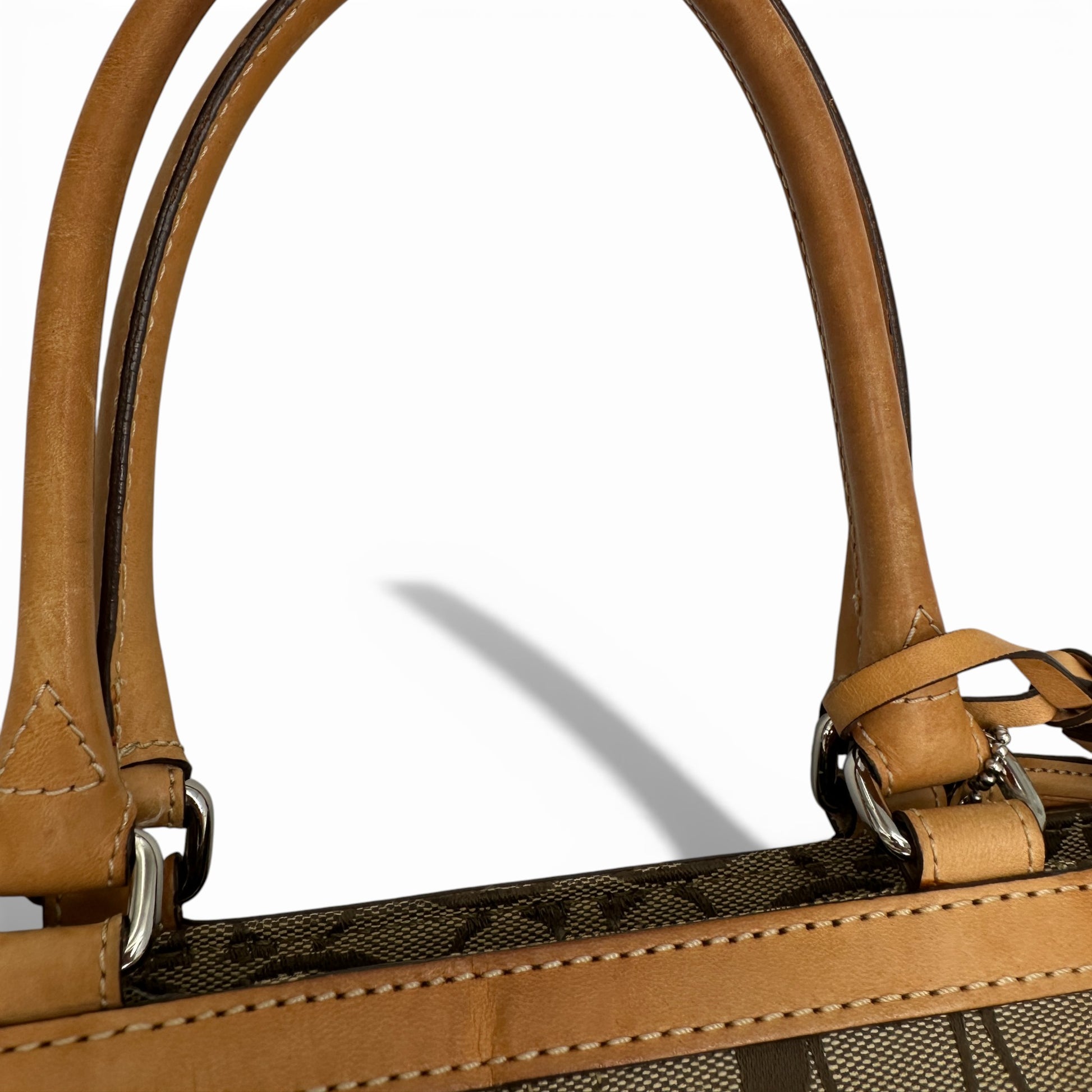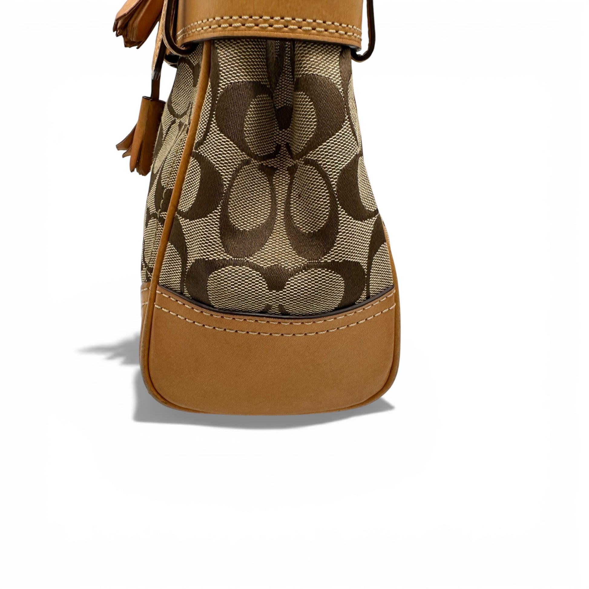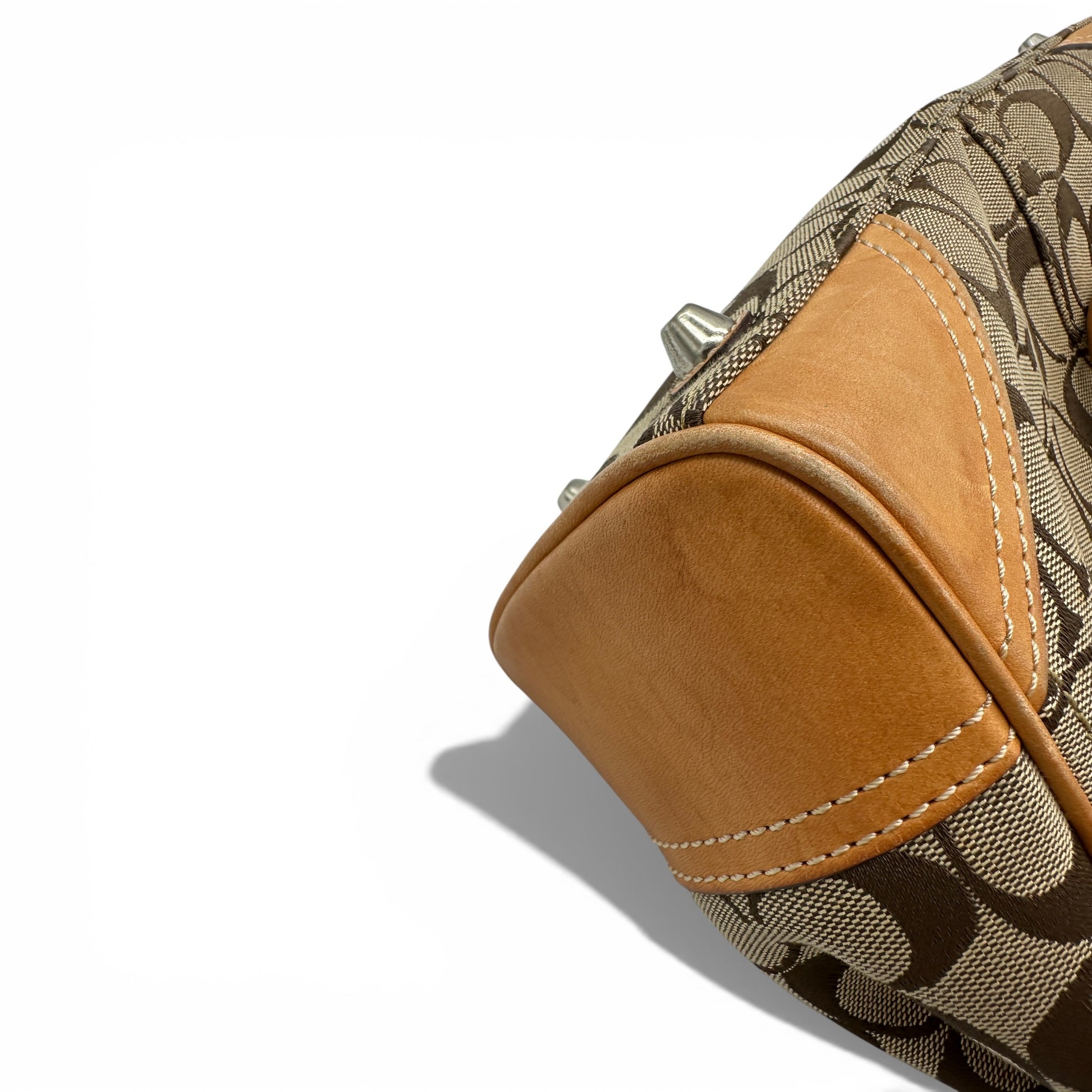 Vintage Coach FS8K06 Hampton Clip Handtasche. In Braun und Beige mit charakteristischem Monogramm, hellbraunen Lederdetails und silberfarbenem Trensenverschluss. Ein Y2K-Modell aus dem Jahr 2008.