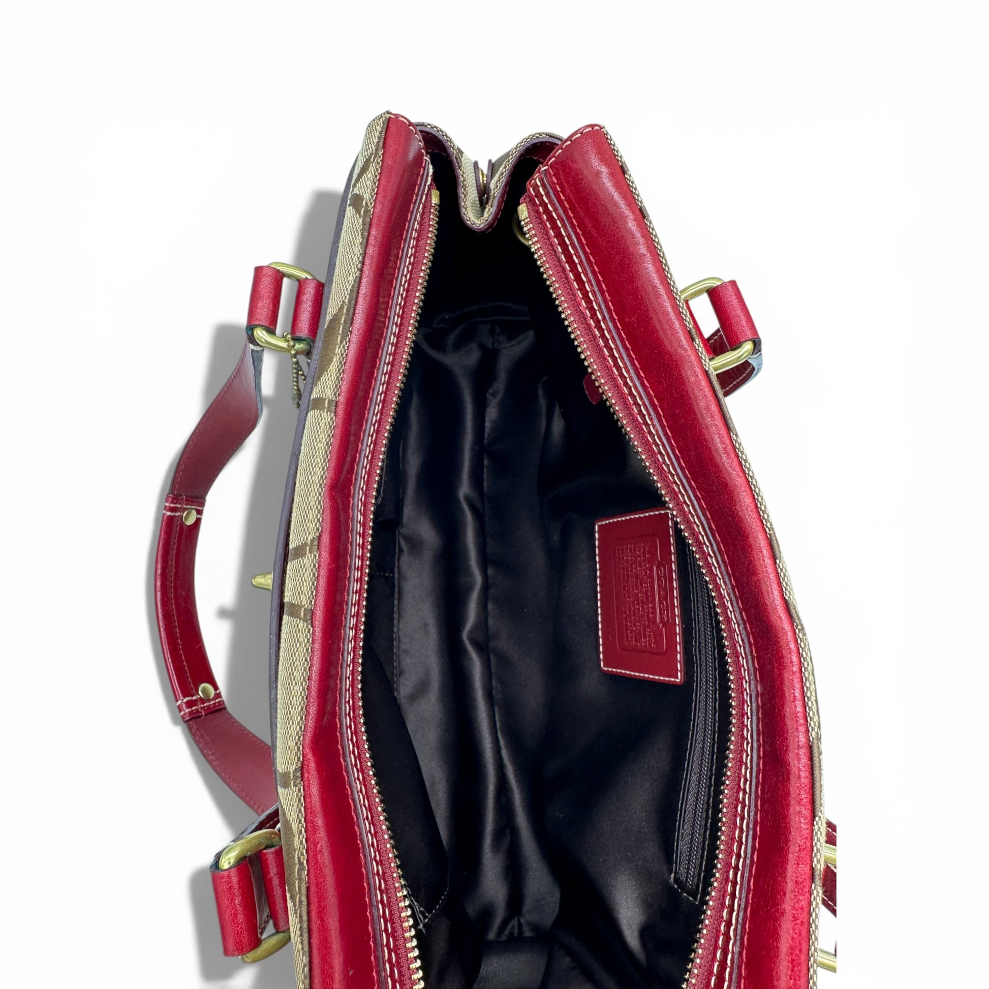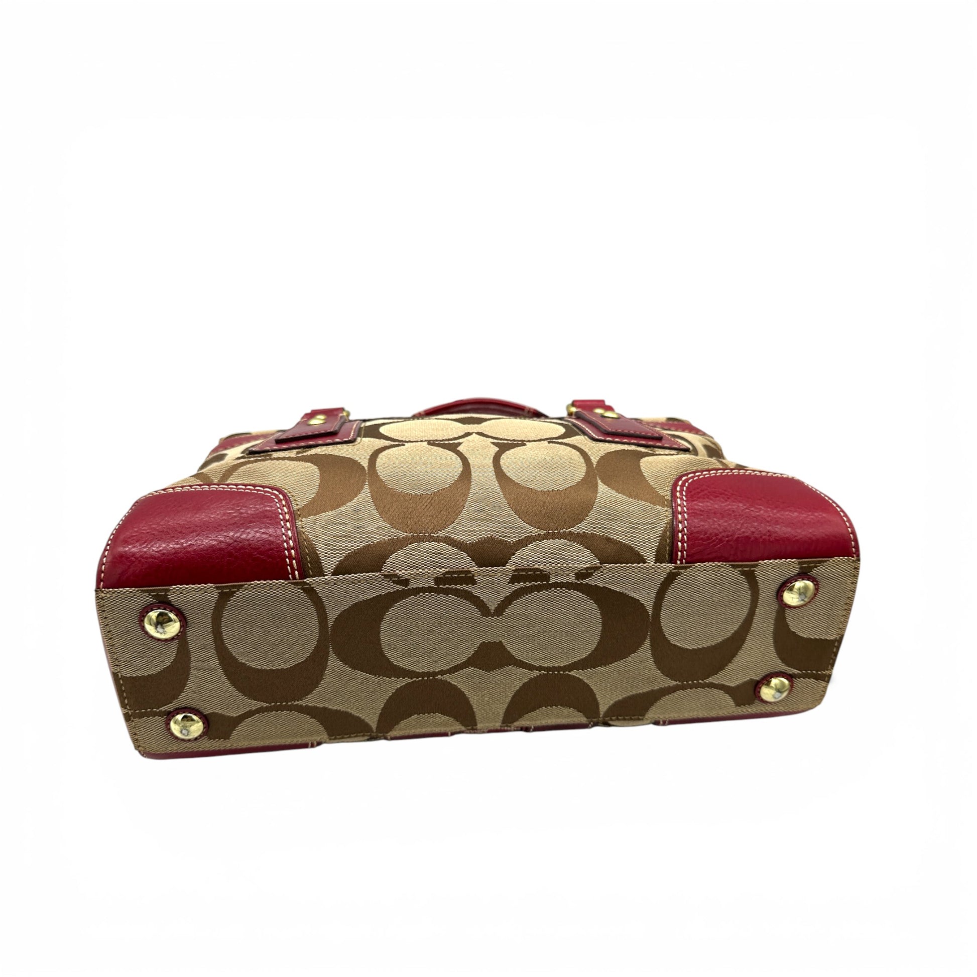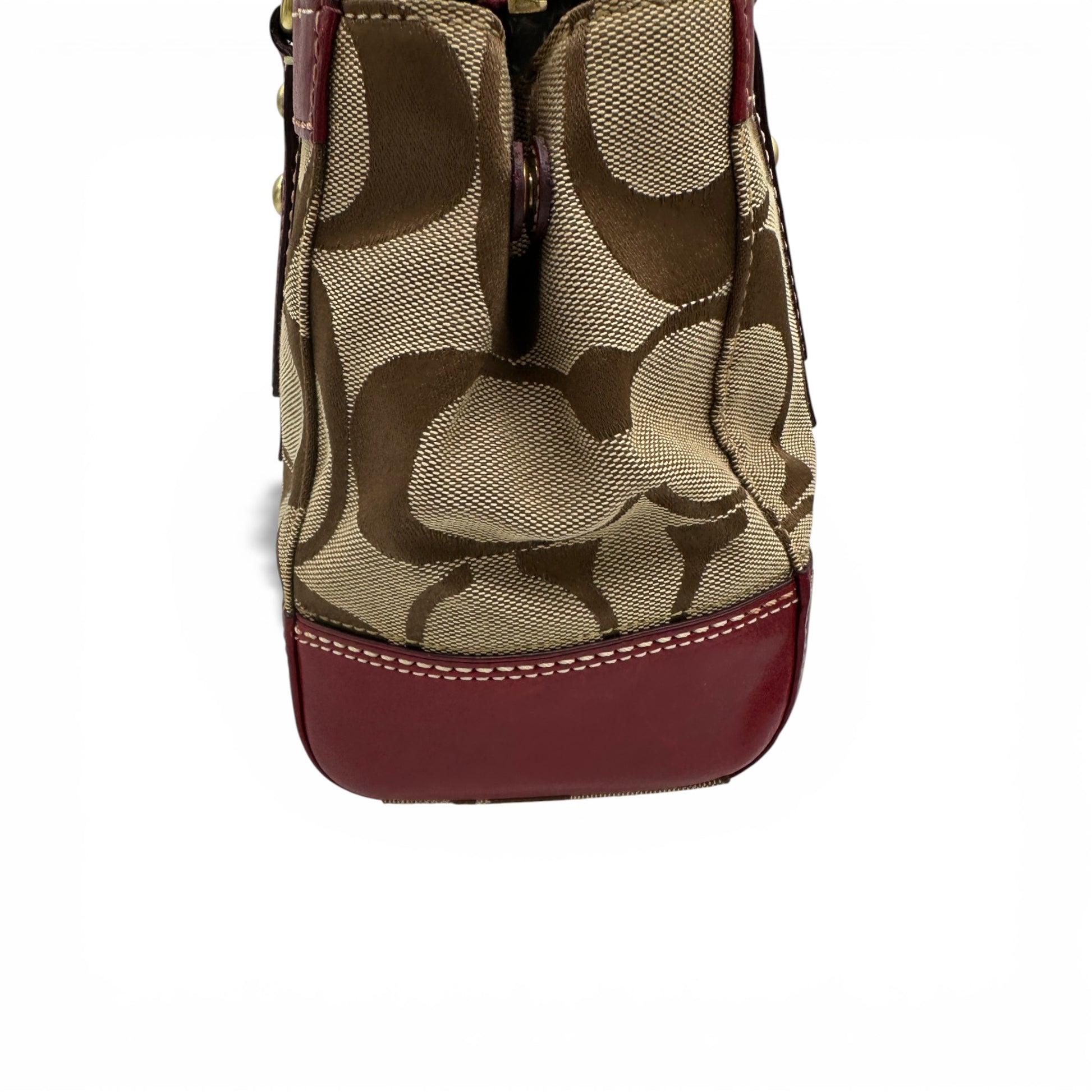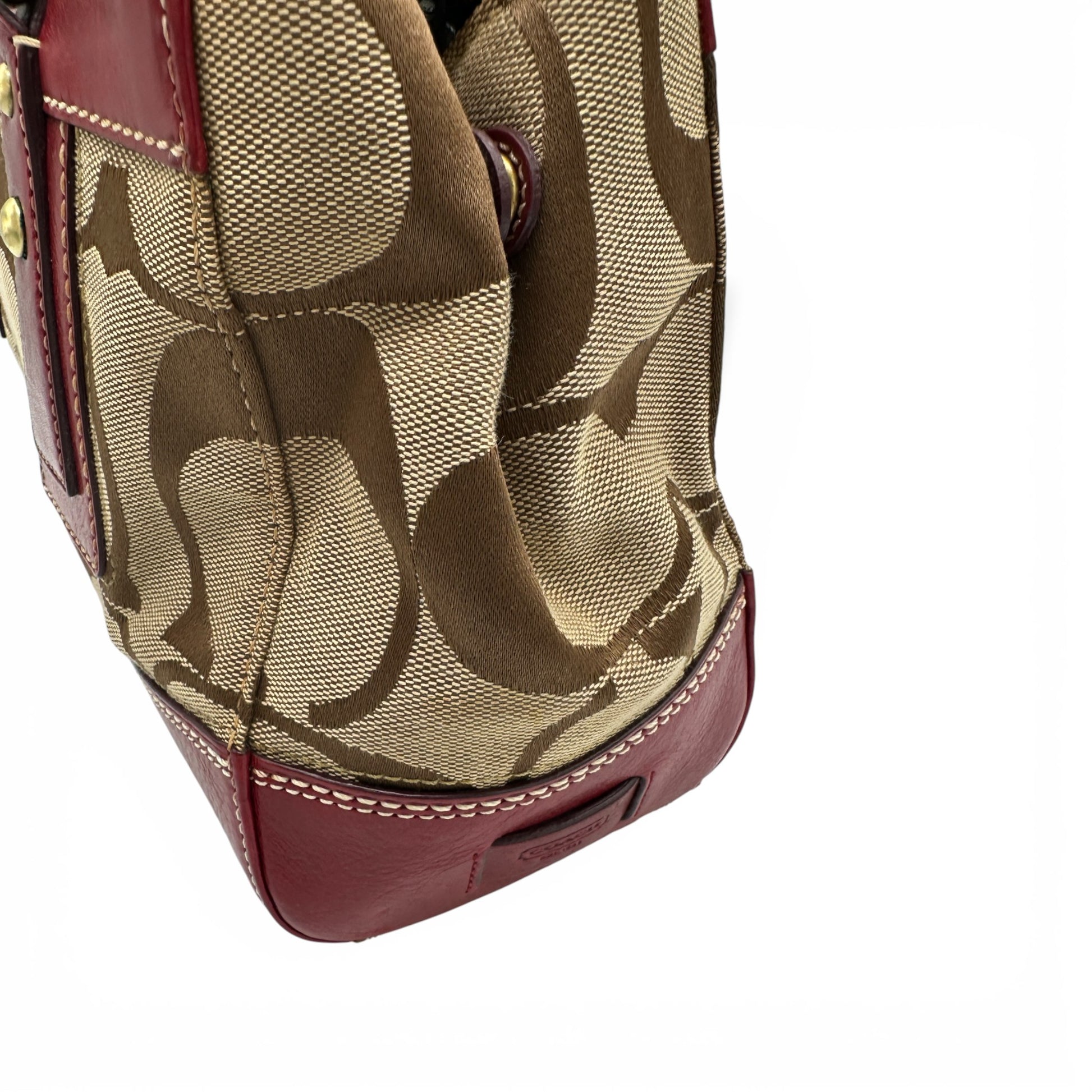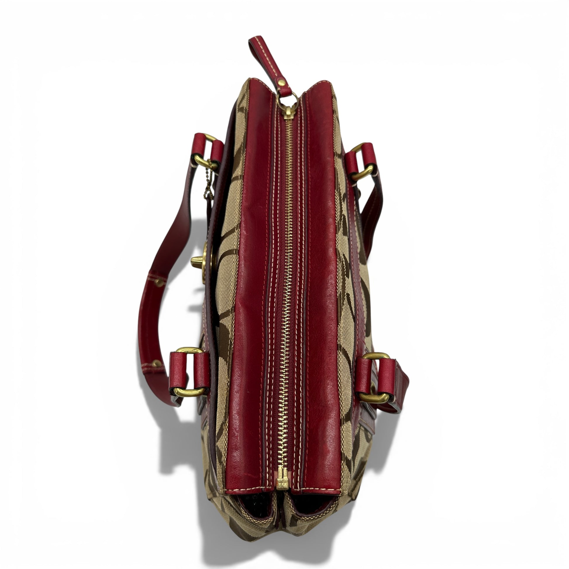 Vintage Coach 11071 Turnlock Monogram Handtasche. Aus braun-beigem charakteristischem Monogramm, verziert mit bordeauxrotem Leder und goldfarbenem Messing-Drehverschluss. Mit roten und weißen Monogramm-Akzenten.