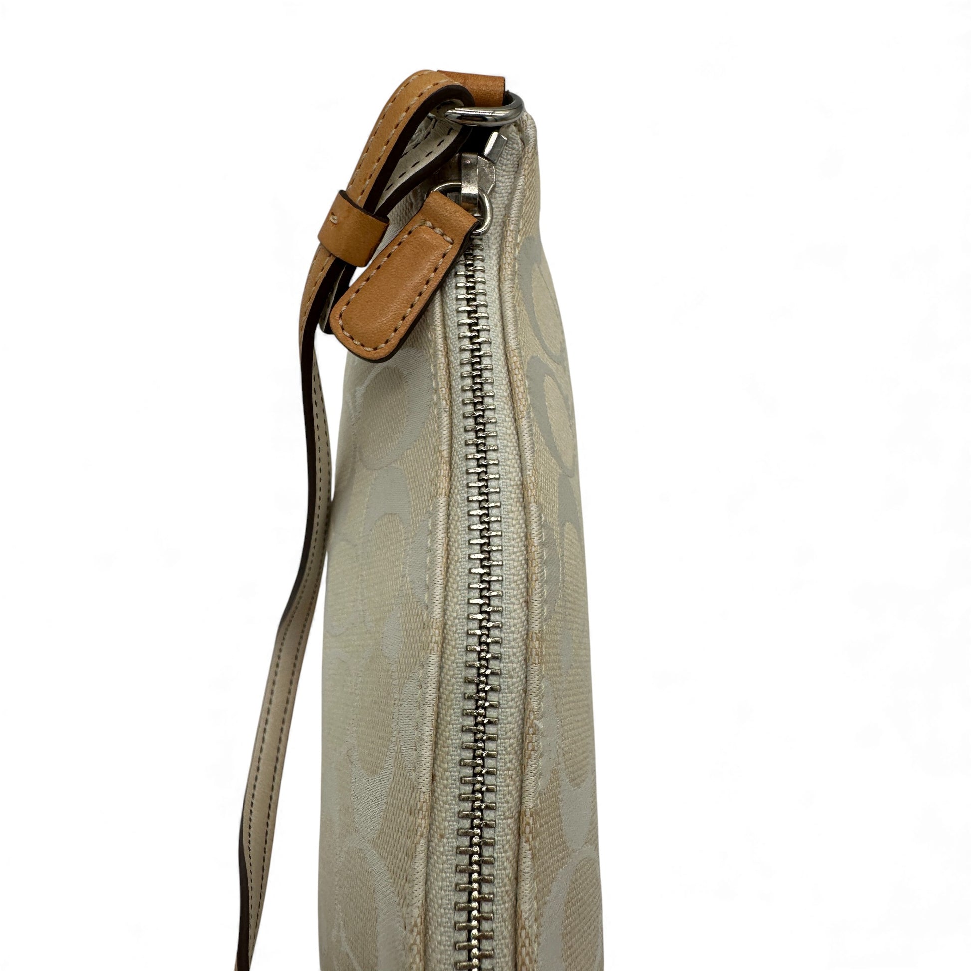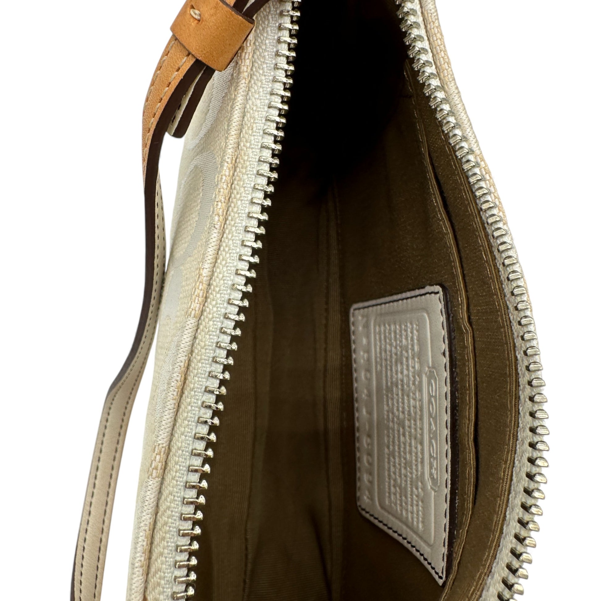 Vintage Coach 6094 Demi Mini Schultertasche. Weiß mit silbernem Coach-Monogramm und hellbraunem Lederbesatz. Ein Y2K-Modell aus dem Jahr 2004.