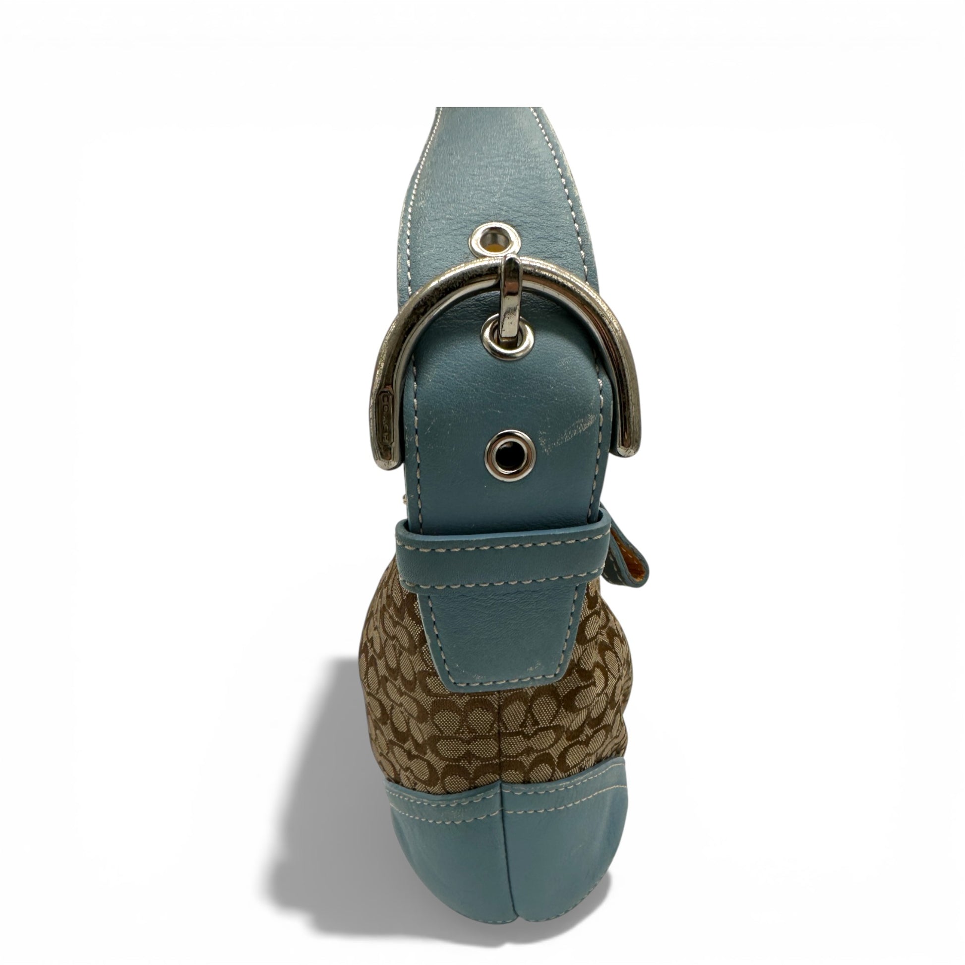 Vintage Coach 6351 Croissant Schultertasche in Beige mit Mini-Monogramm, hellblauen Lederdetails und silberfarbenen Soho-Schnallen. Ein Y2K-Modell aus dem Jahr 2003.