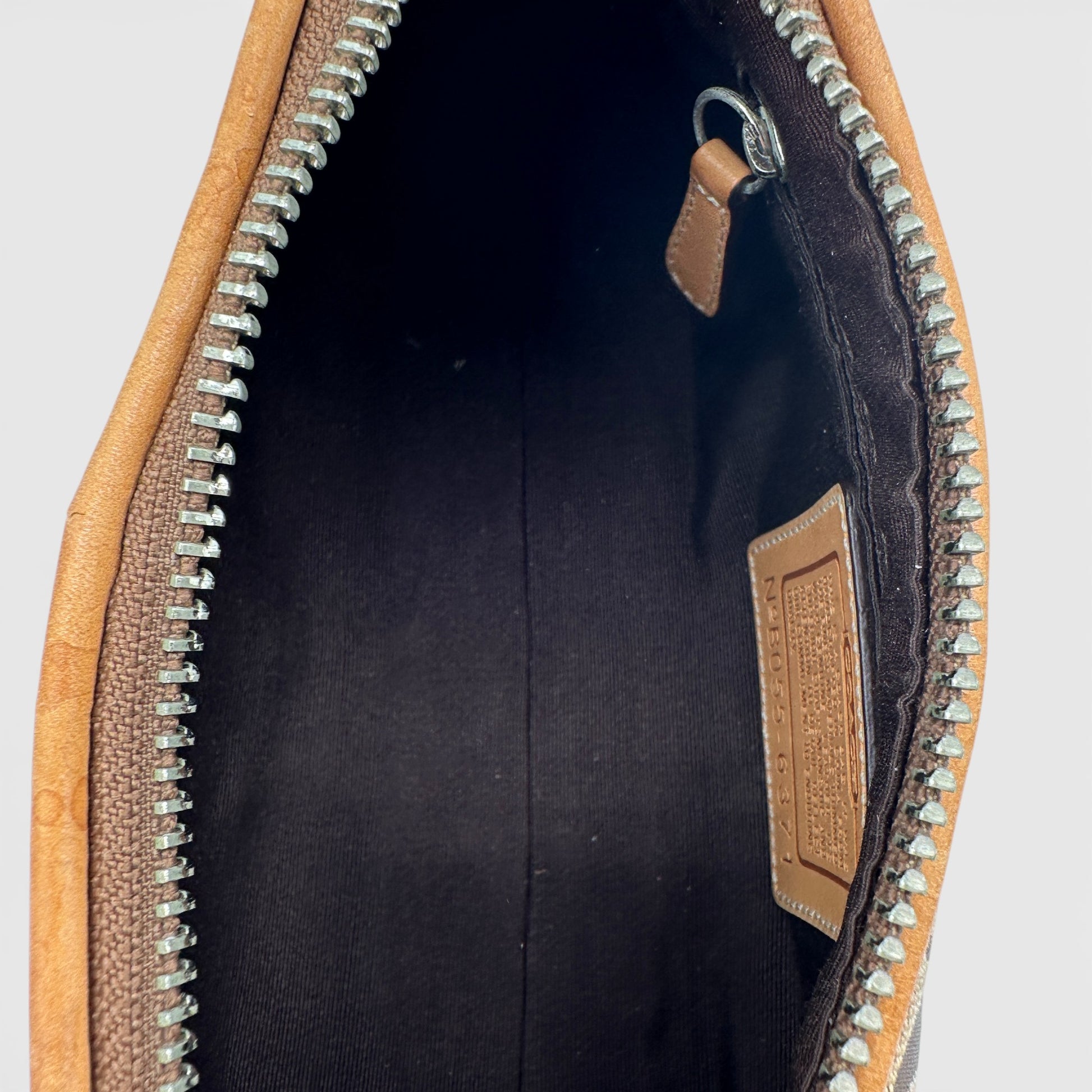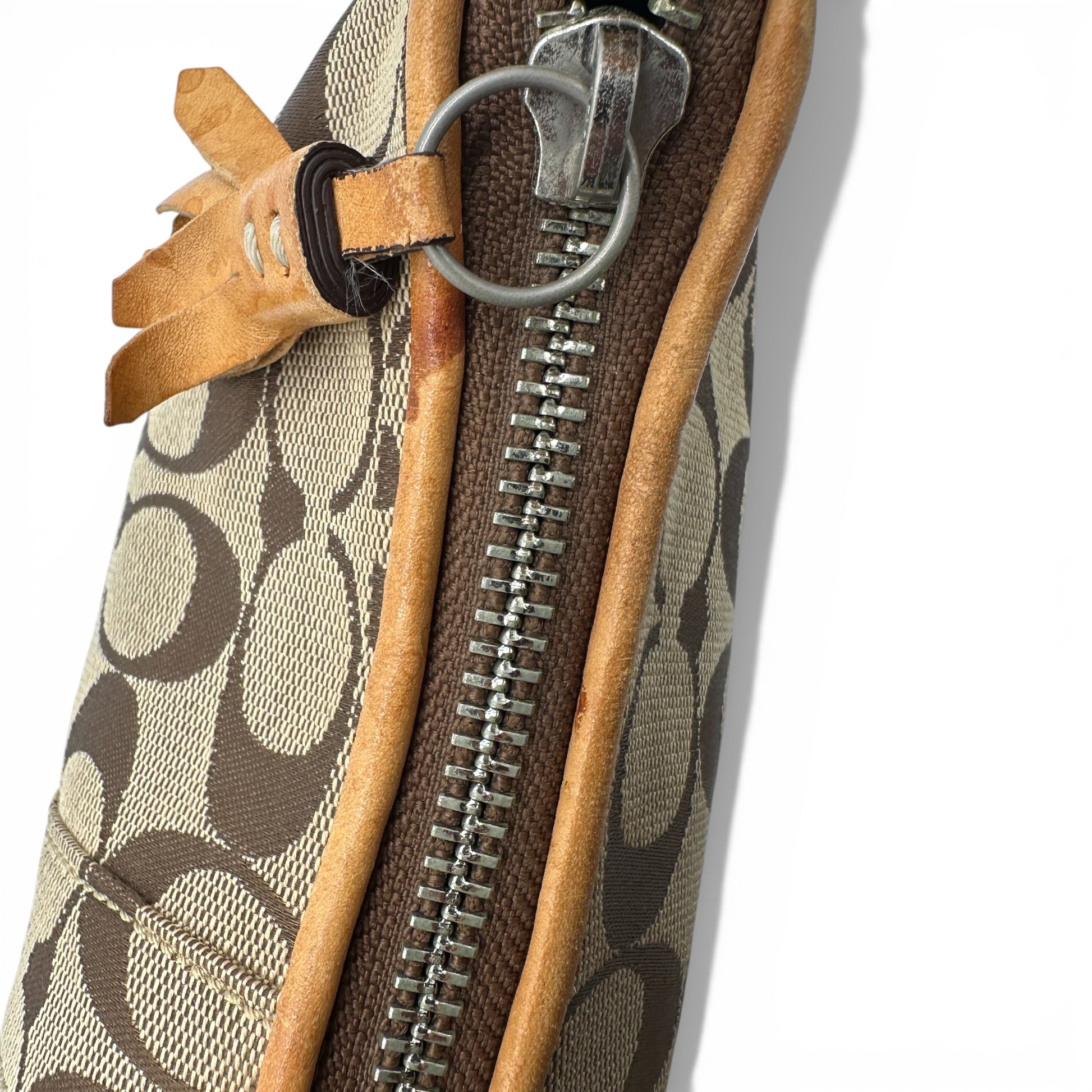Vintage Coach 6371 Baguette Schultertasche. In Braun und Beige mit dem charakteristischen Monogramm, verziert mit braunem Leder und silberfarbenen Beschlägen. Ein ikonisches Y2K-Modell aus dem Jahr 2004.