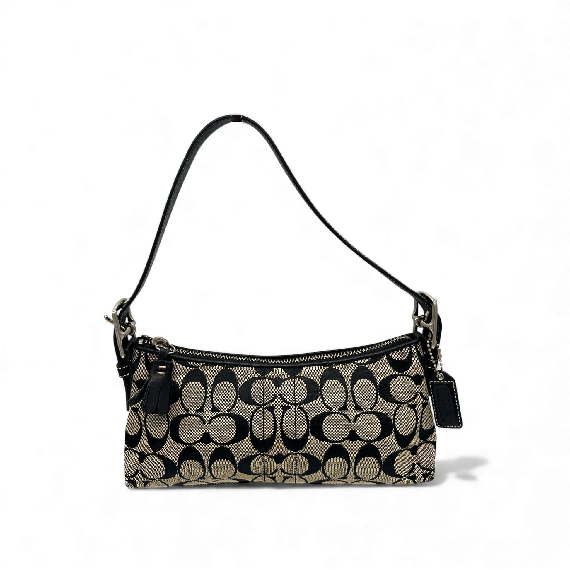 Vintage Coach East West Baguette Schultertasche in Schwarz und Grau mit charakteristischem Monogramm, verziert mit schwarzem Leder und silberfarbenen Beschlägen. Ein Y2K-Modell aus dem Jahr 2004.
