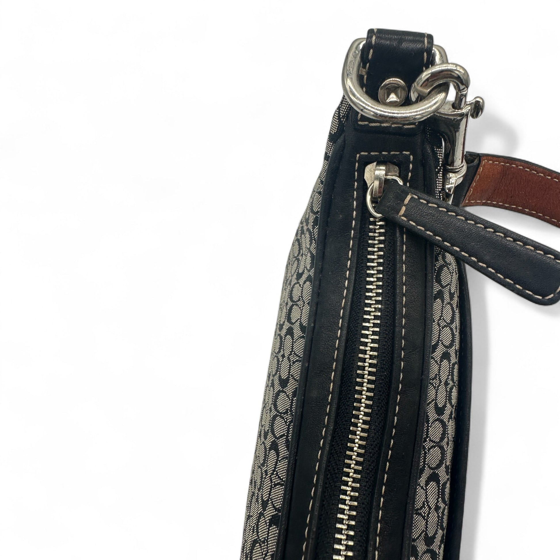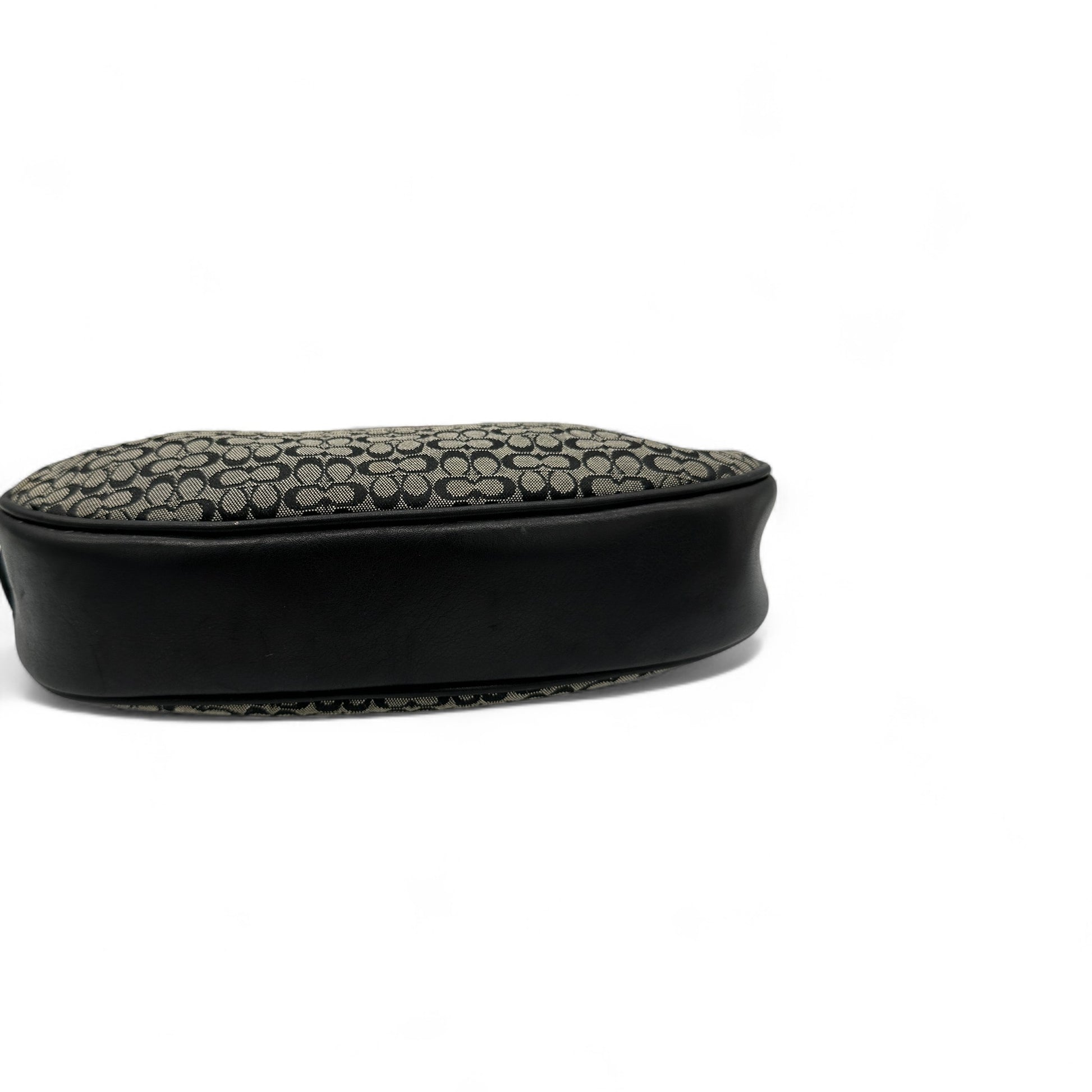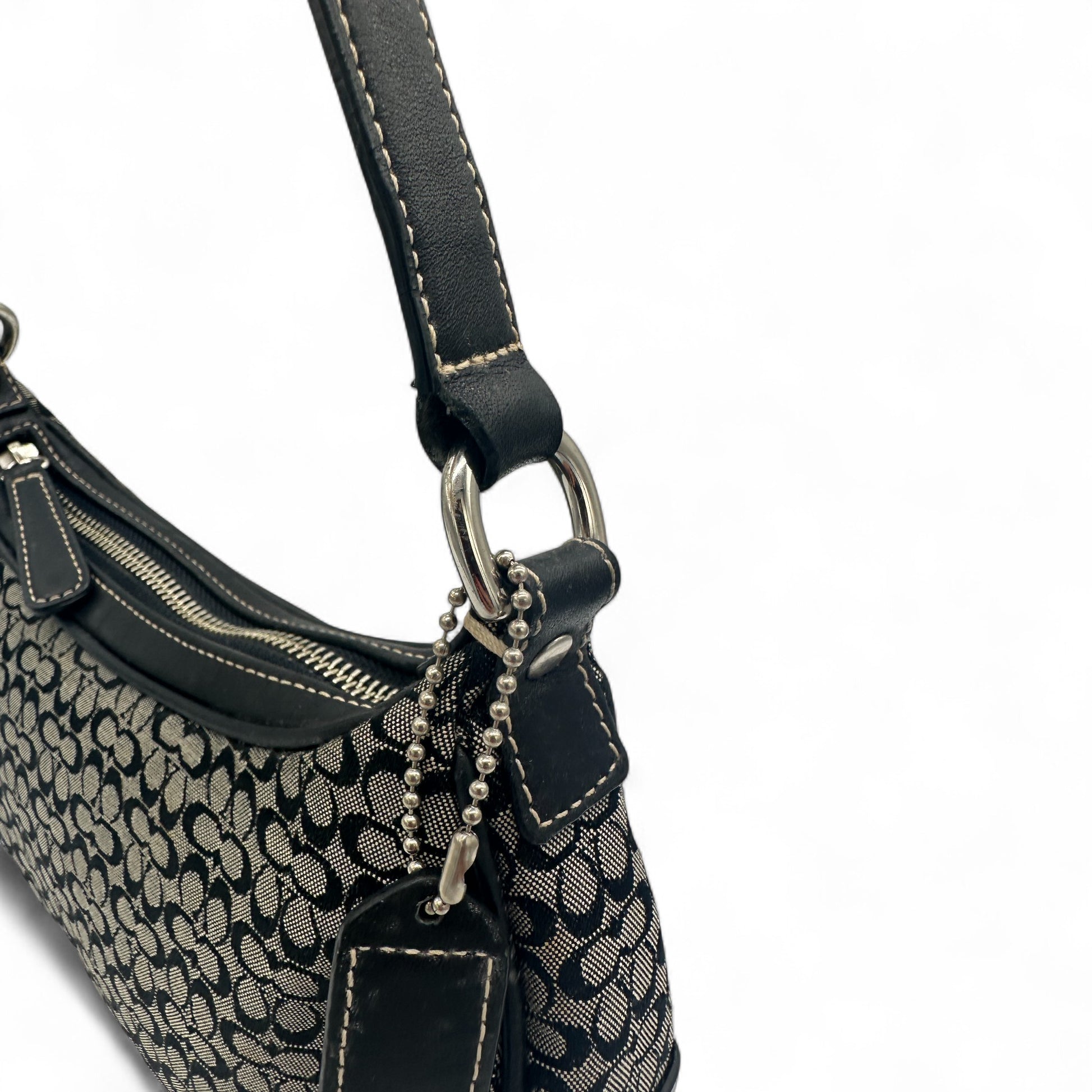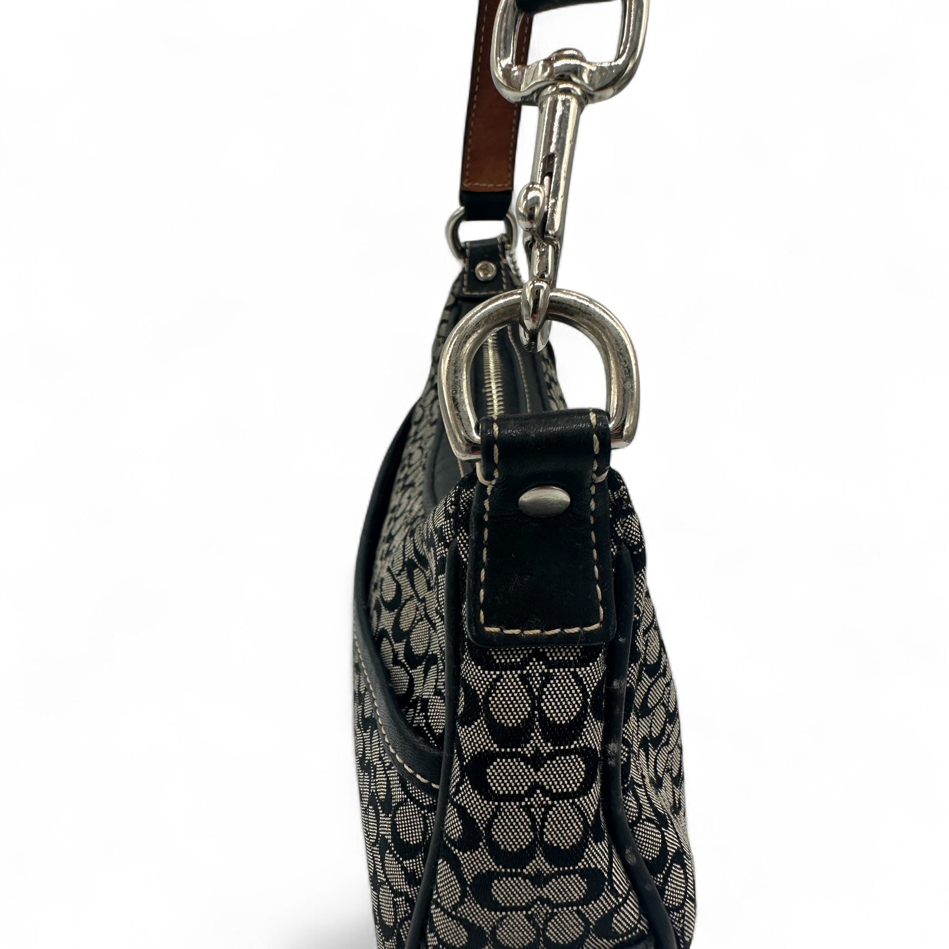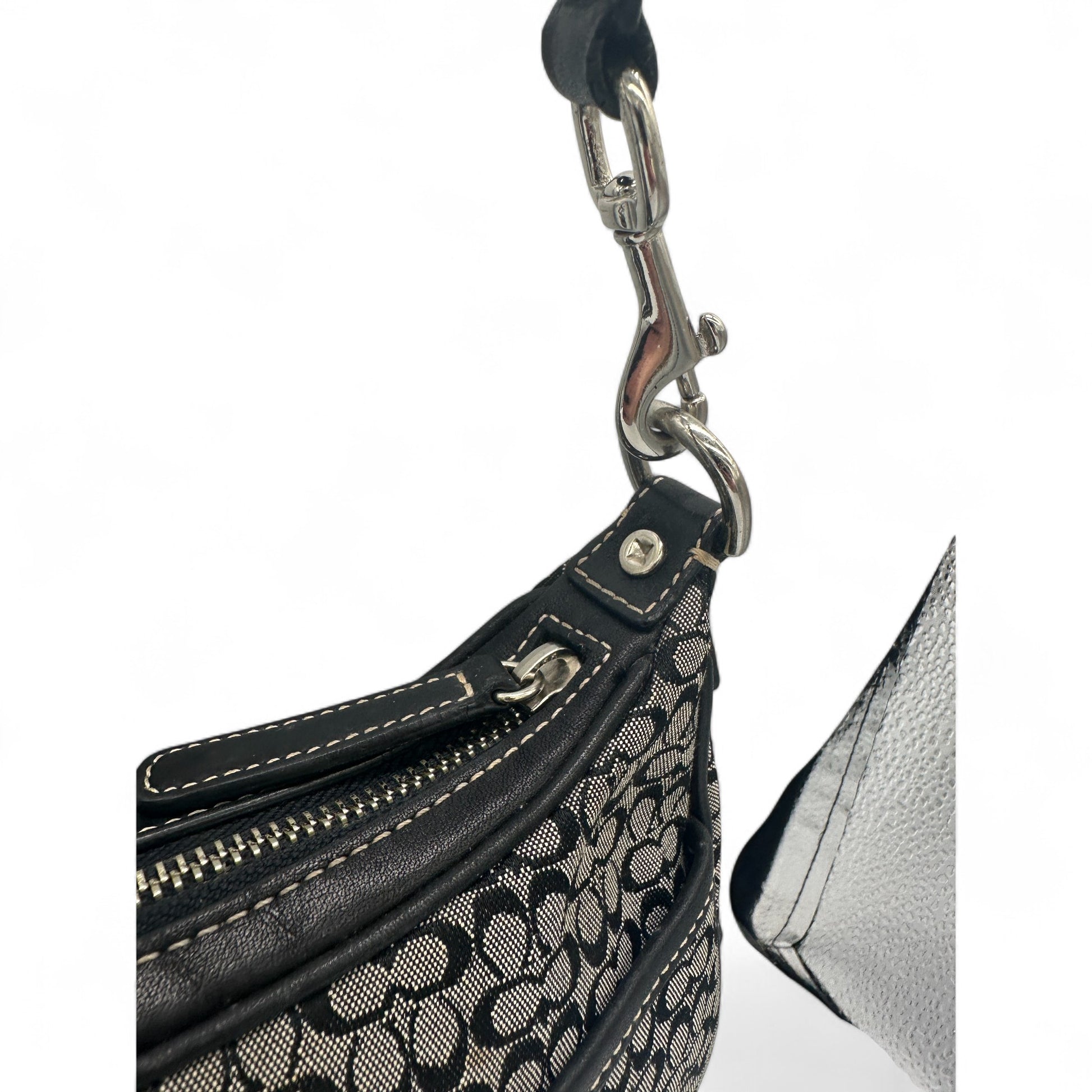 Modell und Stil: Vintage Coach 6623 Halbmondförmige Schultertasche in Schwarz und Grau mit Mini-Monogramm, schwarzem Lederbesatz und silberfarbenen Beschlägen. Ein Y2K-Stück aus dem Jahr 2002.