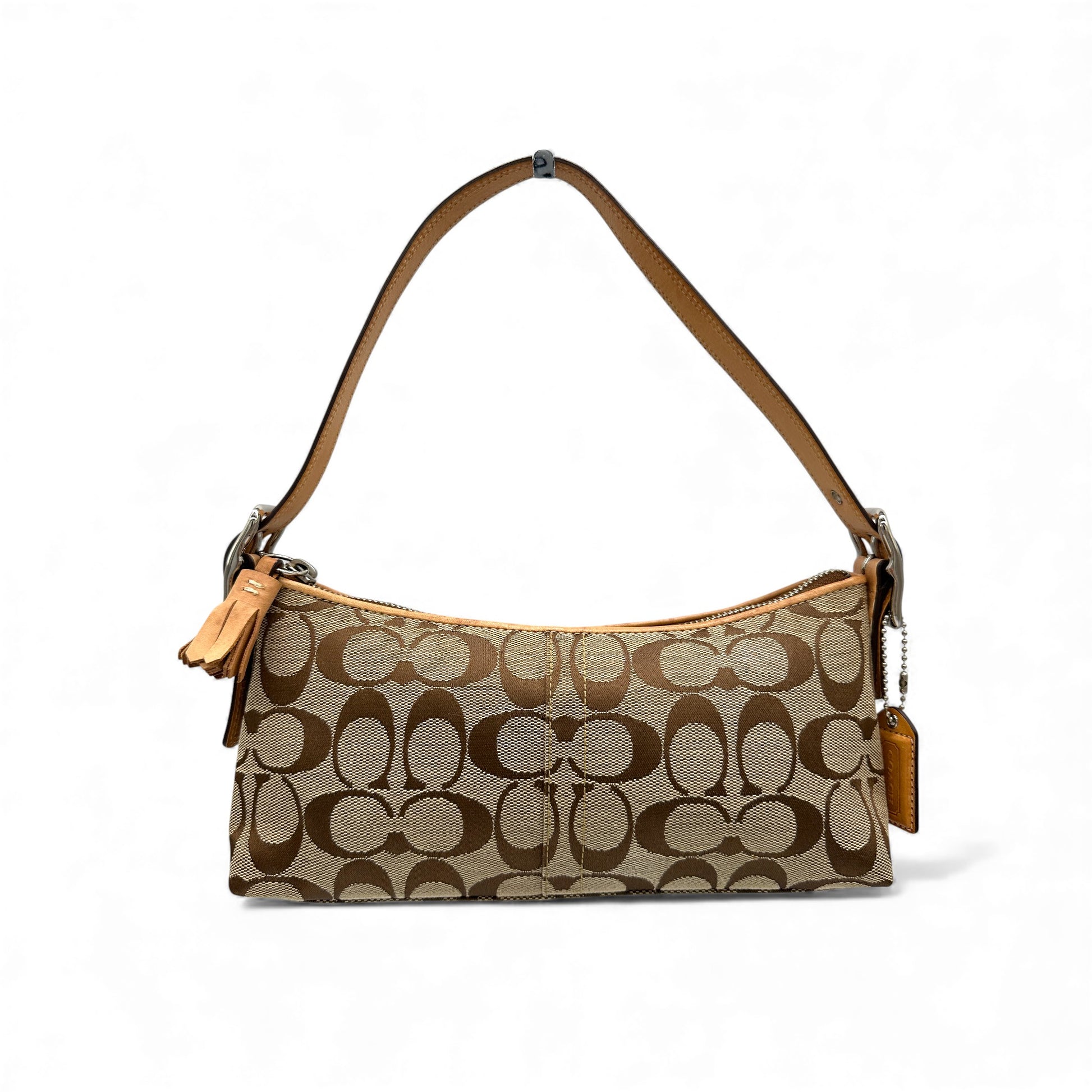 Vintage Coach 8K01 Baguette-Schultertasche. In Braun und Beige mit charakteristischem Monogramm, verziert mit hellbraunem Leder und einem Reißverschluss mit Quaste. Ein Y2K-Modell aus dem Jahr 2005.
