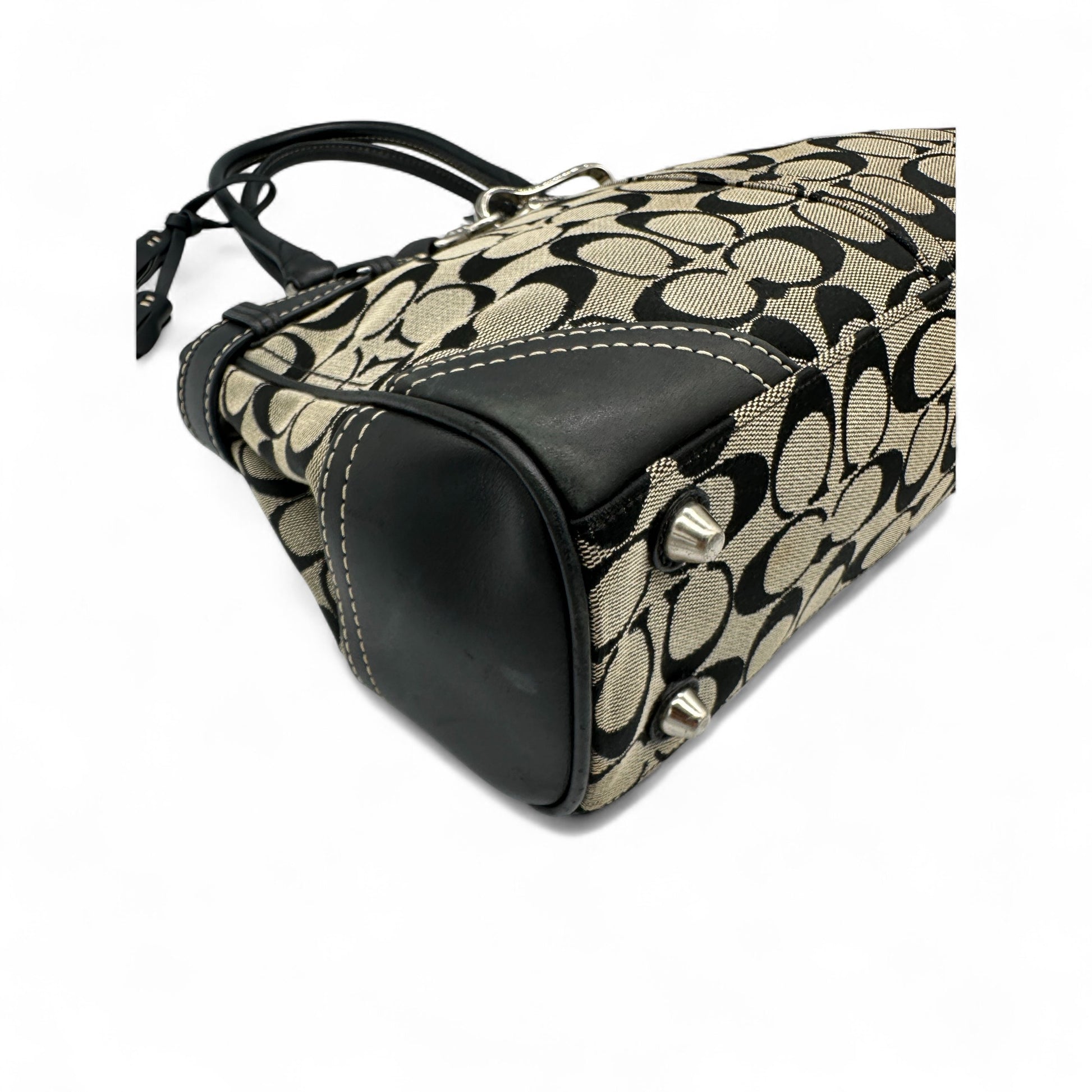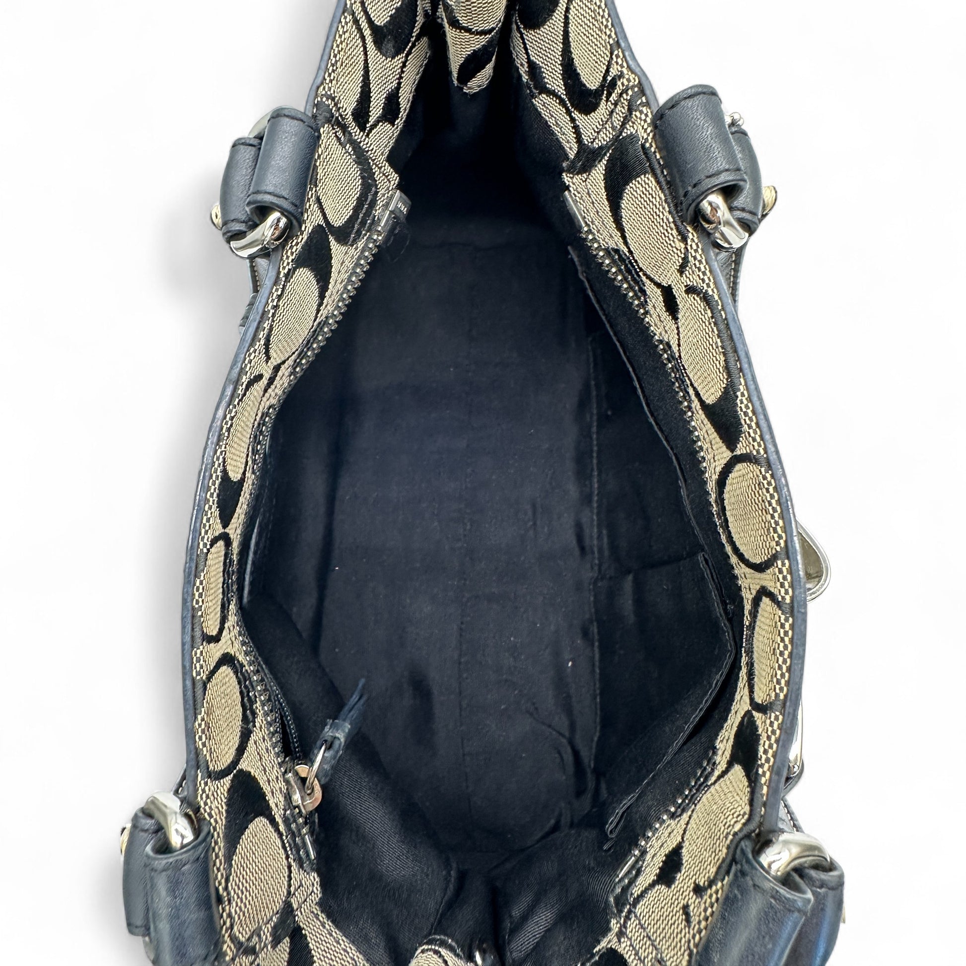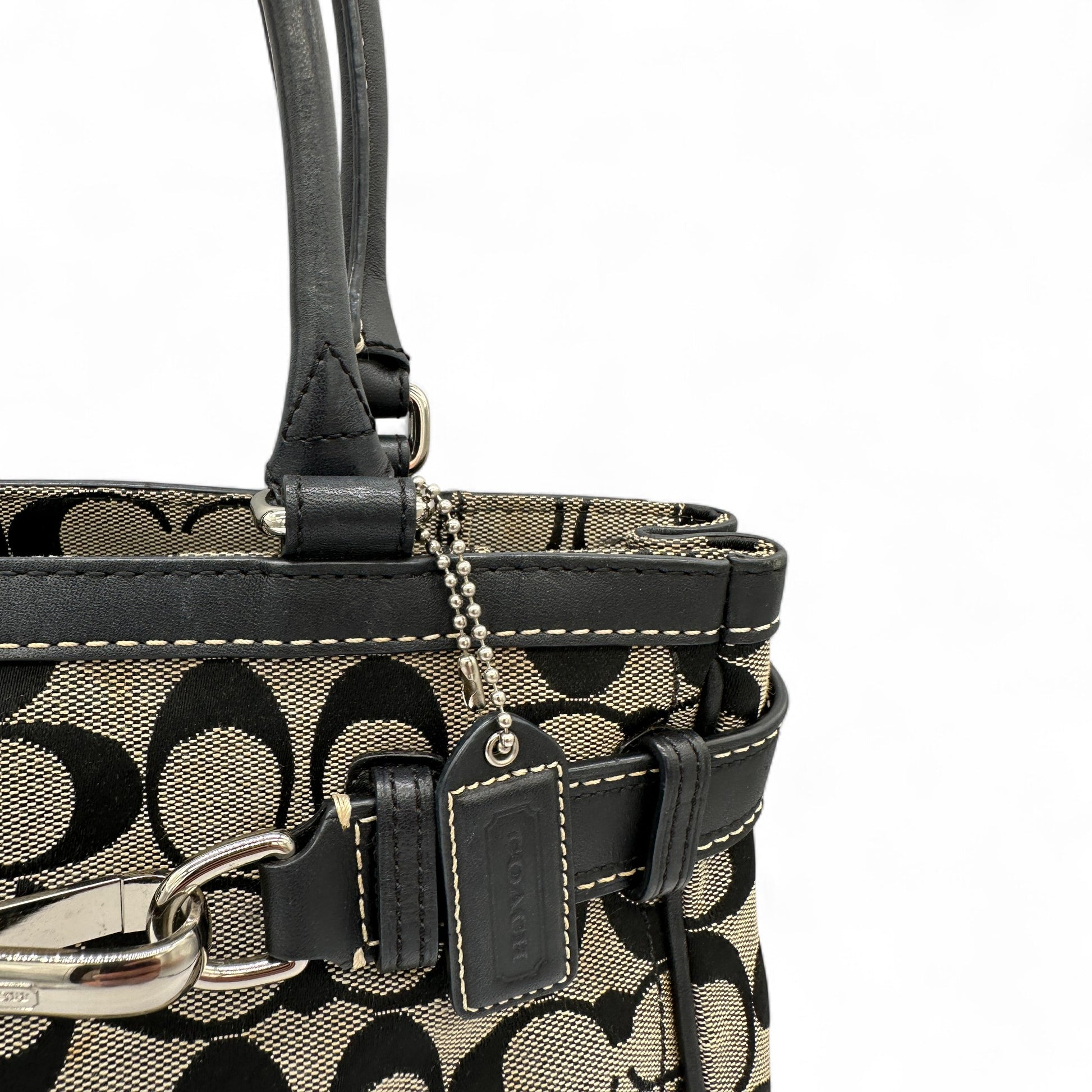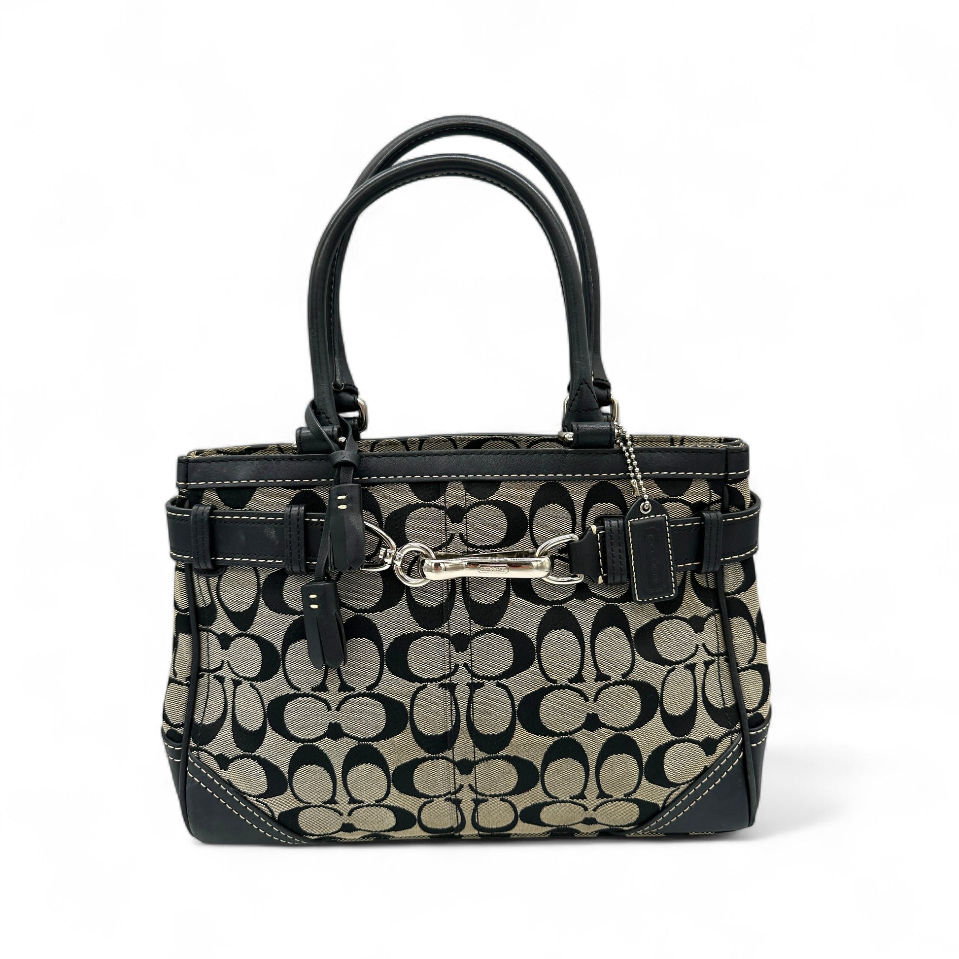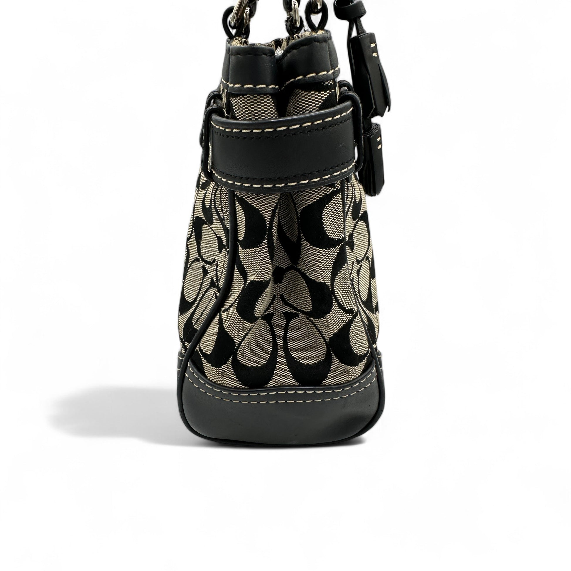 Vintage Coach 8K06 Hampton Clip Handtasche. Schwarz-beiges charakteristisches Monogramm mit schwarzem Lederbesatz und silberfarbenen Beschlägen. Vintage Coach Tragetasche aus dem Jahr 2006.