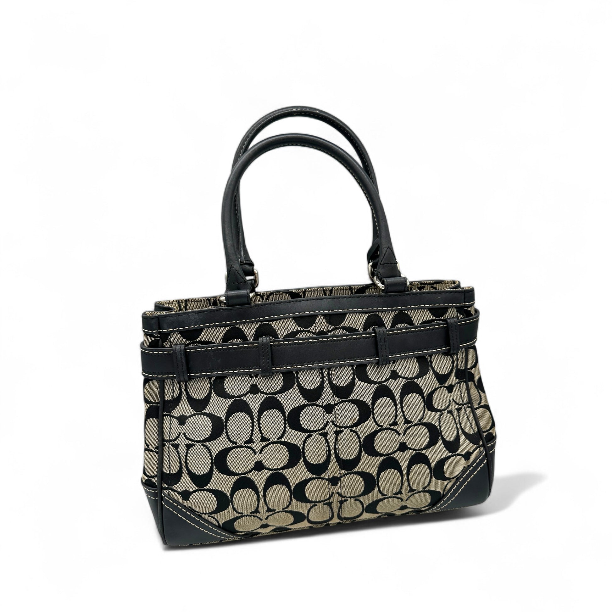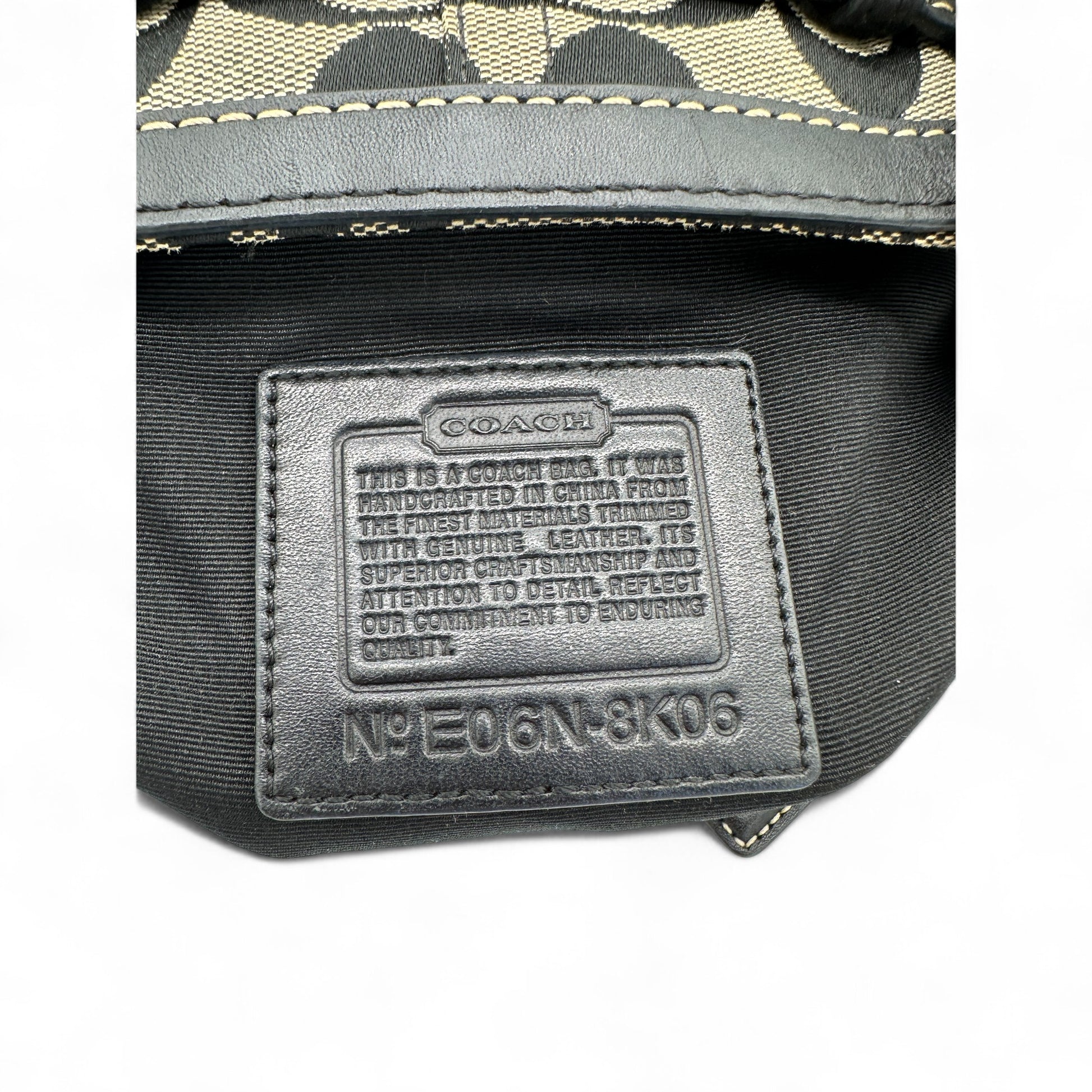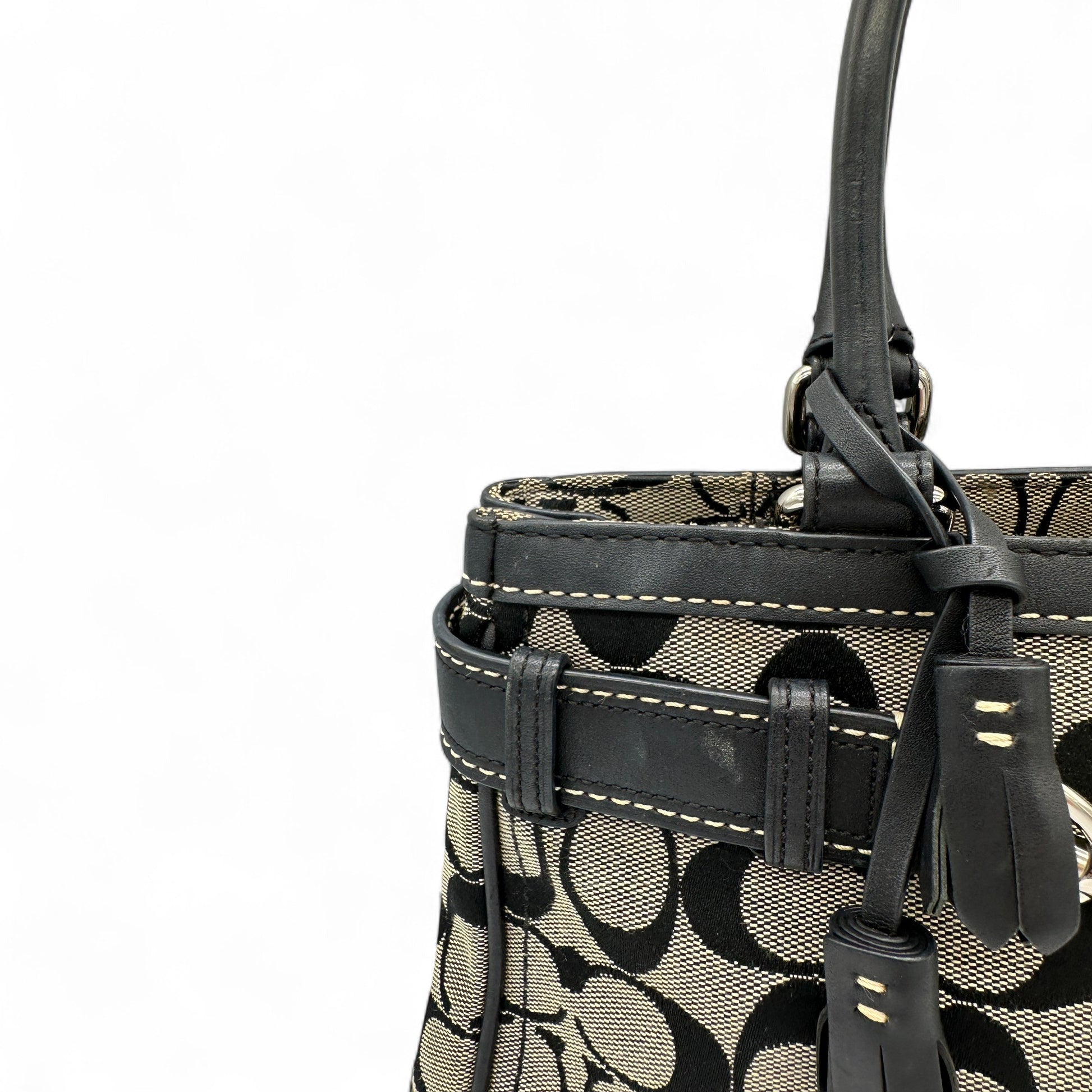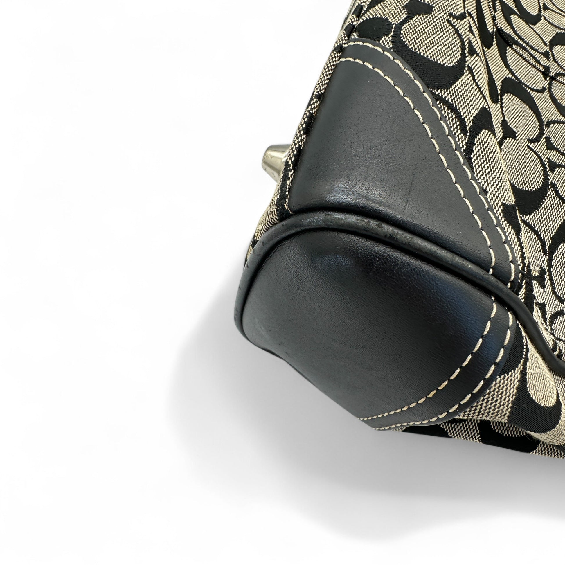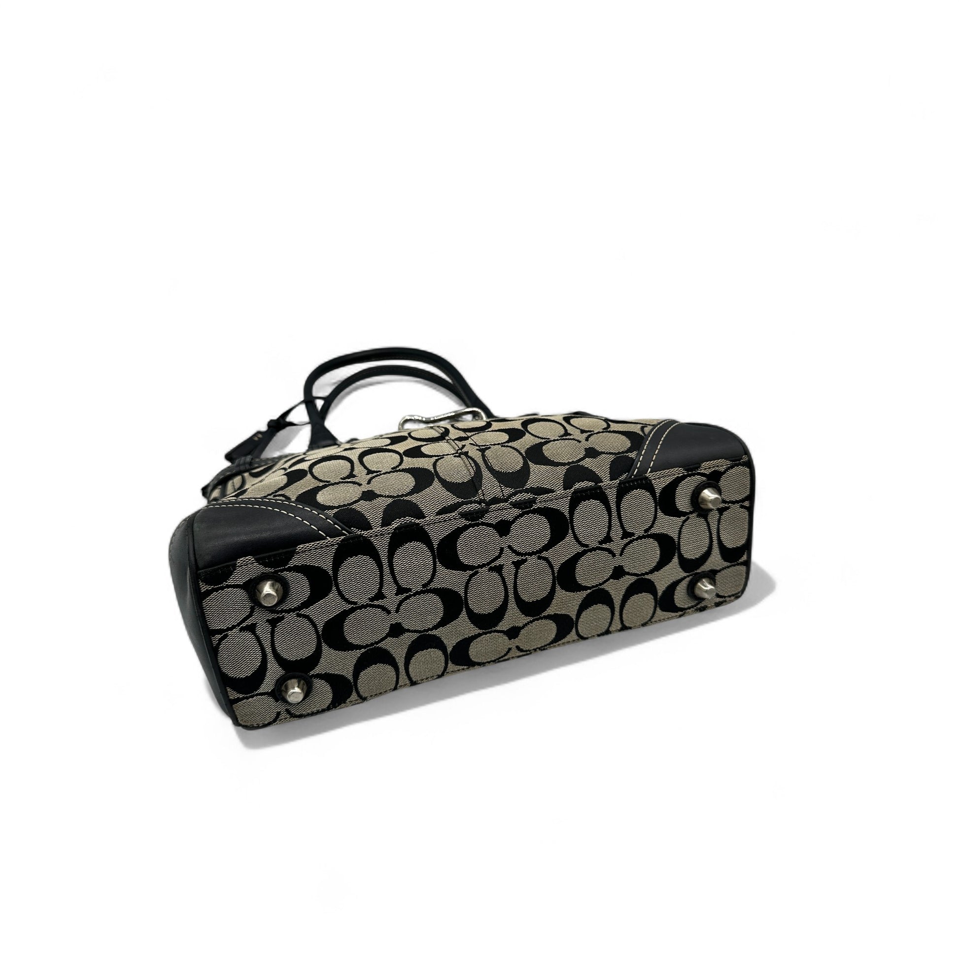 Vintage Coach 8K06 Hampton Clip Handtasche. Schwarz-beiges charakteristisches Monogramm mit schwarzem Lederbesatz und silberfarbenen Beschlägen. Vintage Coach Tragetasche aus dem Jahr 2006.