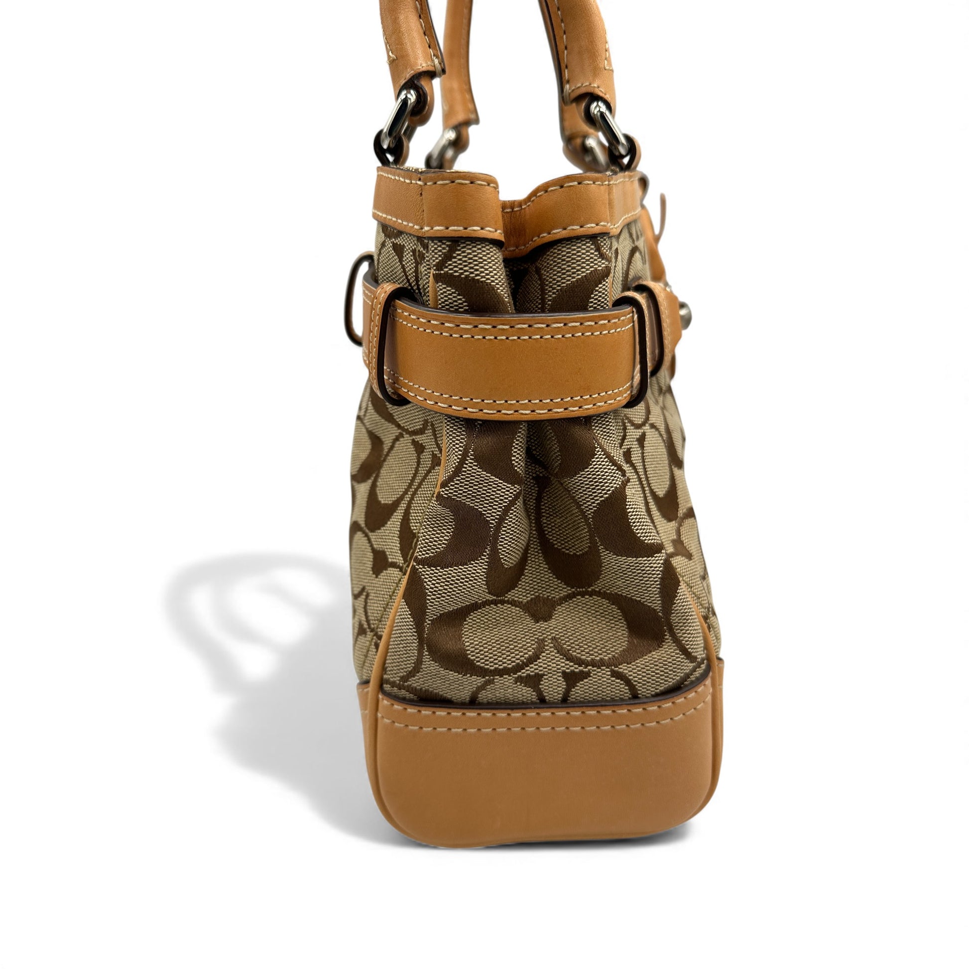 Vintage Coach 8K06 Hampton Clip Handtasche. In Braun und Beige mit dem charakteristischen Coach-Monogramm, verziert mit hellbraunen und silberfarbenen Horsebit-Clip-Verschlüssen. Vintage Coach Tote Bag aus dem Jahr 2006.