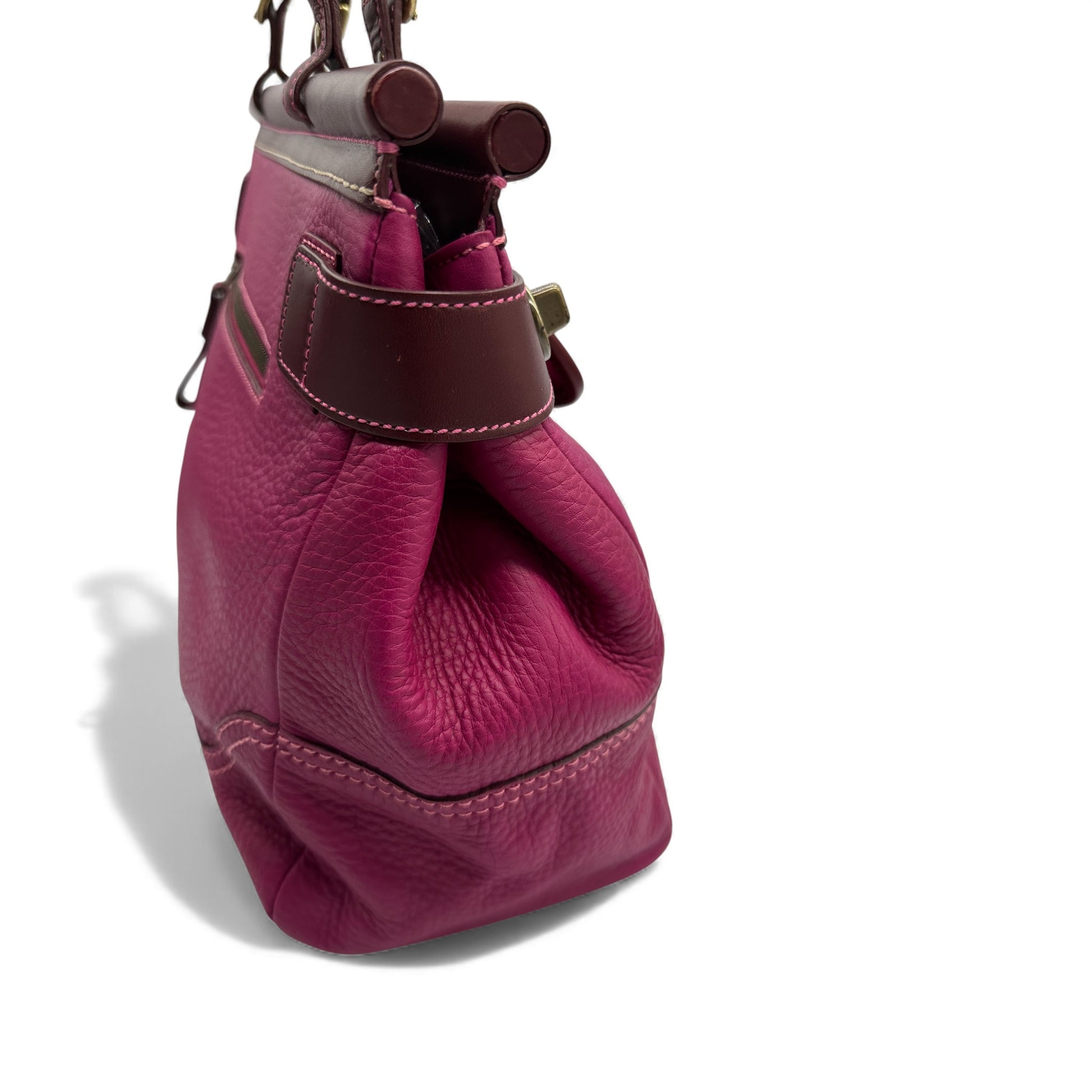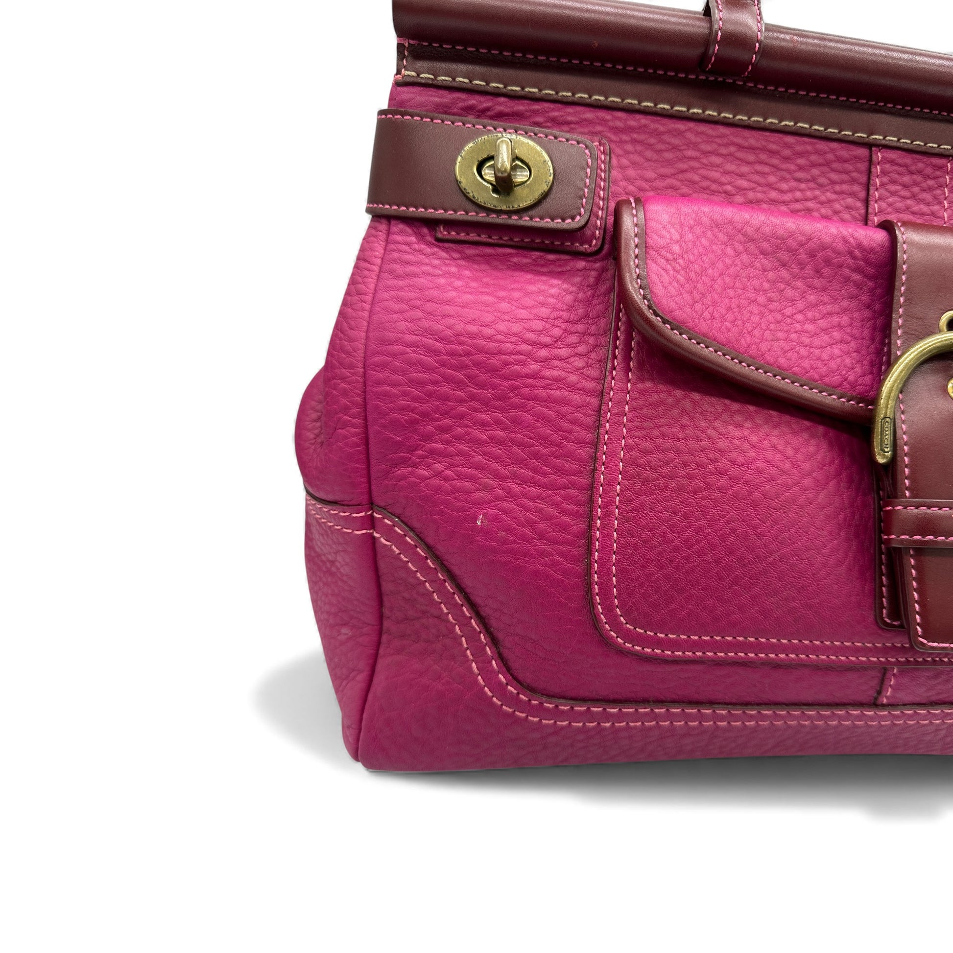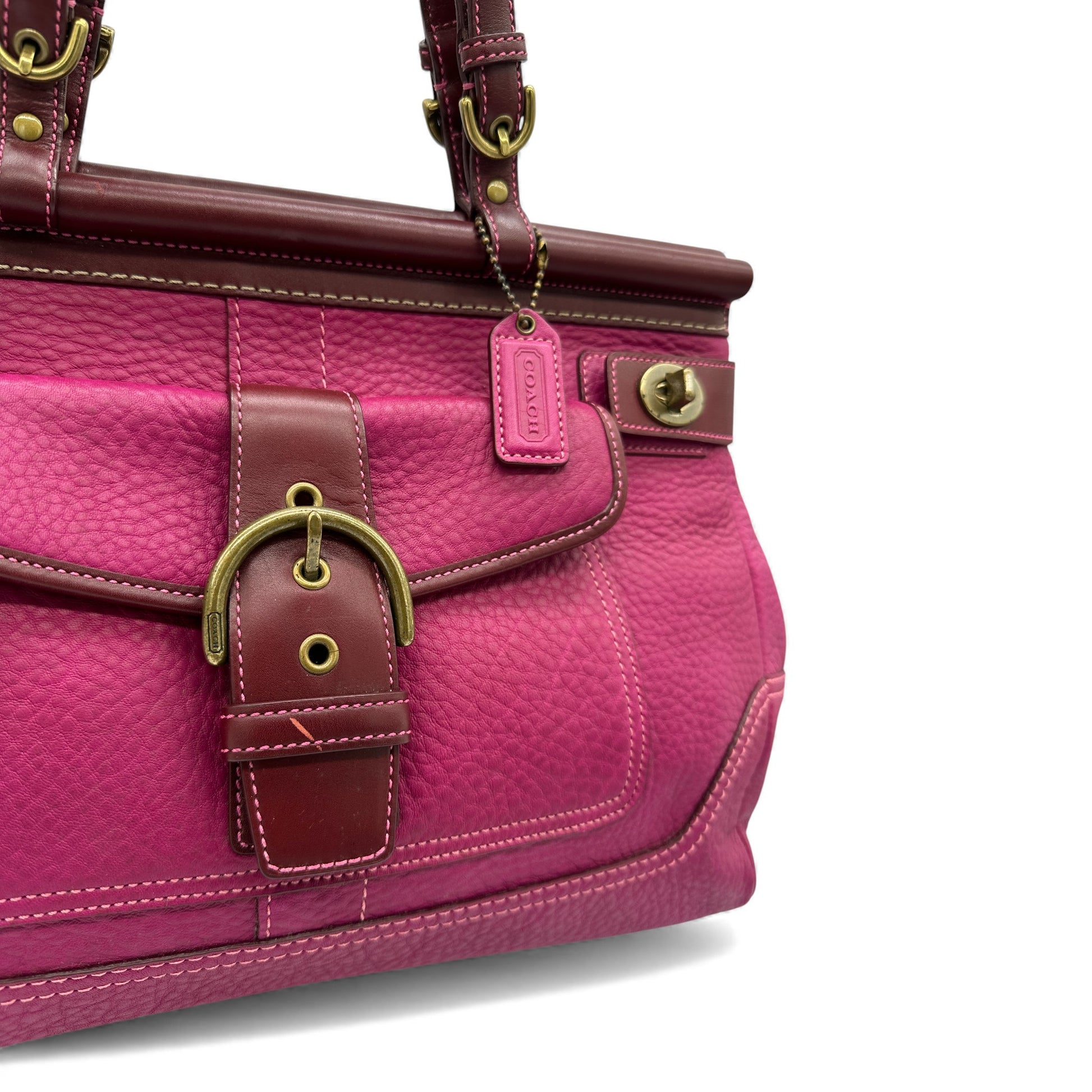 Vintage Coach 9749 Soho Legacy Handtasche. Aus weichem, genarbtem, rosafarbenem Rindsleder mit goldfarbenen Soho-Schnallen aus Messing. Mit Drehverschluss und Dübelverschluss sowie charakteristischem Monogramm-Futter. Ein seltenes Y2K-Stück aus dem Jahr 2004.