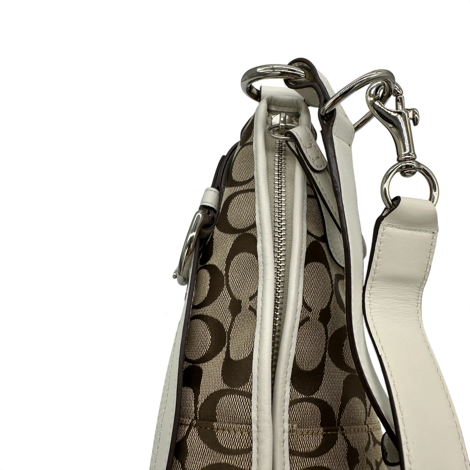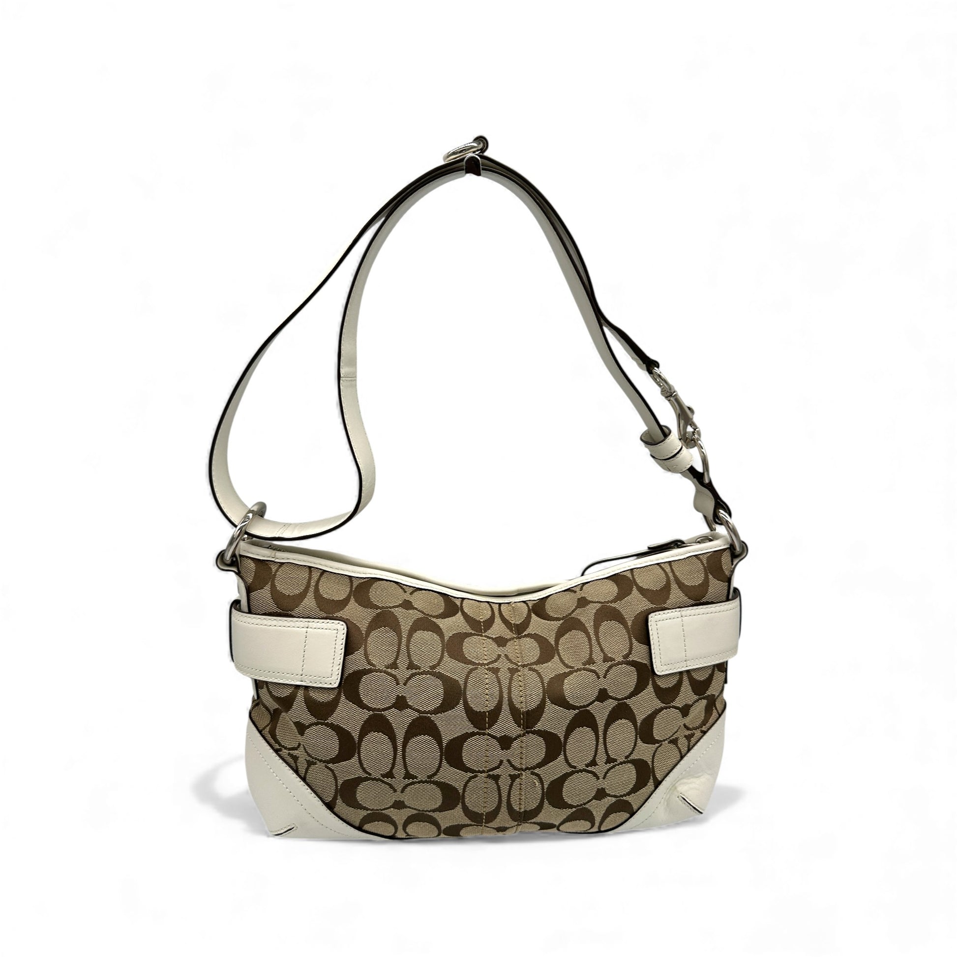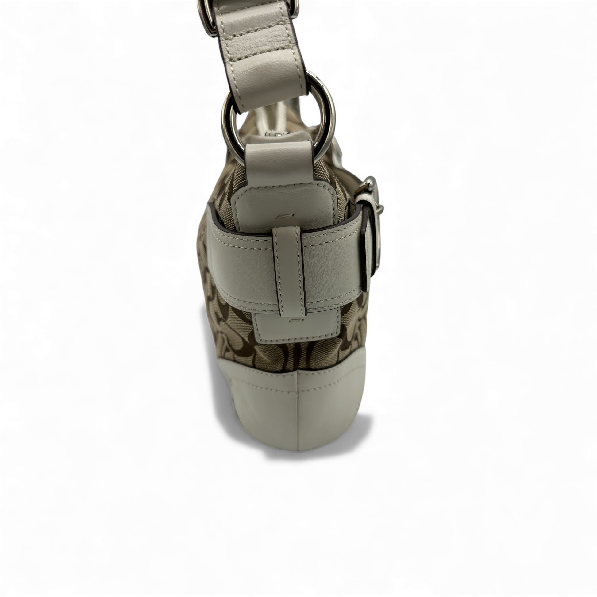 Vintage Coach F07077 Soho Schultertasche. Braun-beiges Monogramm mit weißem Lederbesatz und silberfarbener Schnalle. Der Riemen ist verstellbar, sodass die Tasche sowohl über der Schulter als auch quer über dem Körper getragen werden kann. Ein Y2K-Modell aus dem Jahr 2008.