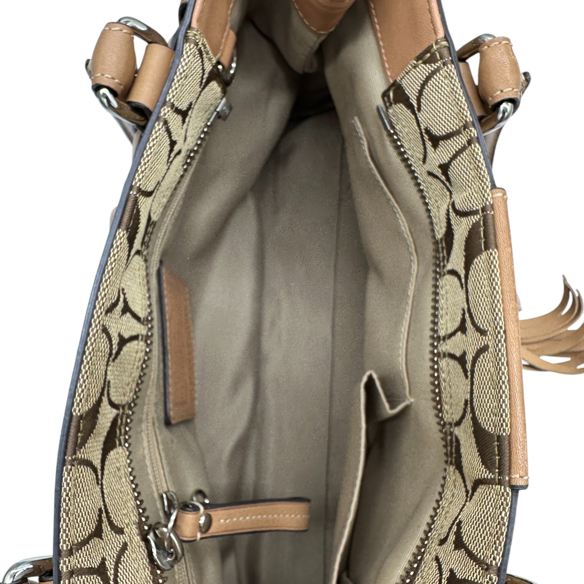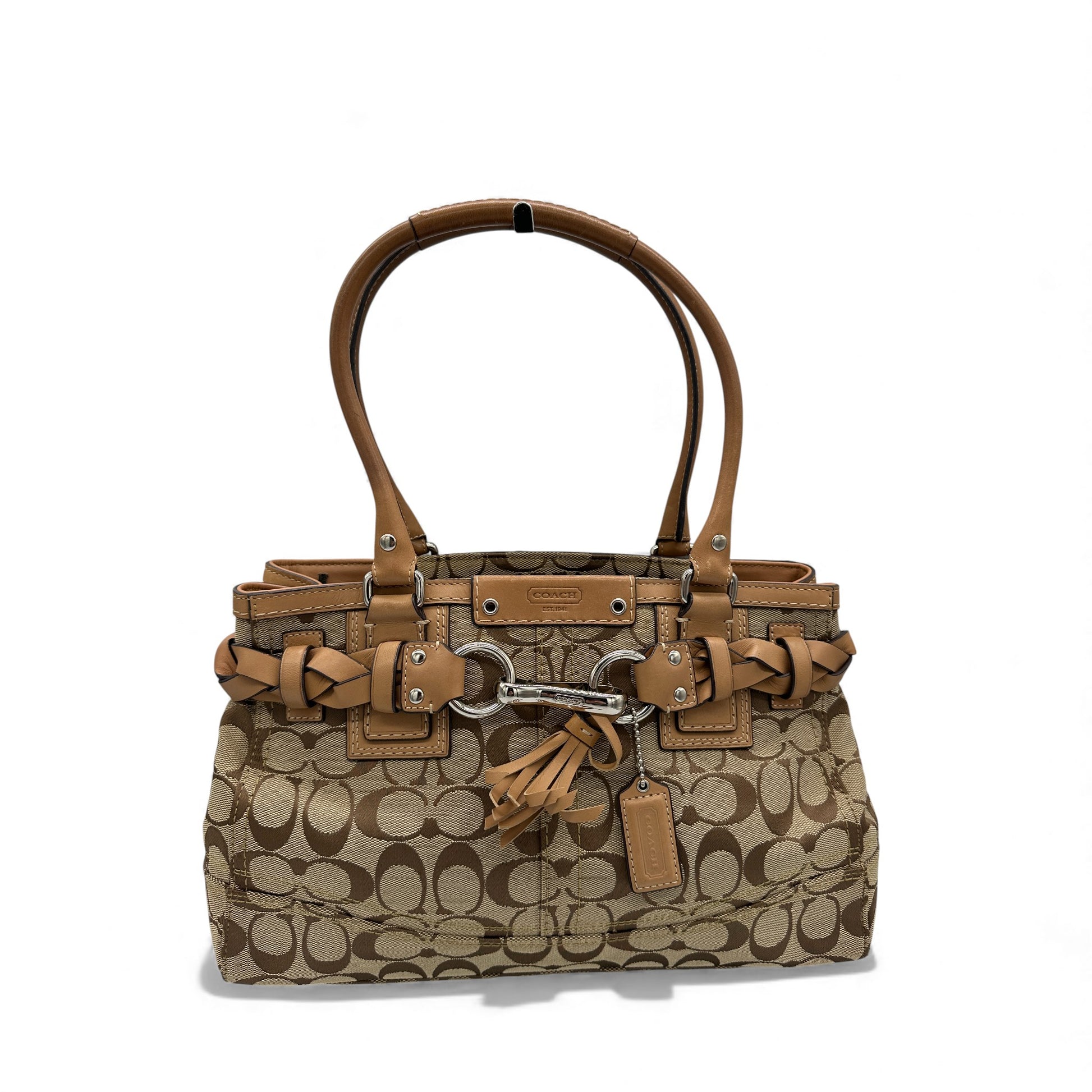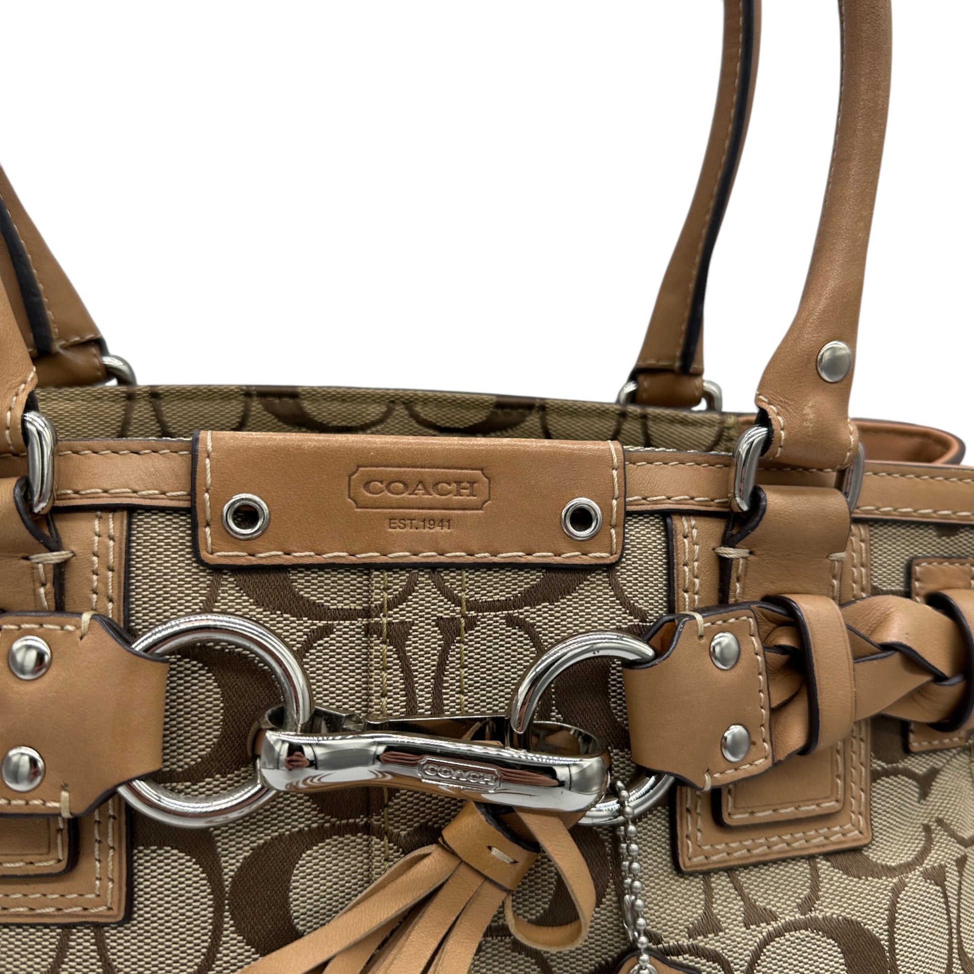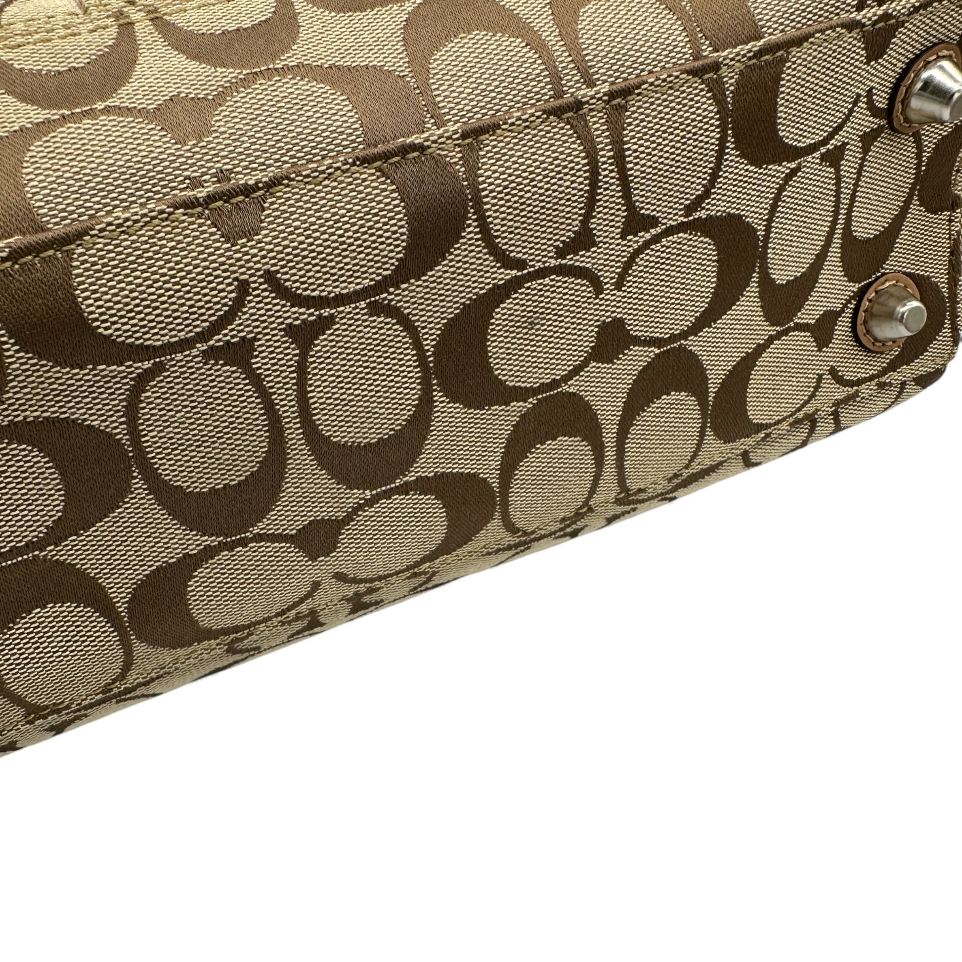 Modell und Stil: Vintage Coach F13065 Hampton Clip Handtasche in Beige mit charakteristischem Monogramm, hellbraunen Lederdetails und silberfarbenen Beschlägen. Ein Y2K-Stück aus dem Jahr 2008.