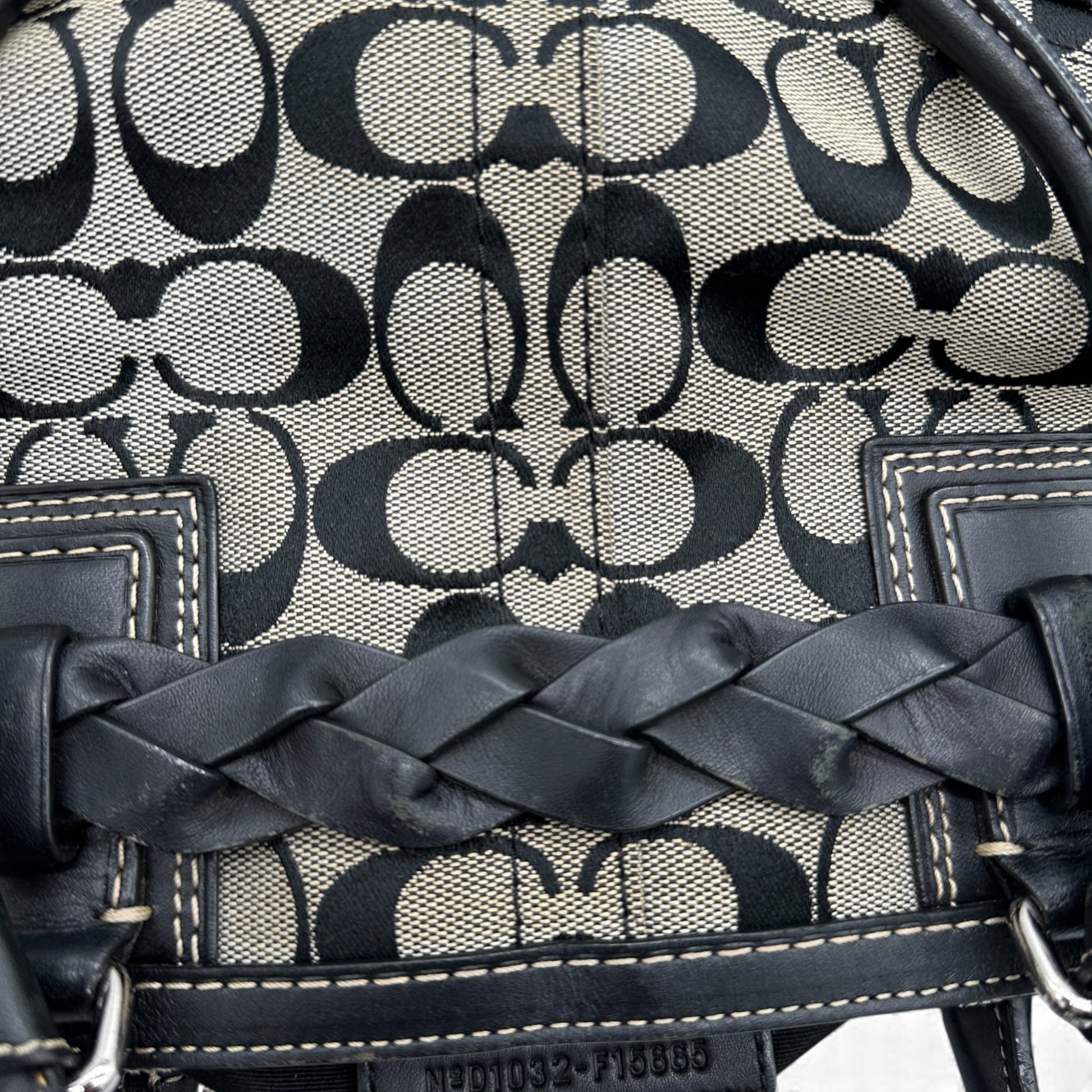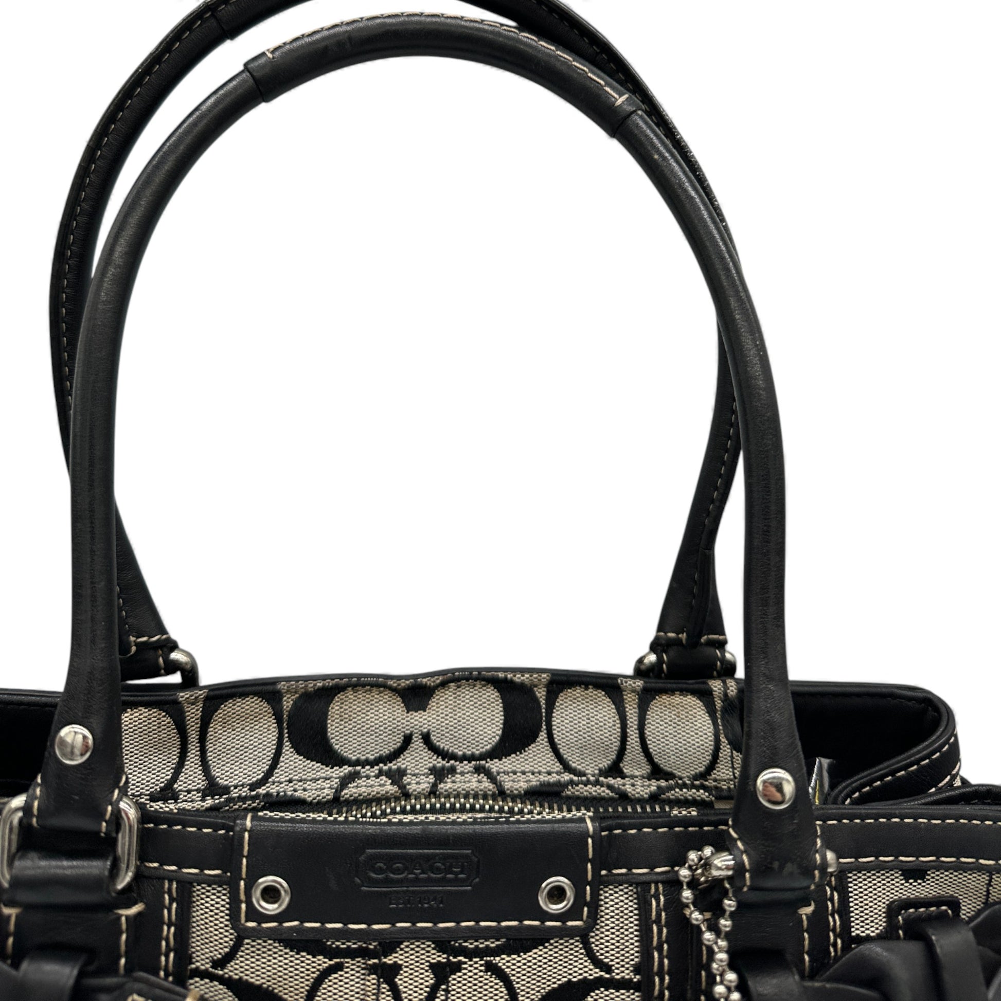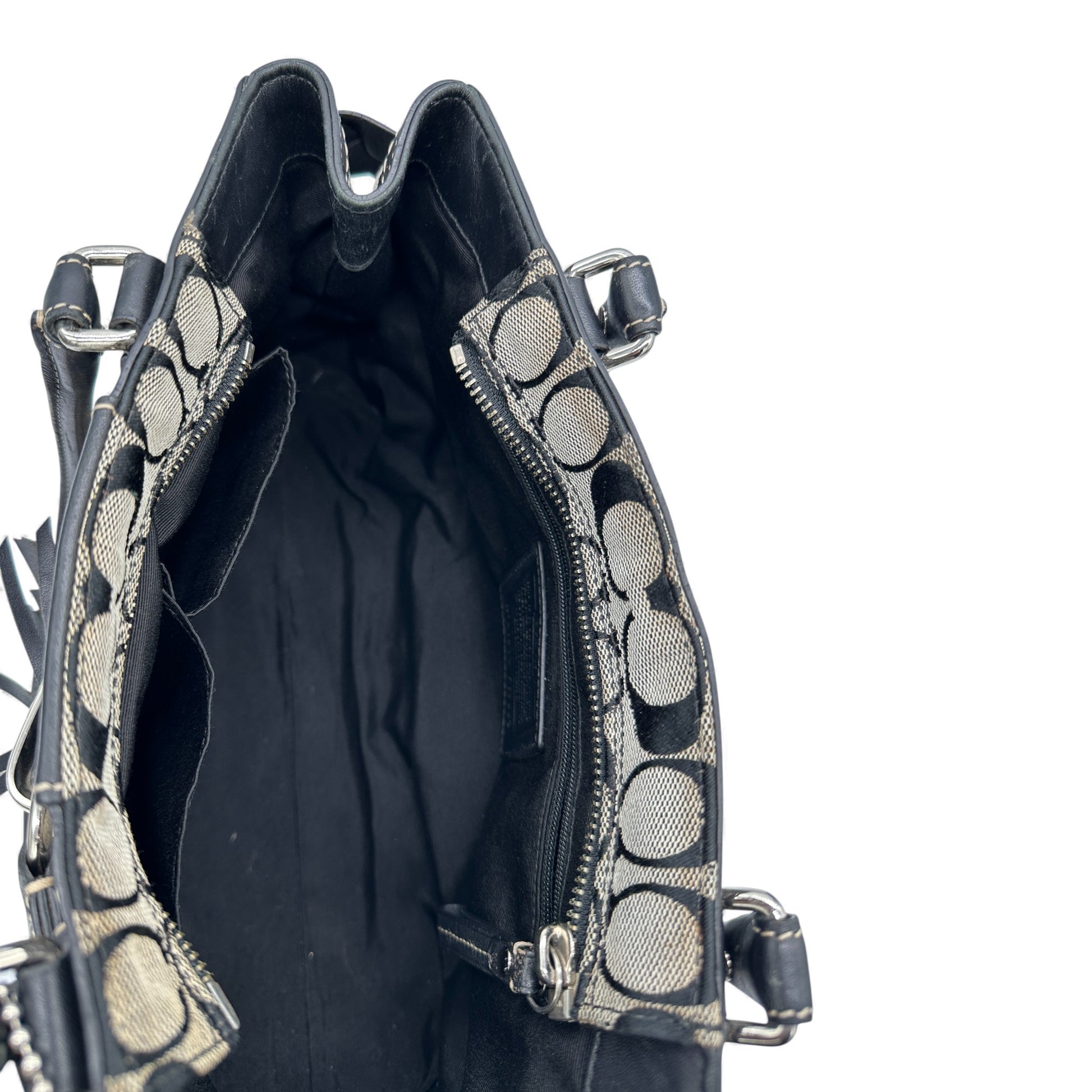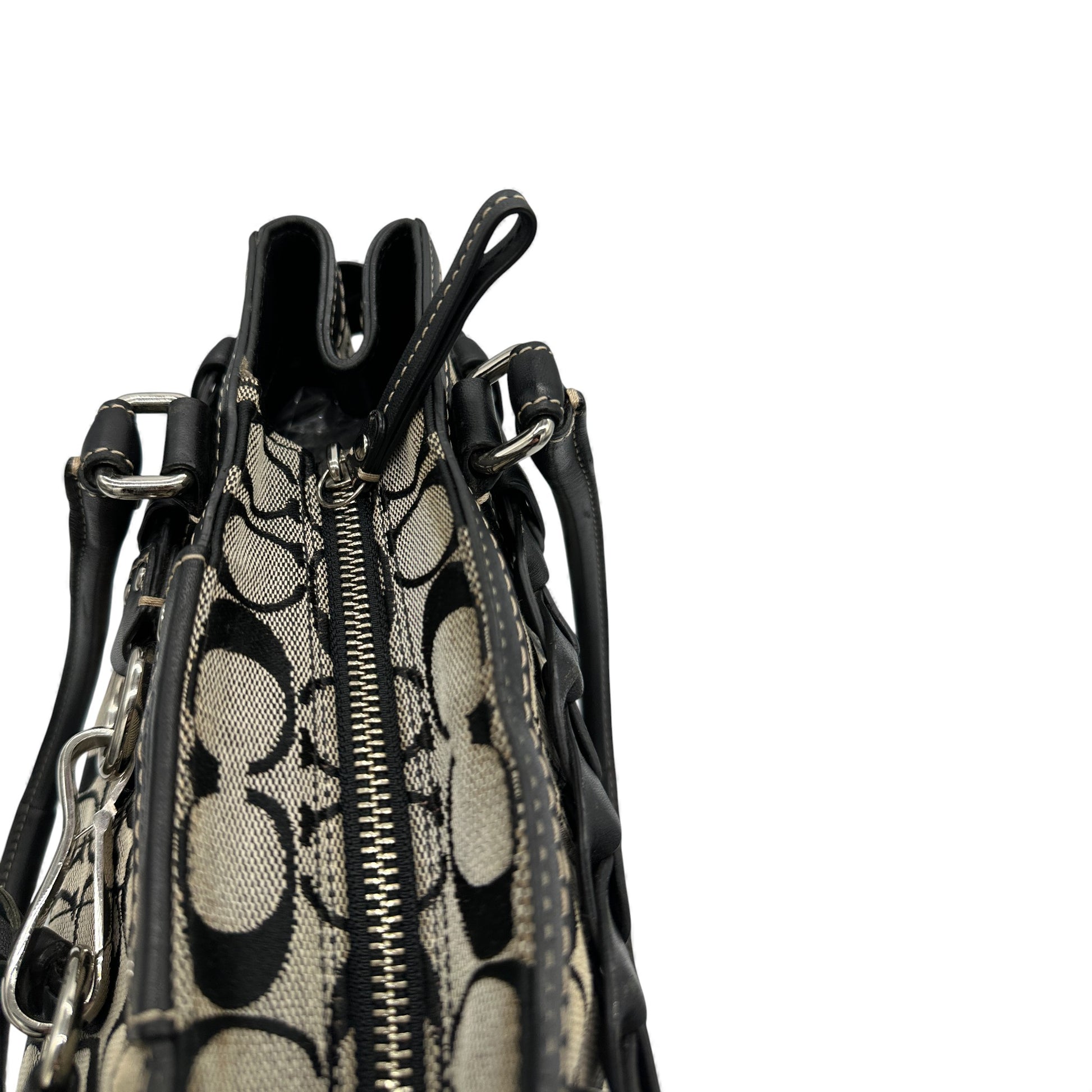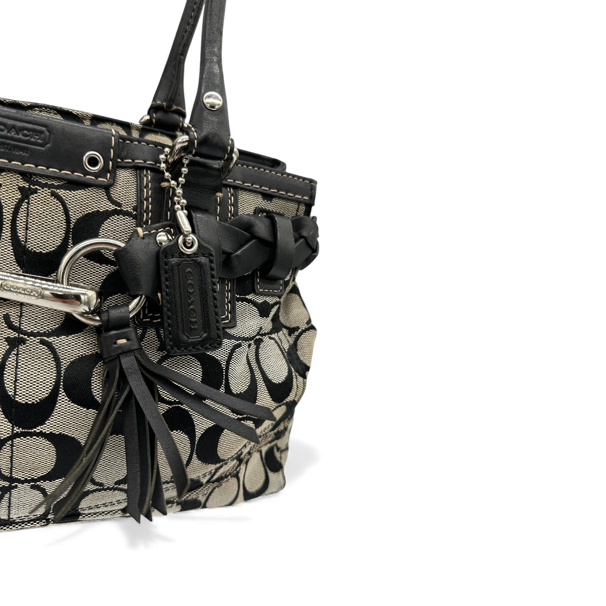 Vintage Coach Hampton Clip Handtasche (Modell F15665) in Grau und Schwarz mit charakteristischem Monogramm, schwarzem Lederbesatz und silberfarbenen Beschlägen. Ein Y2K-Modell aus dem Jahr 2010.
