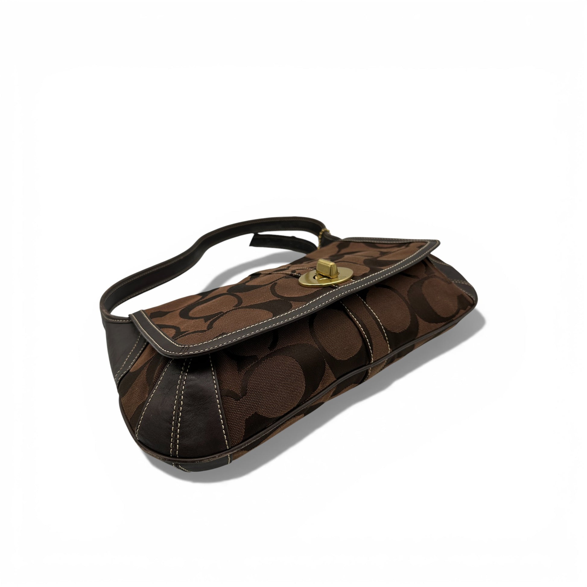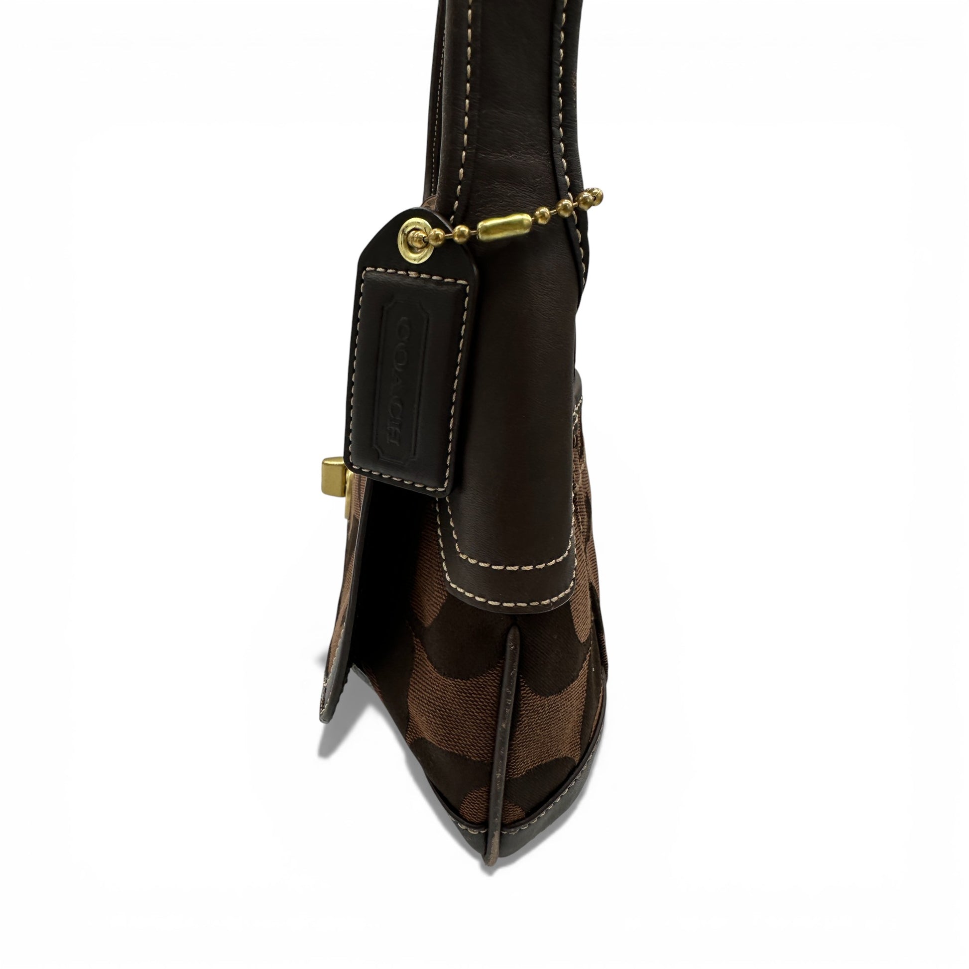 Vintage Coach 11257 Flap Ergo Shoulder Bag in chocolate brown signature monogram. Trimmed with brown leather and brass gold-tone brass hardware, with flap and turnlock closure. A Y2K piece from 2007.