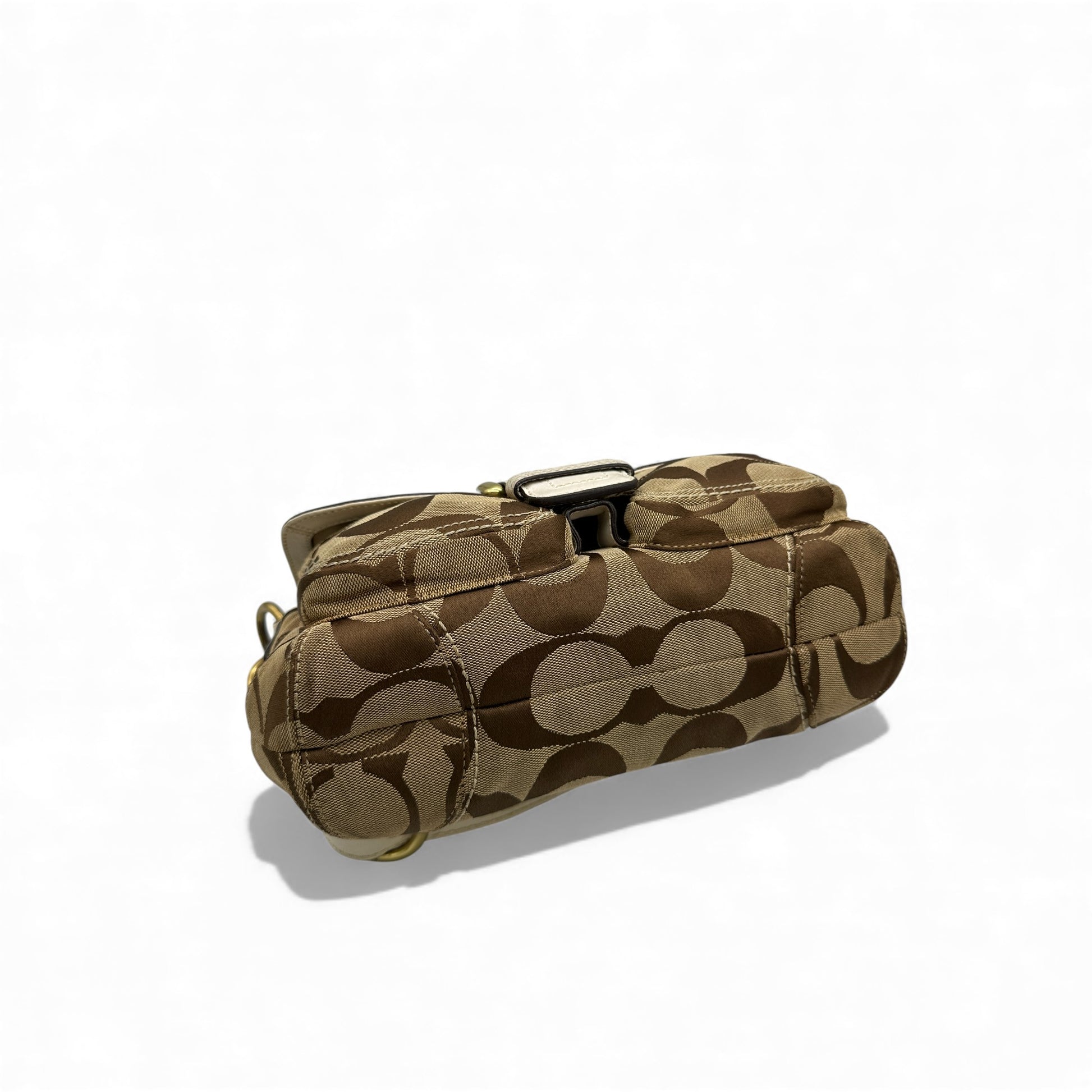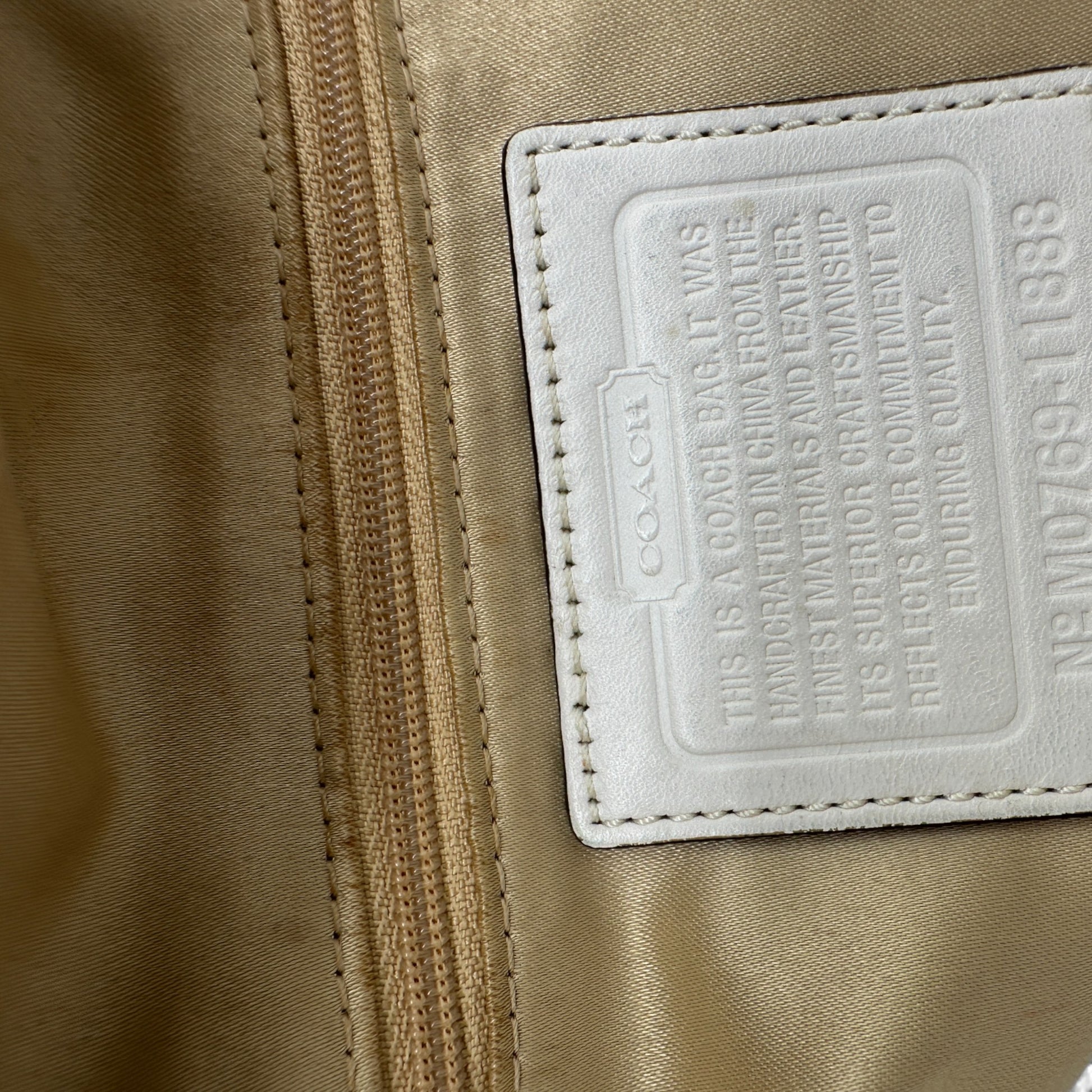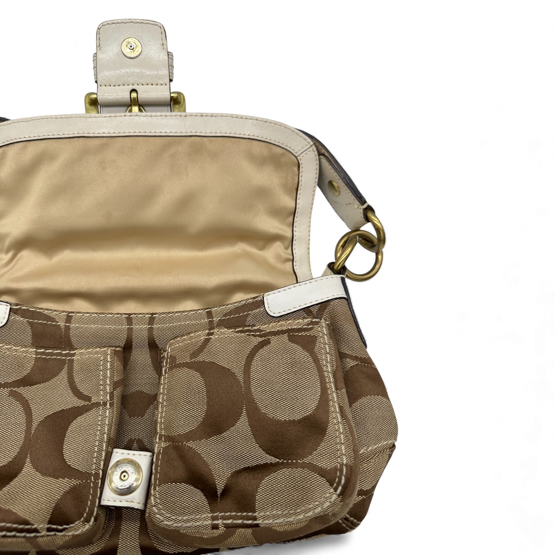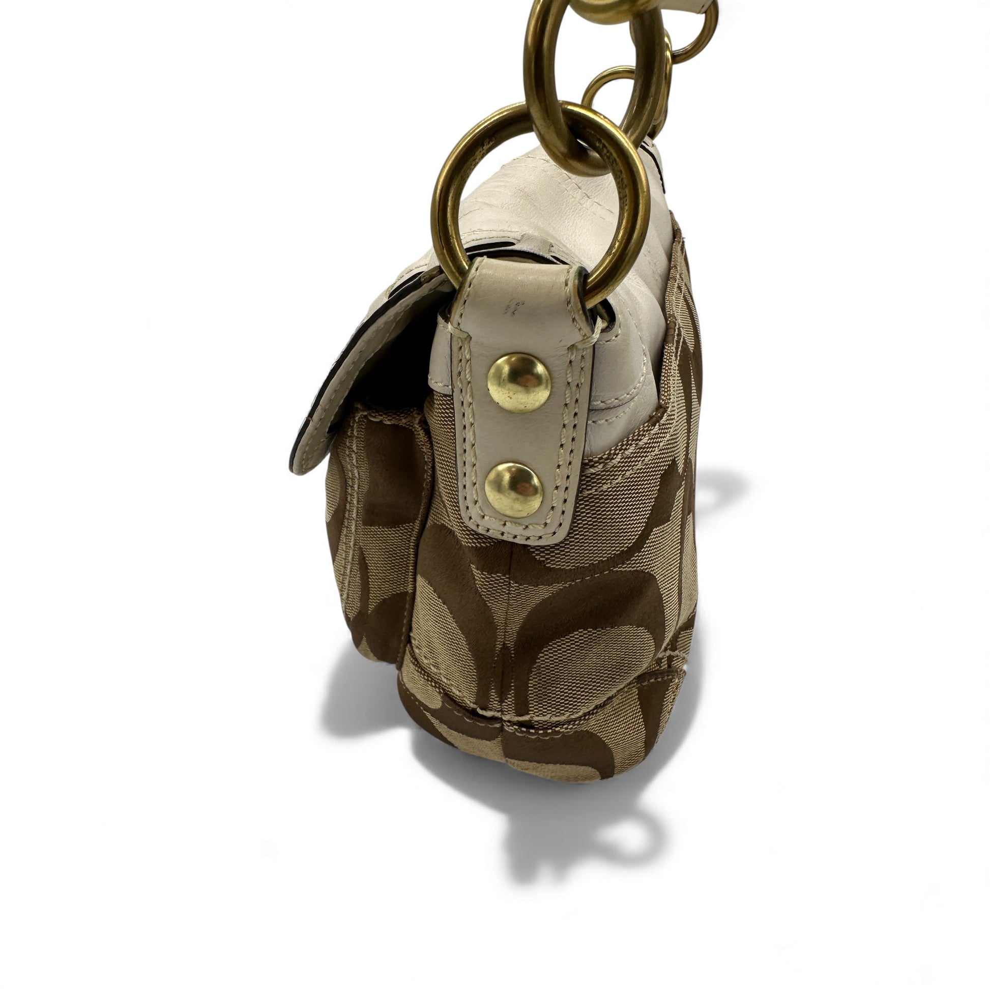 Vintage Coach 11888 Soho Shoulder Bag in beige signature monogram with patent white leather trim and gold-tone brass soho buckle hardware. A Y2K piece from 2007.