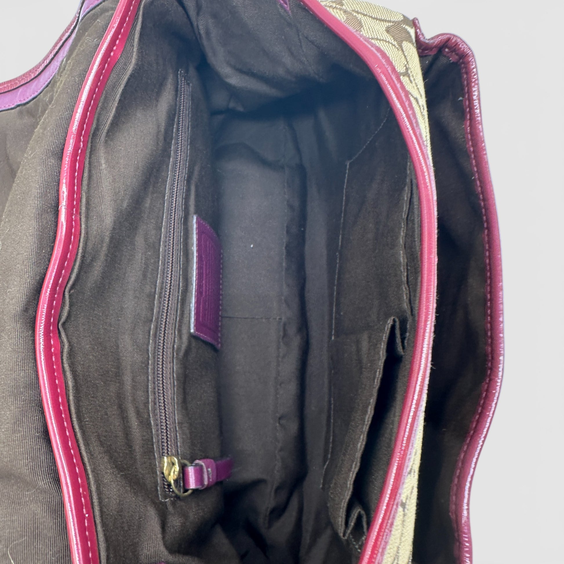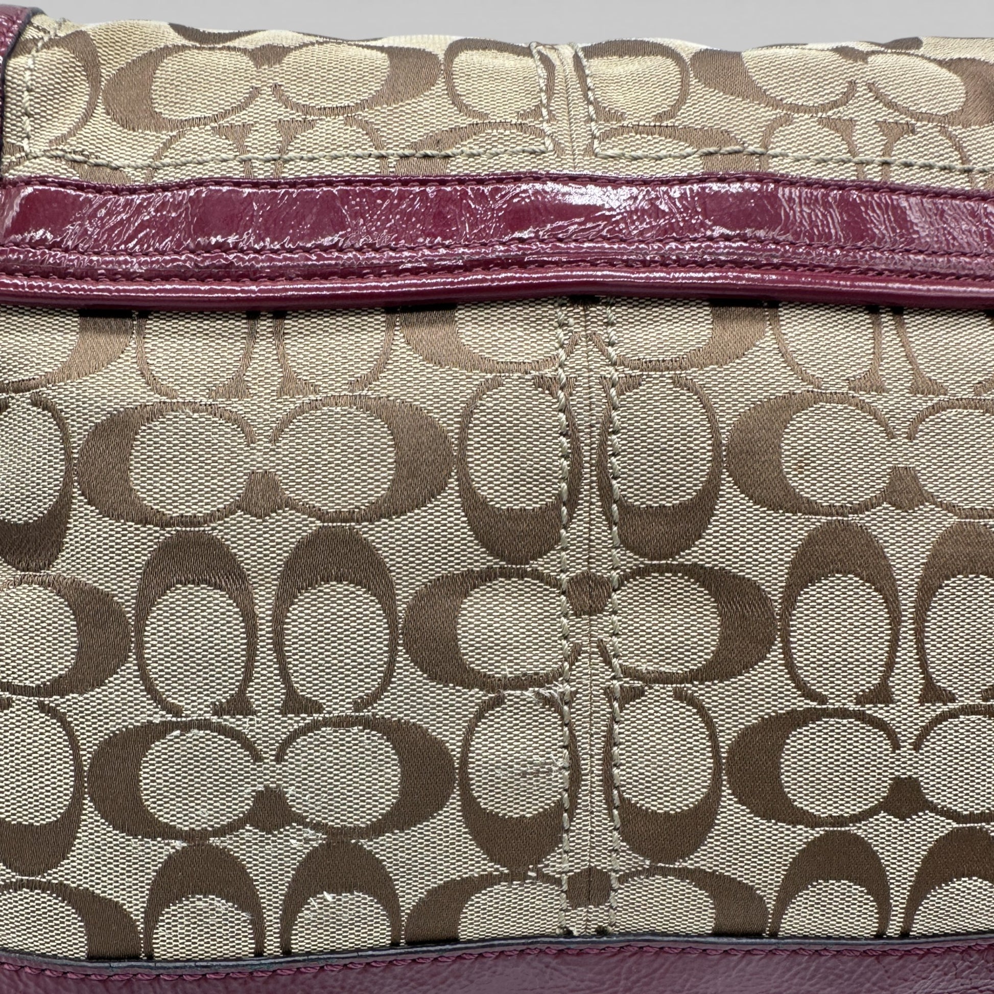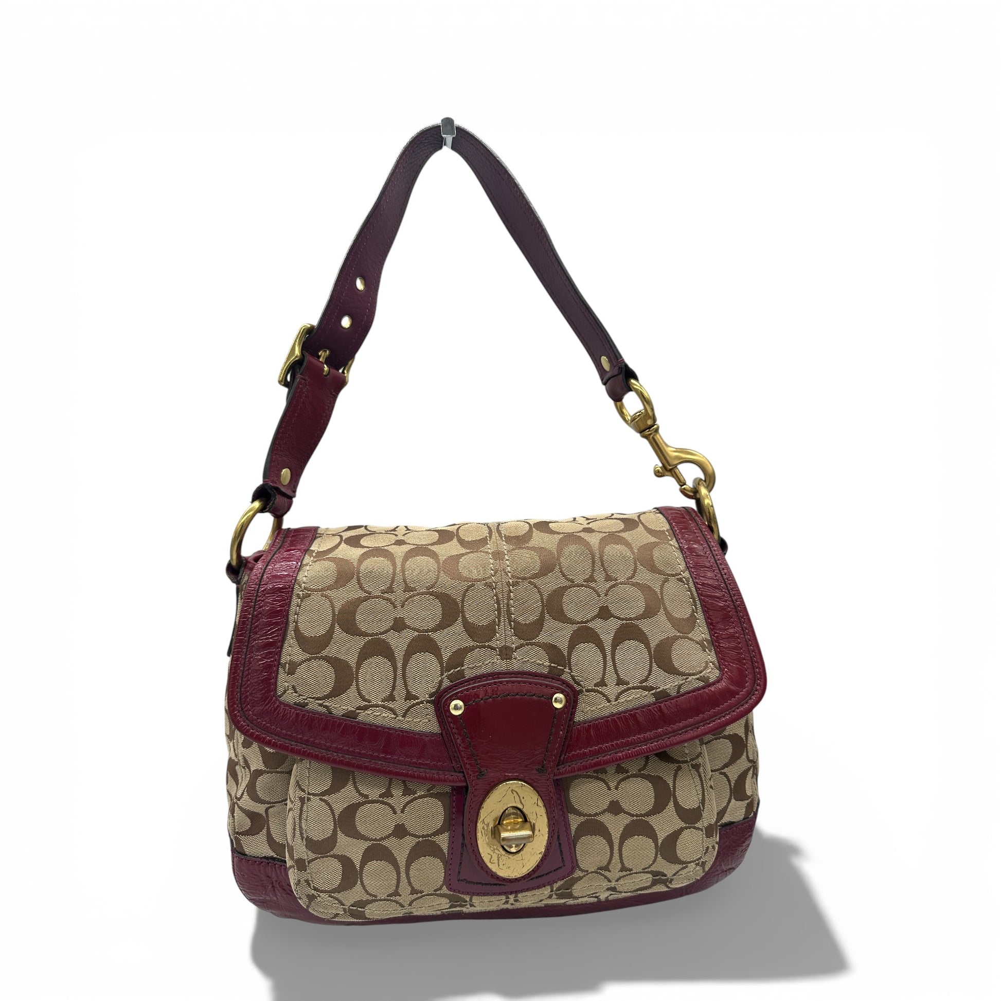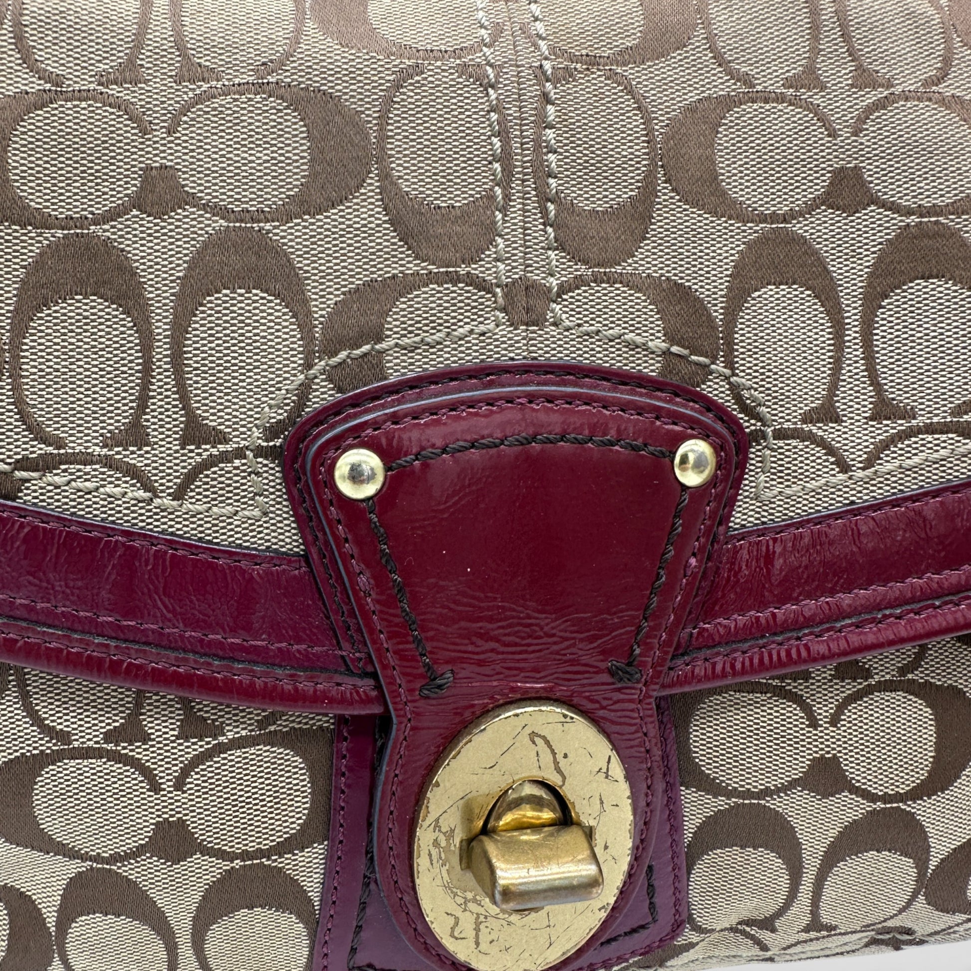 Vintage Coach F12857 Ali Legacy Shoulder Bag. In brown and beige signature monogram, trimmed with burgundy patent leather and brass turnlock hardware. A Y2K piece from 2008.