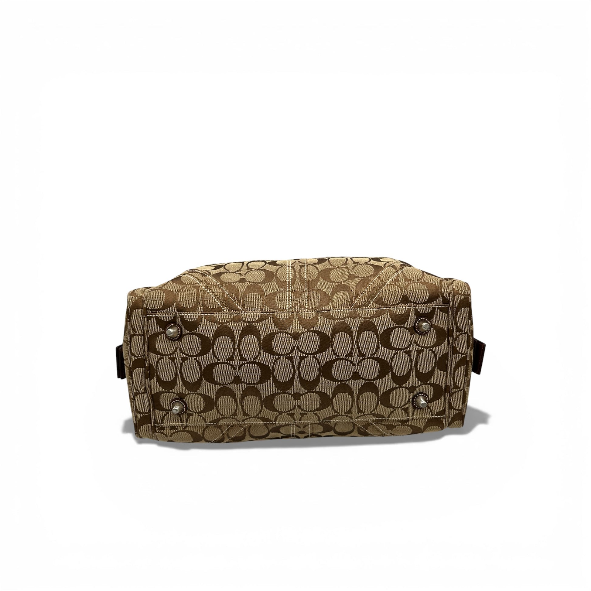 Vintage Coach 10078 Soho Mini Boston Shoulder Bag. A compact classic in Coach’s signature brown and beige monogram canvas, trimmed with smooth brown leather and finished with silver-tone Soho buckle hardware. With side pockets with monogram detailed buckles. A Y2K piece from 2006.