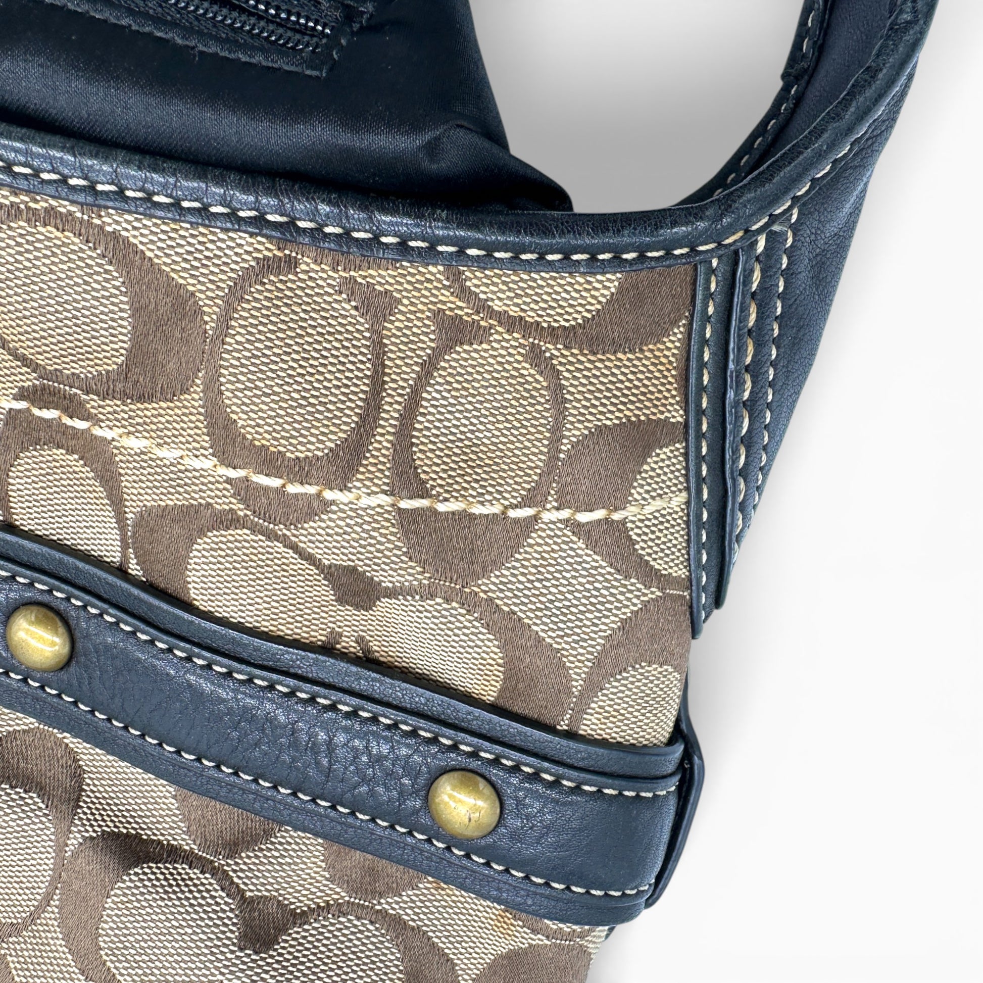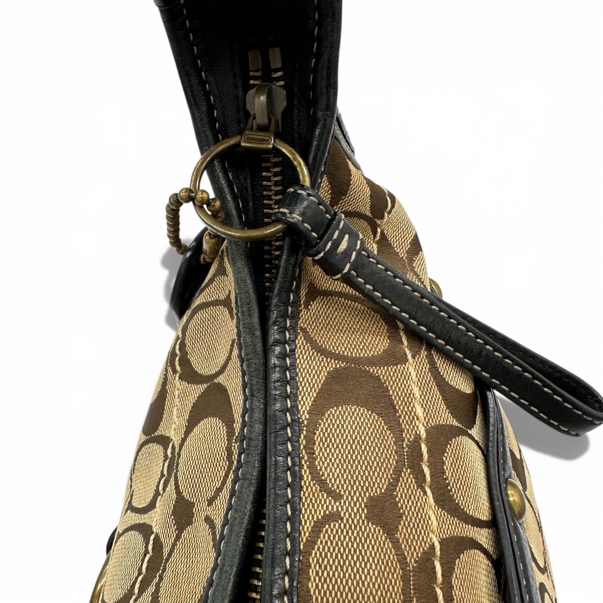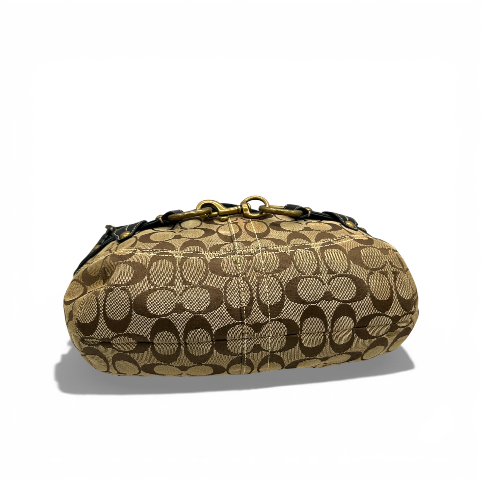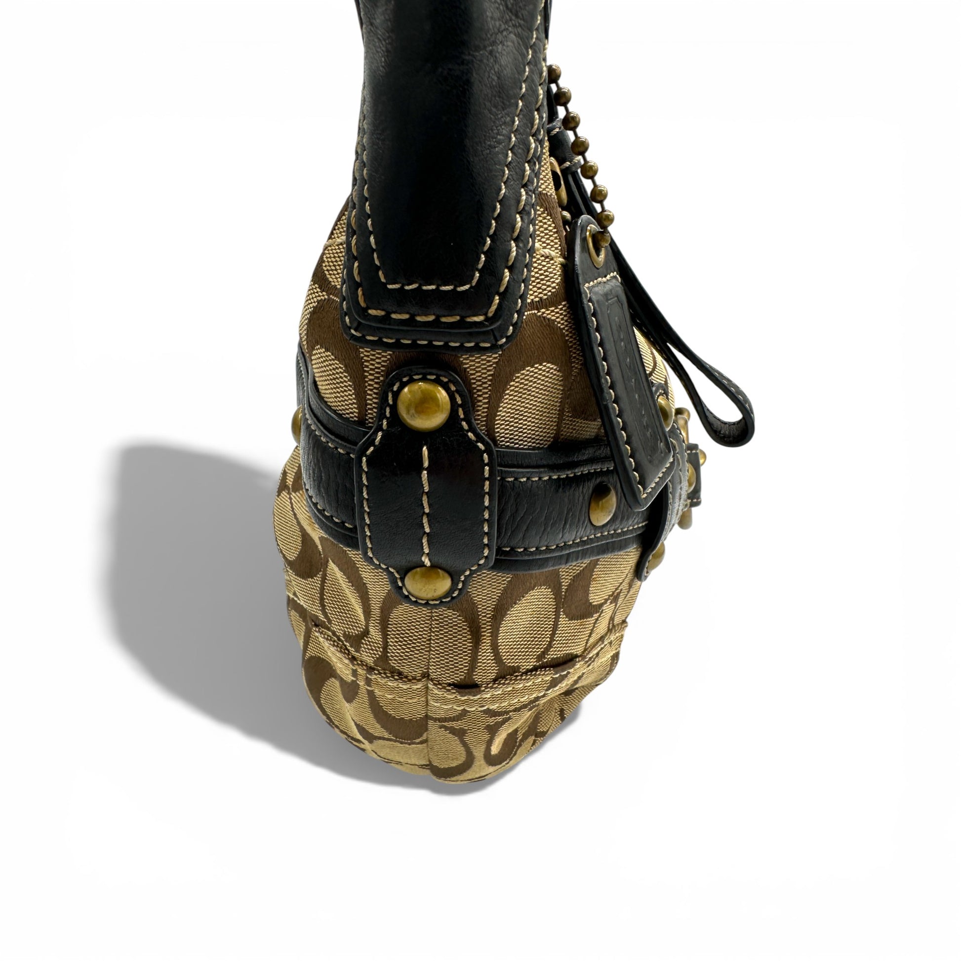 Vintage Coach 11275 Ergo Shoulder Bag. In brown and beige Signature Monogram with brass gold-tone horsebit hardware. With black leather trim and belt detailing, with brass stud accents. A sough after rare Coach Ergo style from 2007.