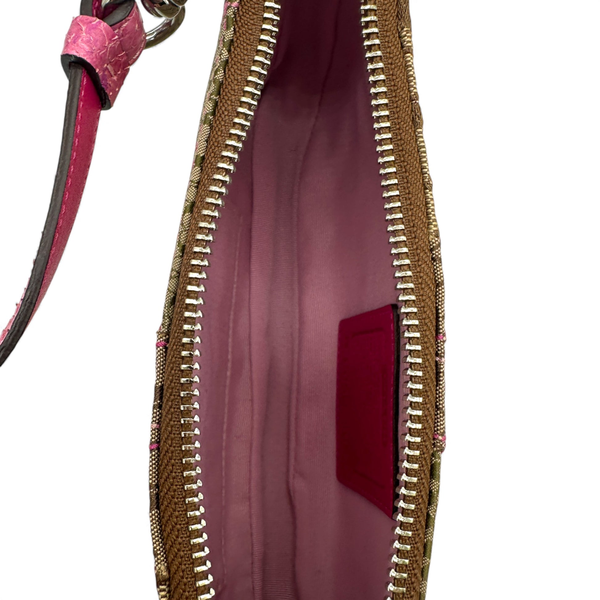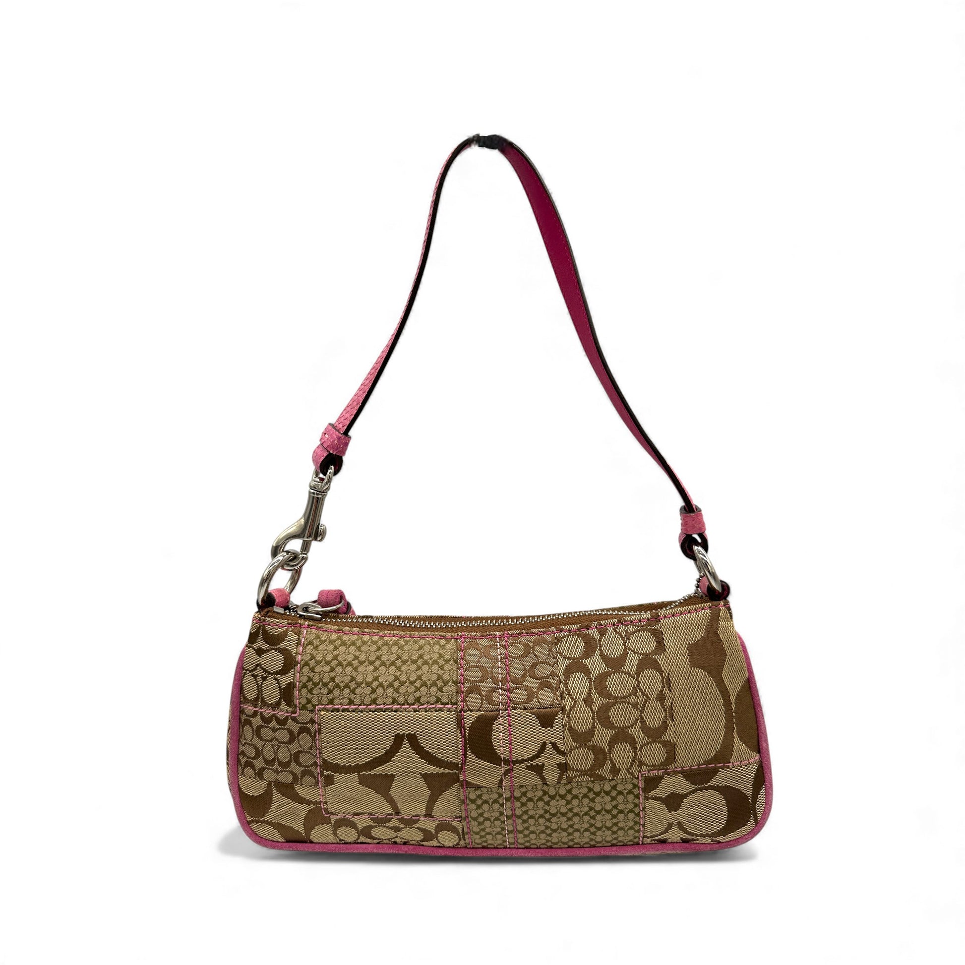 Vintage Coach 3693 Patchwork Mini Shoulder Bag. In monogram patchwork, trimmed with pink python leather, with tassel accent, a rare Y2K piece from 2005