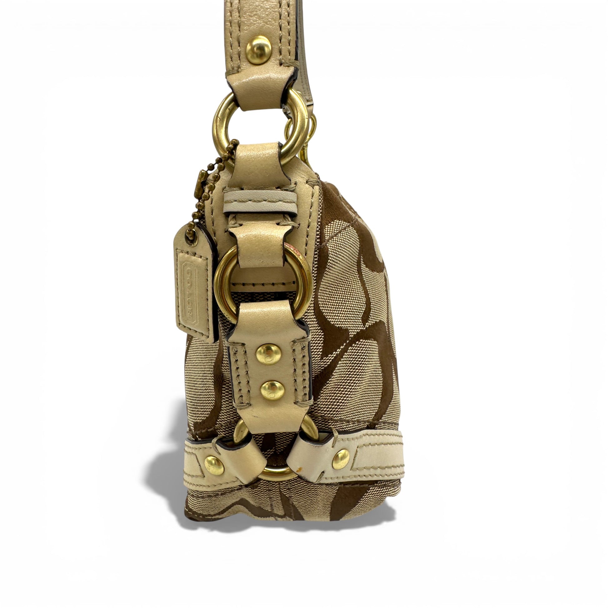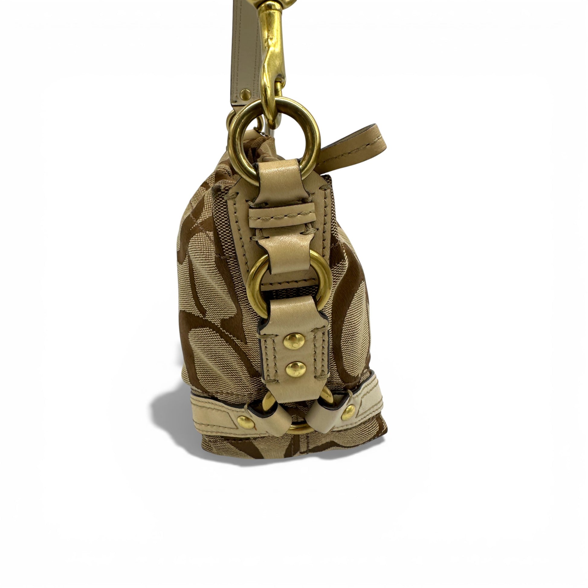 Vintage Coach 40347 Mini Carly Shoulder Bag. In brown and beige signature monogram with cream leather trim and gold-tone hardware. A Y2K piece from 2007.