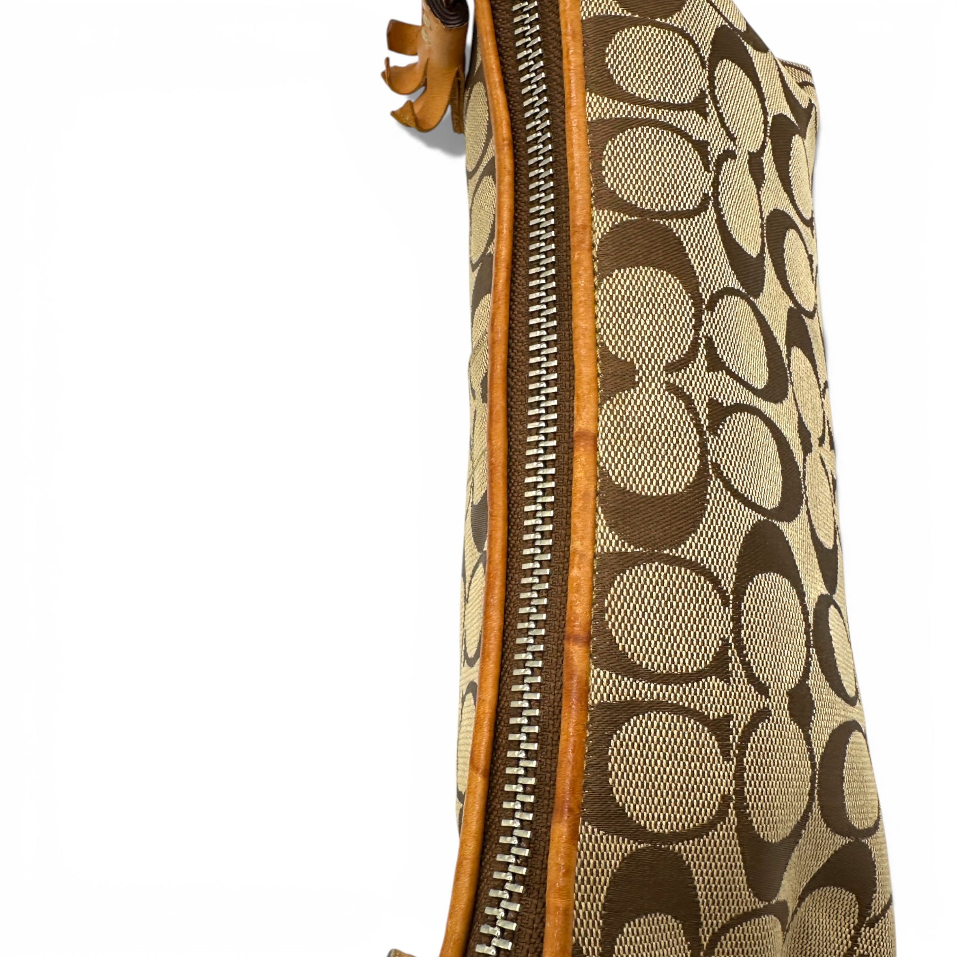 Vintage Coach 6371 Baguette Shoulder Bag. In brown and beige signature monogram, trimmed with brown tan leather and silver-tone hardware. An iconic Y2K piece from 2005.