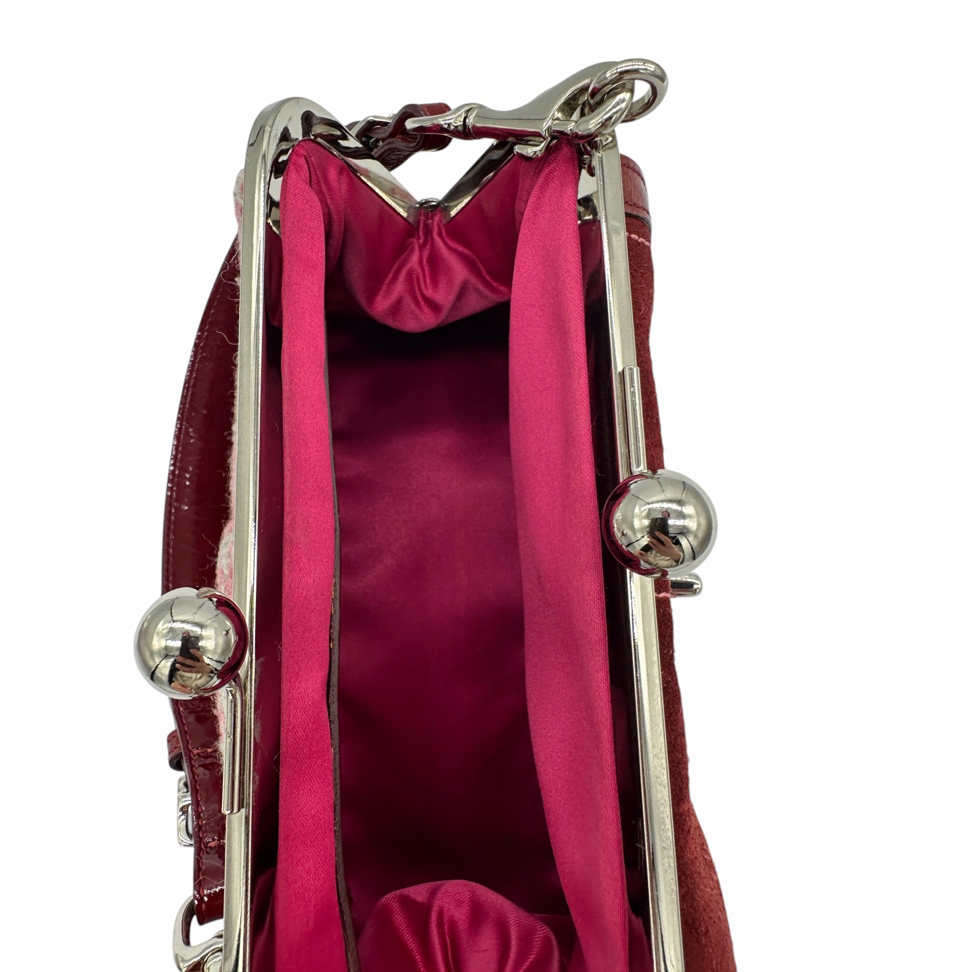 Vintage Coach 7481 Rare Tweed Kisslock Handbag. In wool houndstooth tweed, trimmed with burgundy red suede, with silver-toned kisslock and turnlock hardware. A rare Y2K piece from 2004.