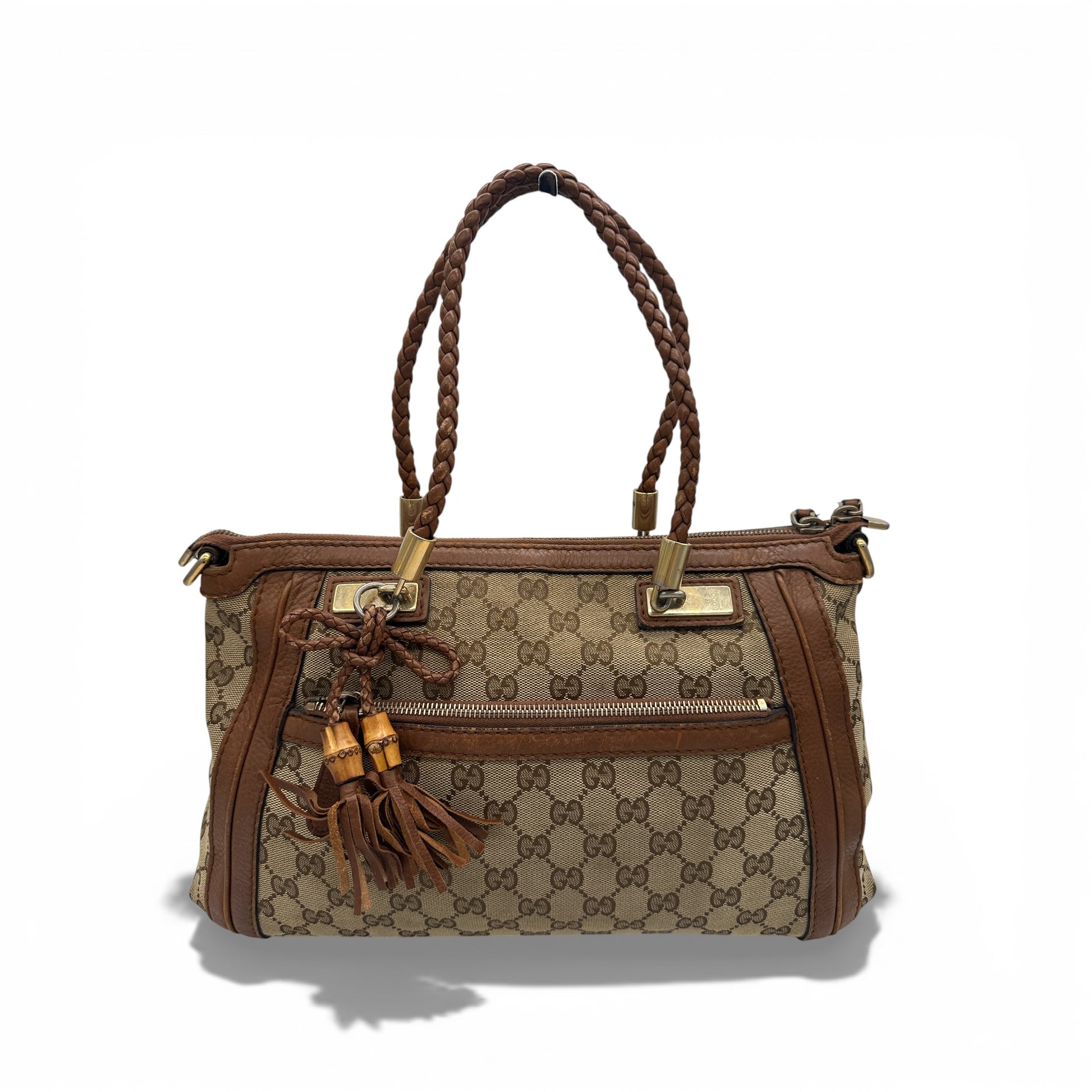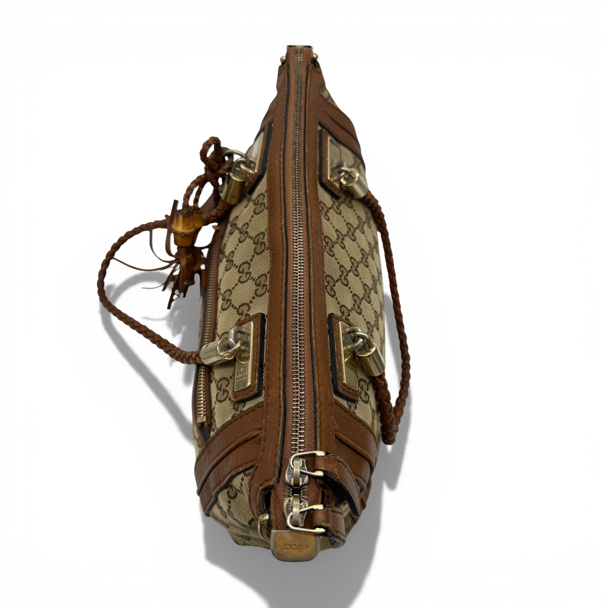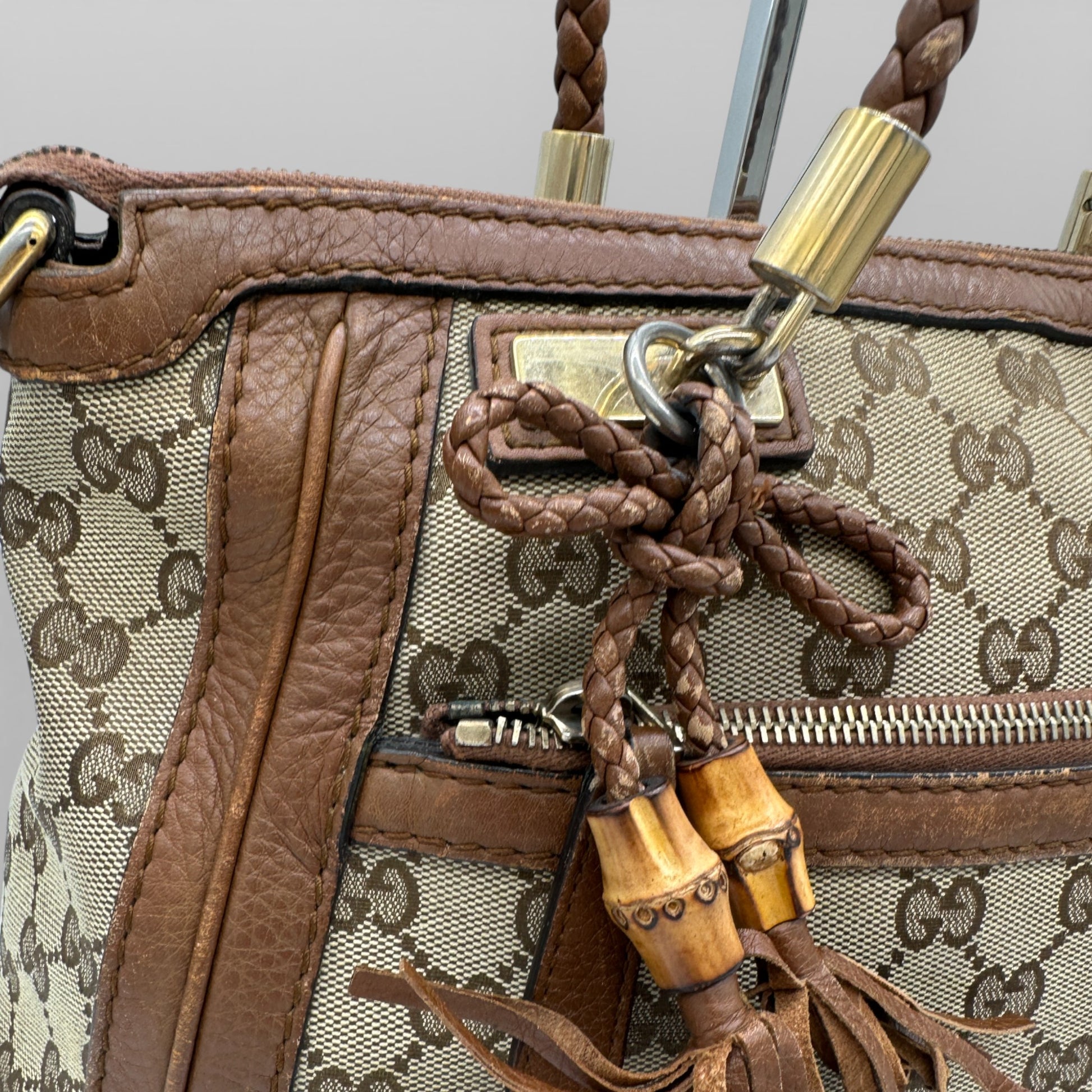 Vintage Gucci Bella 282300 GG Canvas Bamboo Handbag. In brown and beige GG monogram canvas with brown braided leather straps and bamboo accents and gold-toned hardware.
