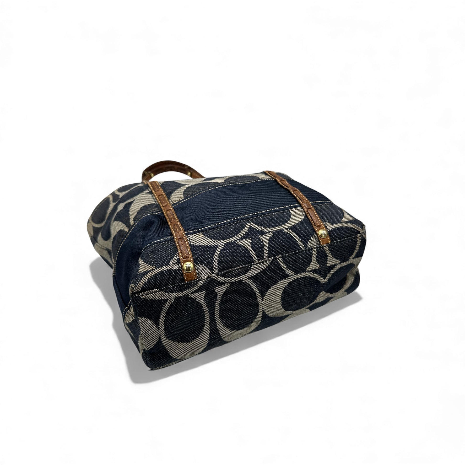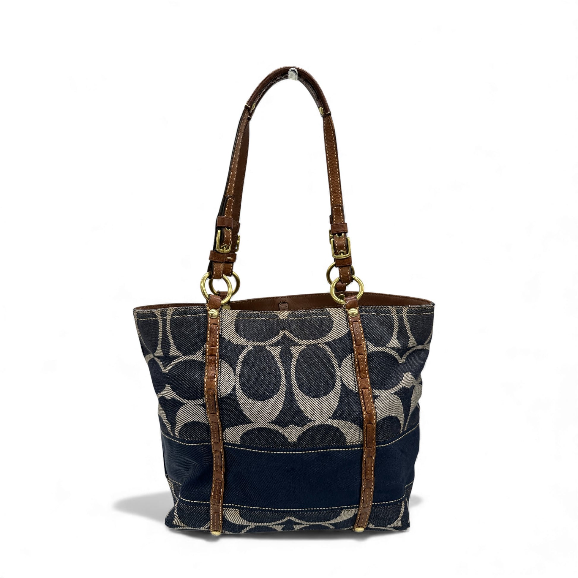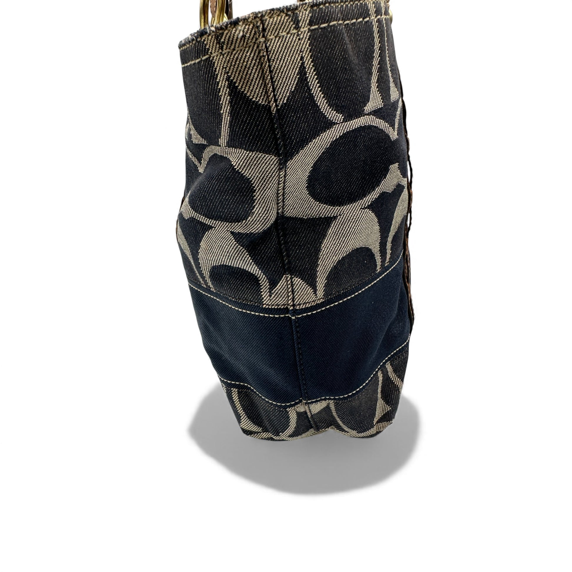Vintage Coach 11179 Denim Tote Shoulder Bag. In navy blue and silver signature denim monogram canvas, trimmed with brown leather with clip fastening. A Y2K piece from 2007.