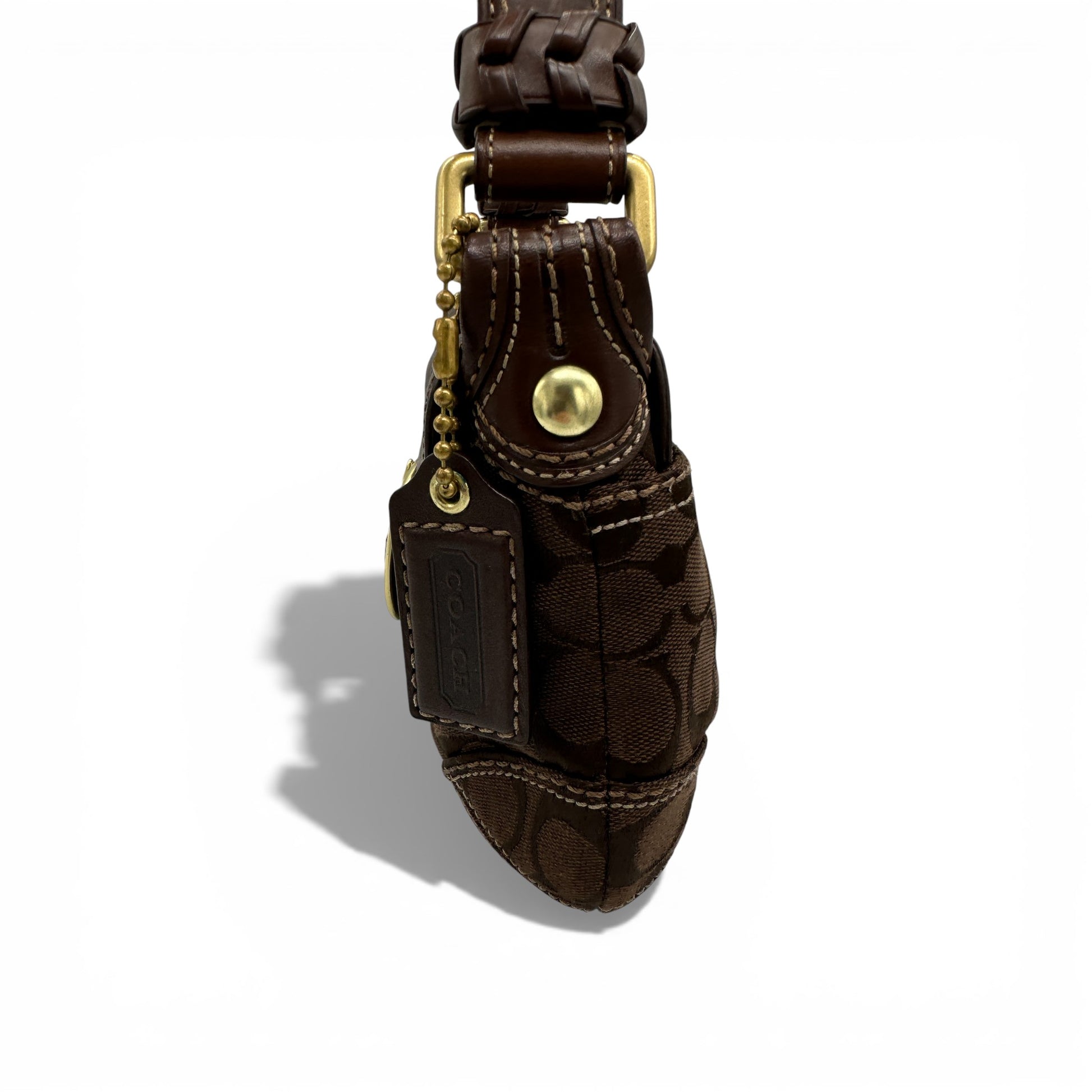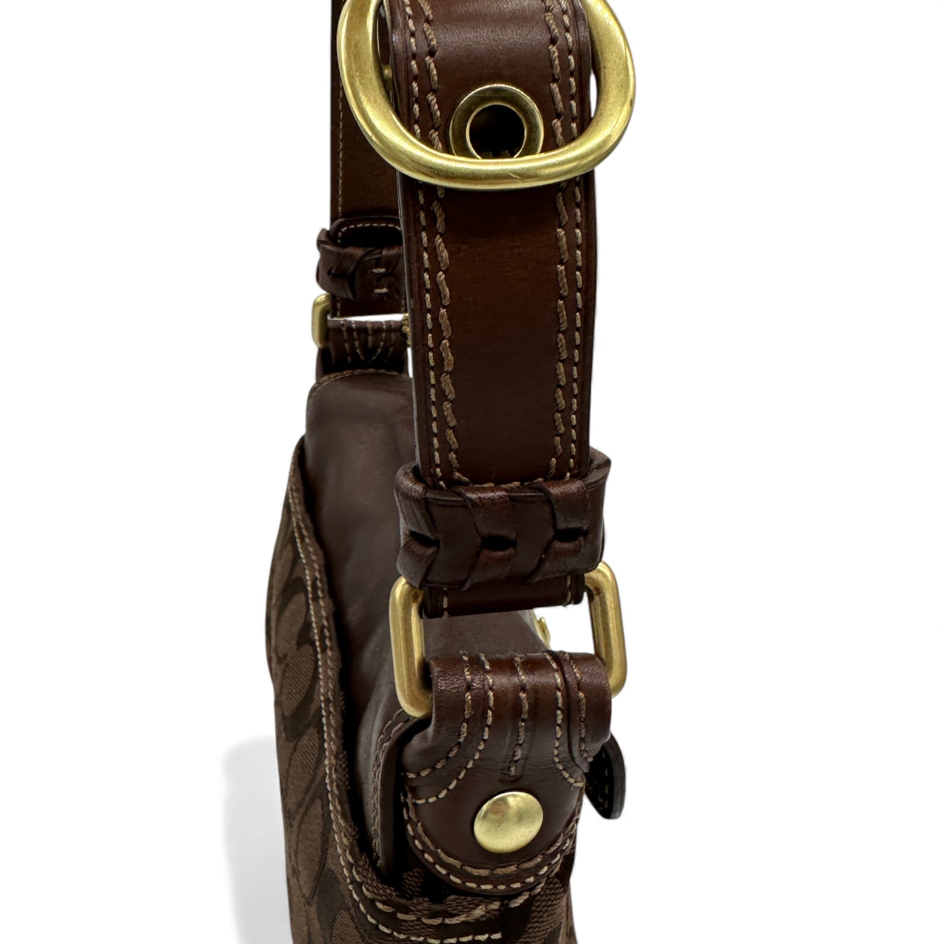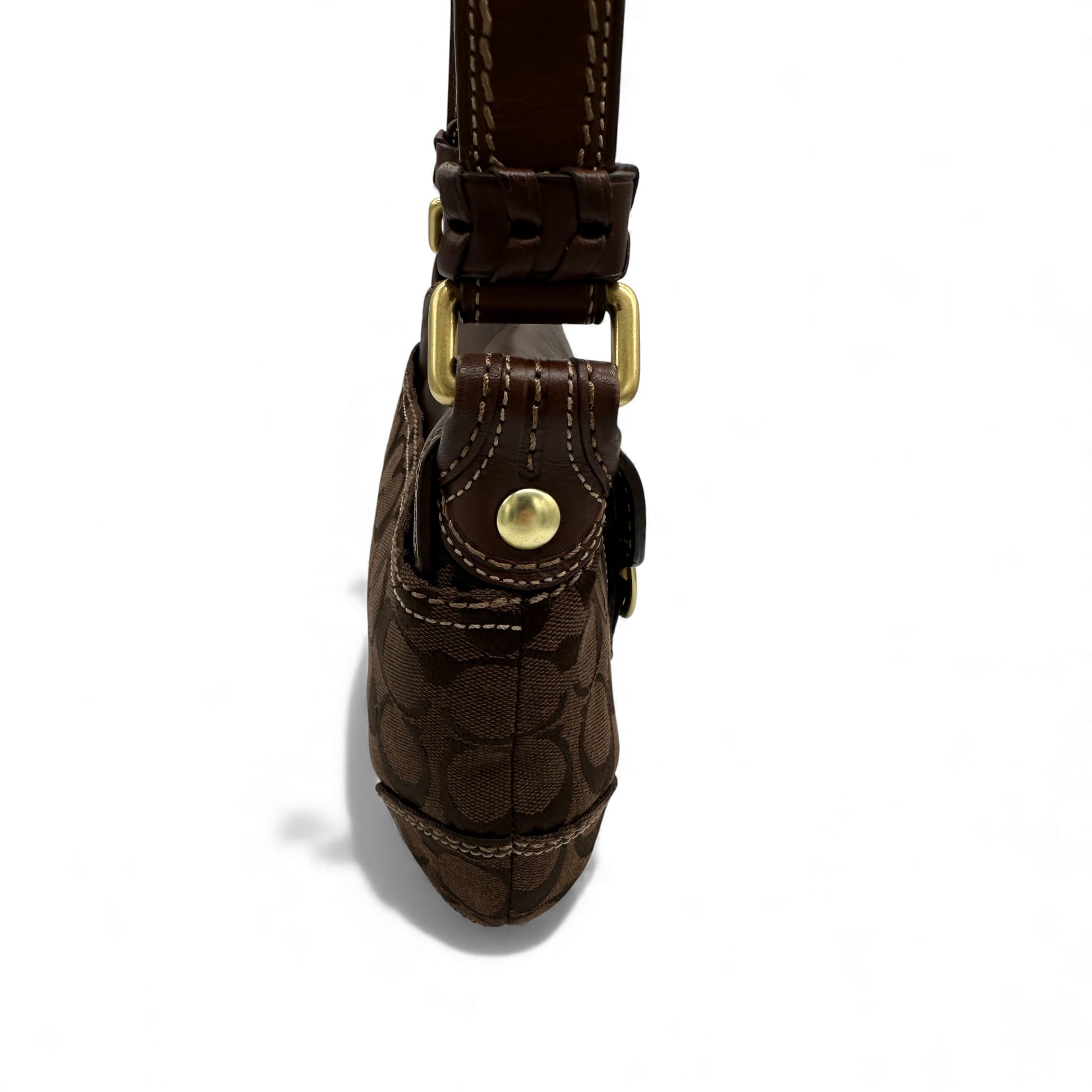Vintage Coach 11441 Bleecker Soho Buckle Shoulder Bag. In rare brown chocolate brown Signature Monogram, trimmed with dark brown leather and gold-tone brass Soho buckle hardware. A rare Y2K piece from 2007.