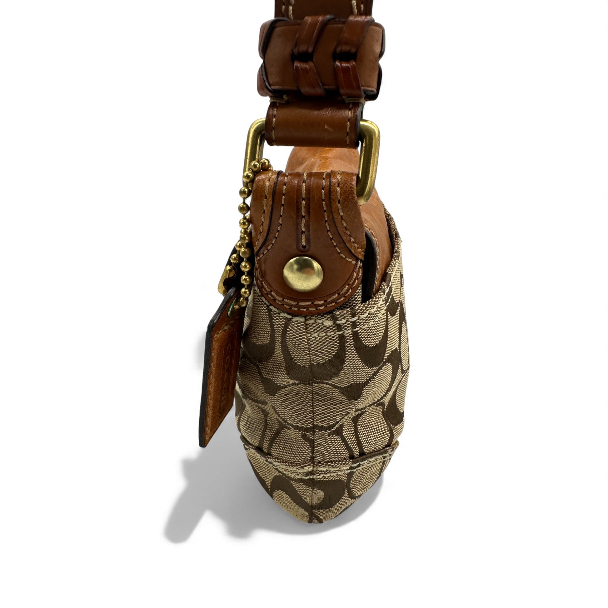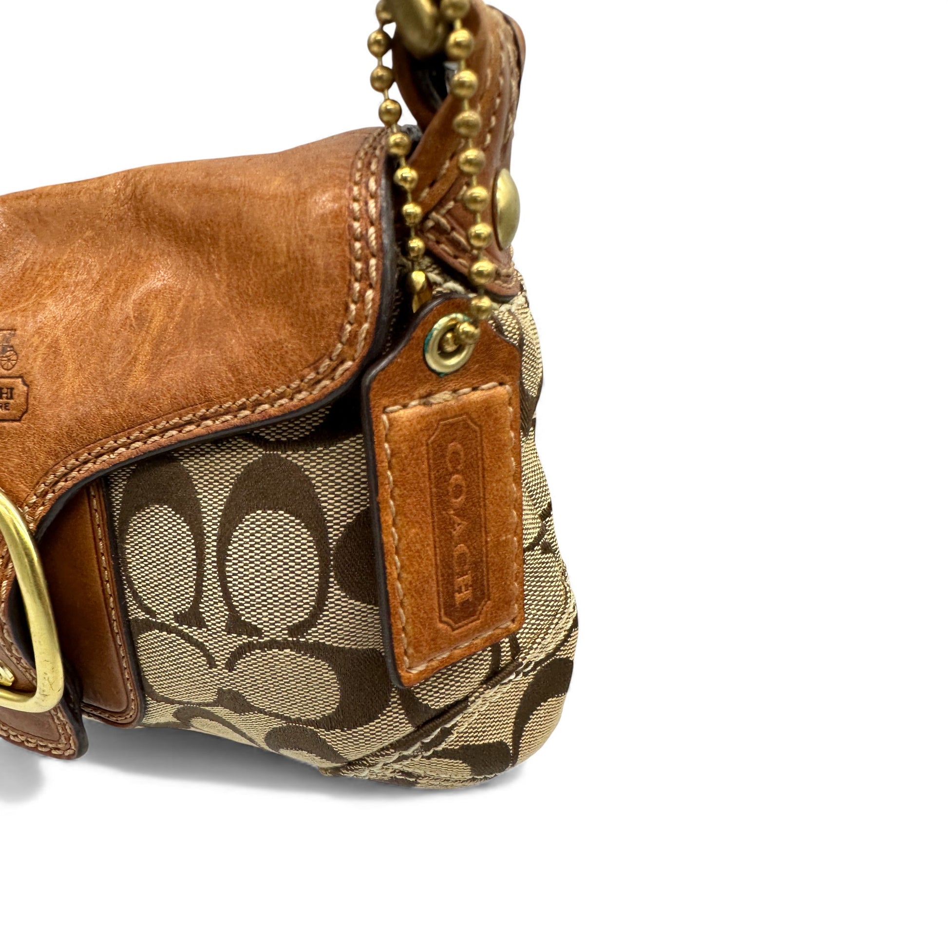 Vintage Coach 11441 Bleecker Soho Buckle Shoulder Bag in Tan Leather and Signature Monogram, with brass gold-tone soho buckle hardware. A Y2K piece from 2007.