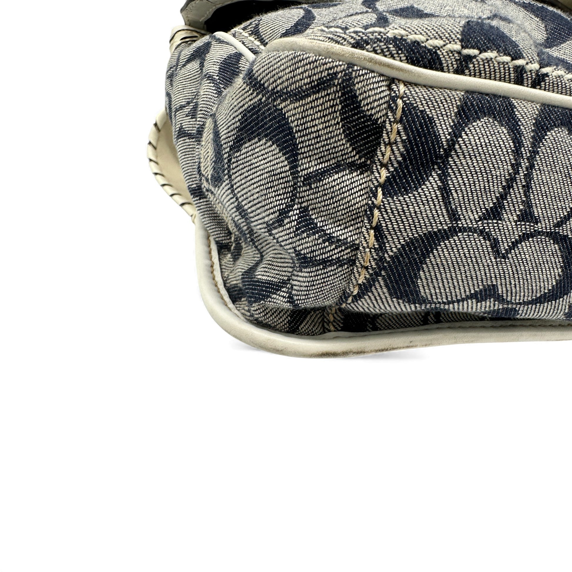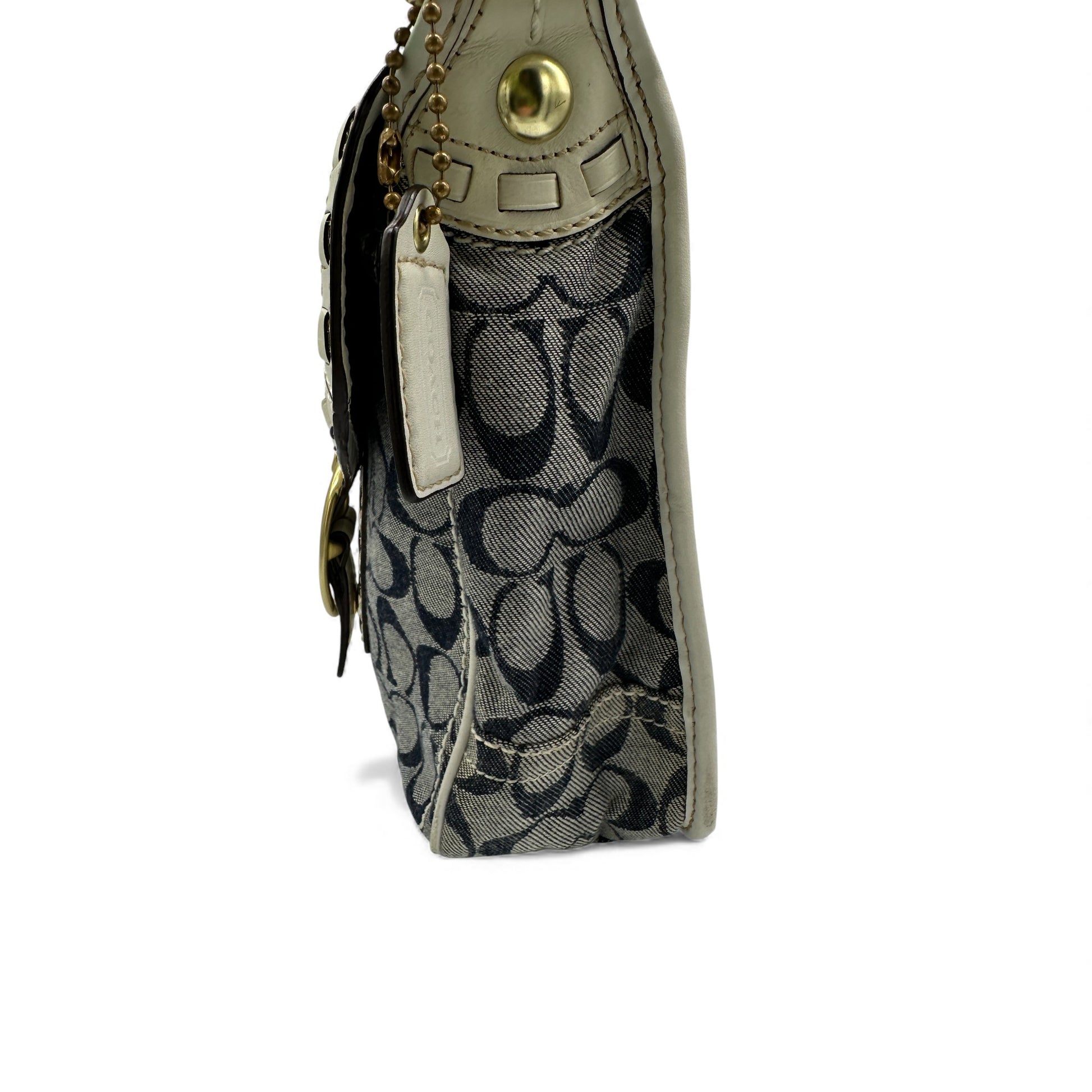 Vintage Coach 11585 Bleecker Buckle Shoulder Bag in navy signature monogram with white leather trim and brass Soho Buckle hardware. A Y2K piece from 2007.