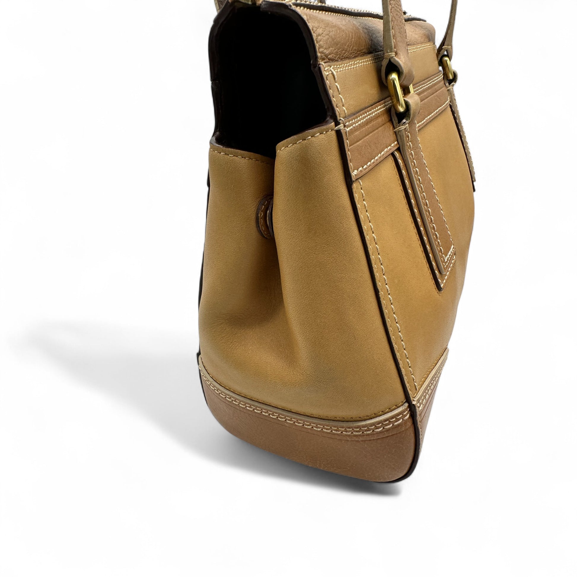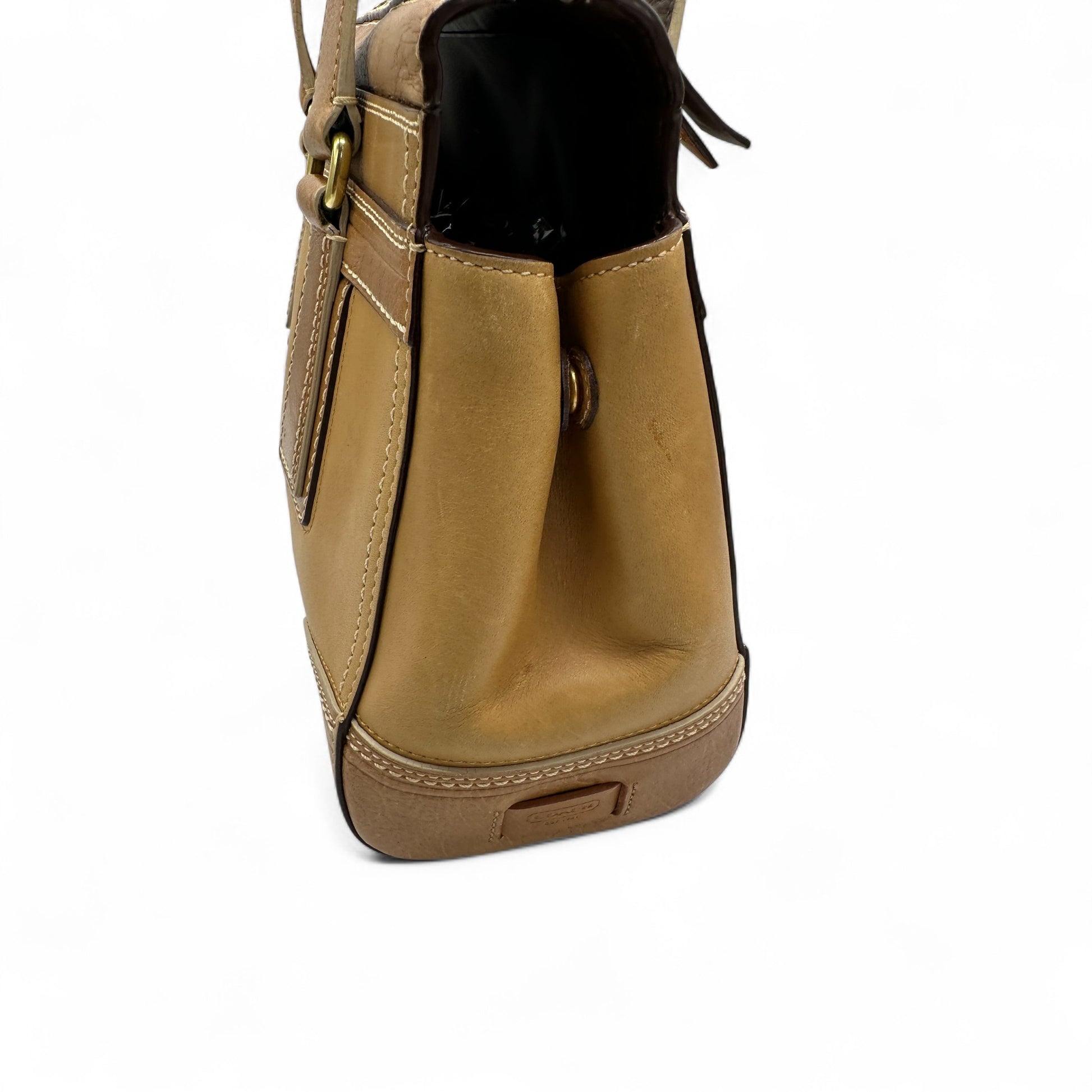 Model and style: Vintage Coach 11639 Turnlock Handbag in tan cowhide leather with brass hardware and stripe detail. A Y2K piece from 2007.