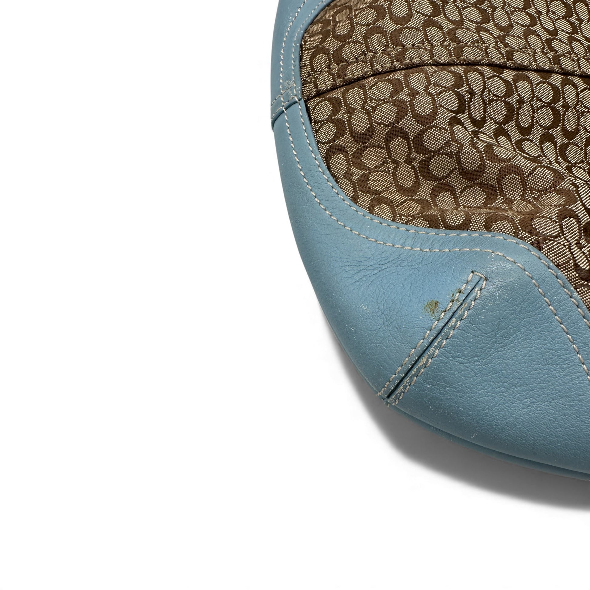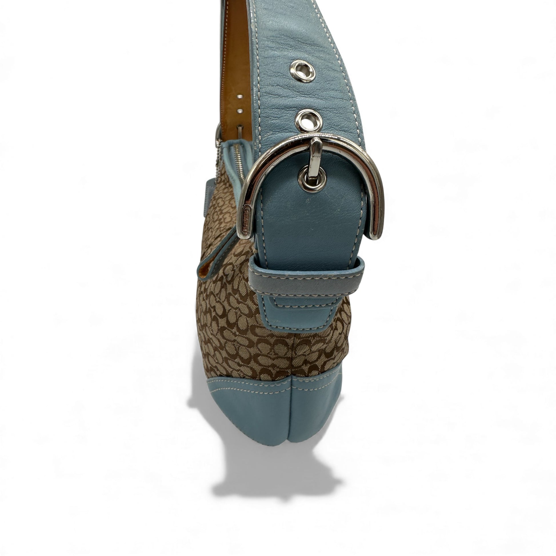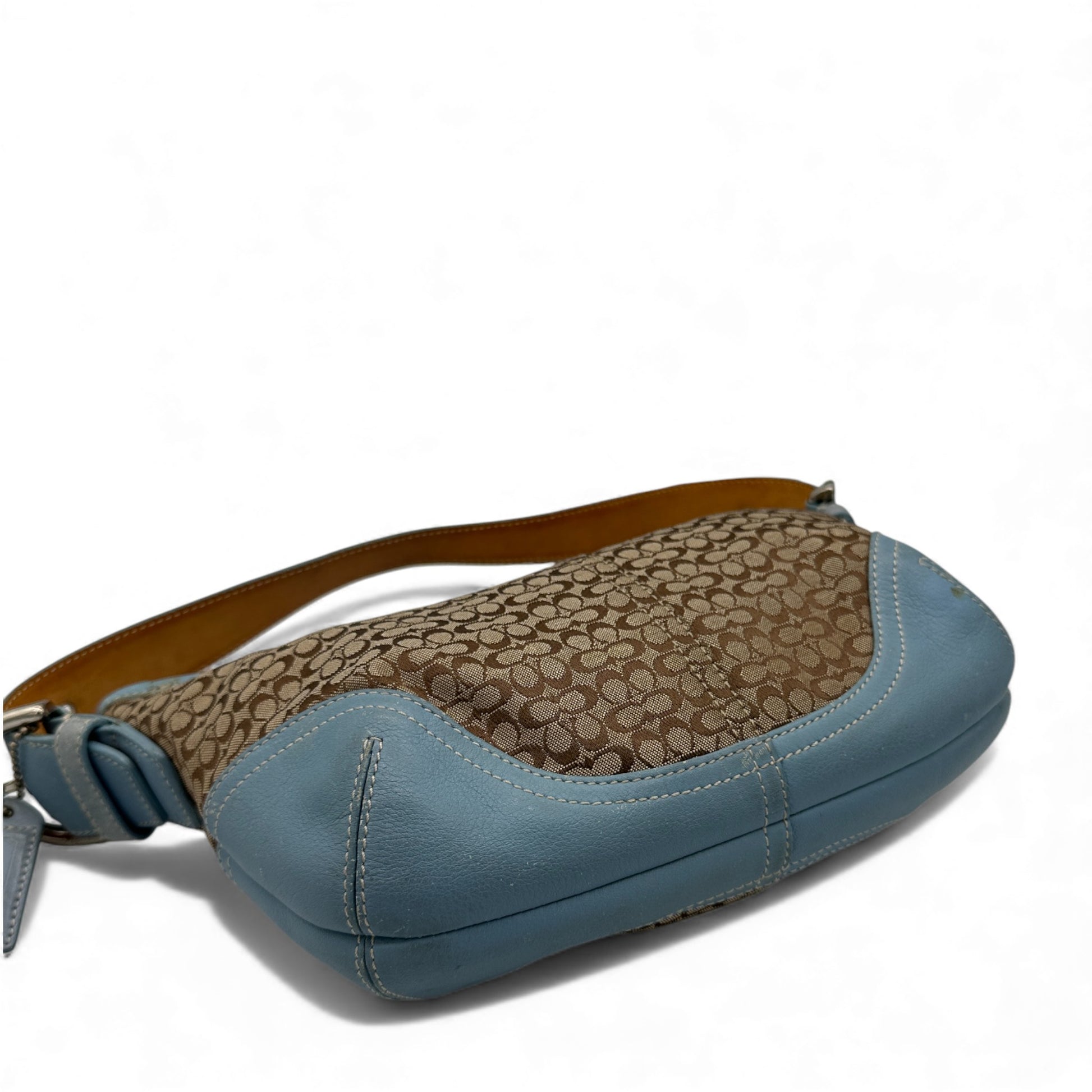 Vintage Coach 6351 Croissant Shoulder Bag in beige mini monogram, trimmed with baby blue leather and silver soho buckle hardware. A Y2K piece from 2003.