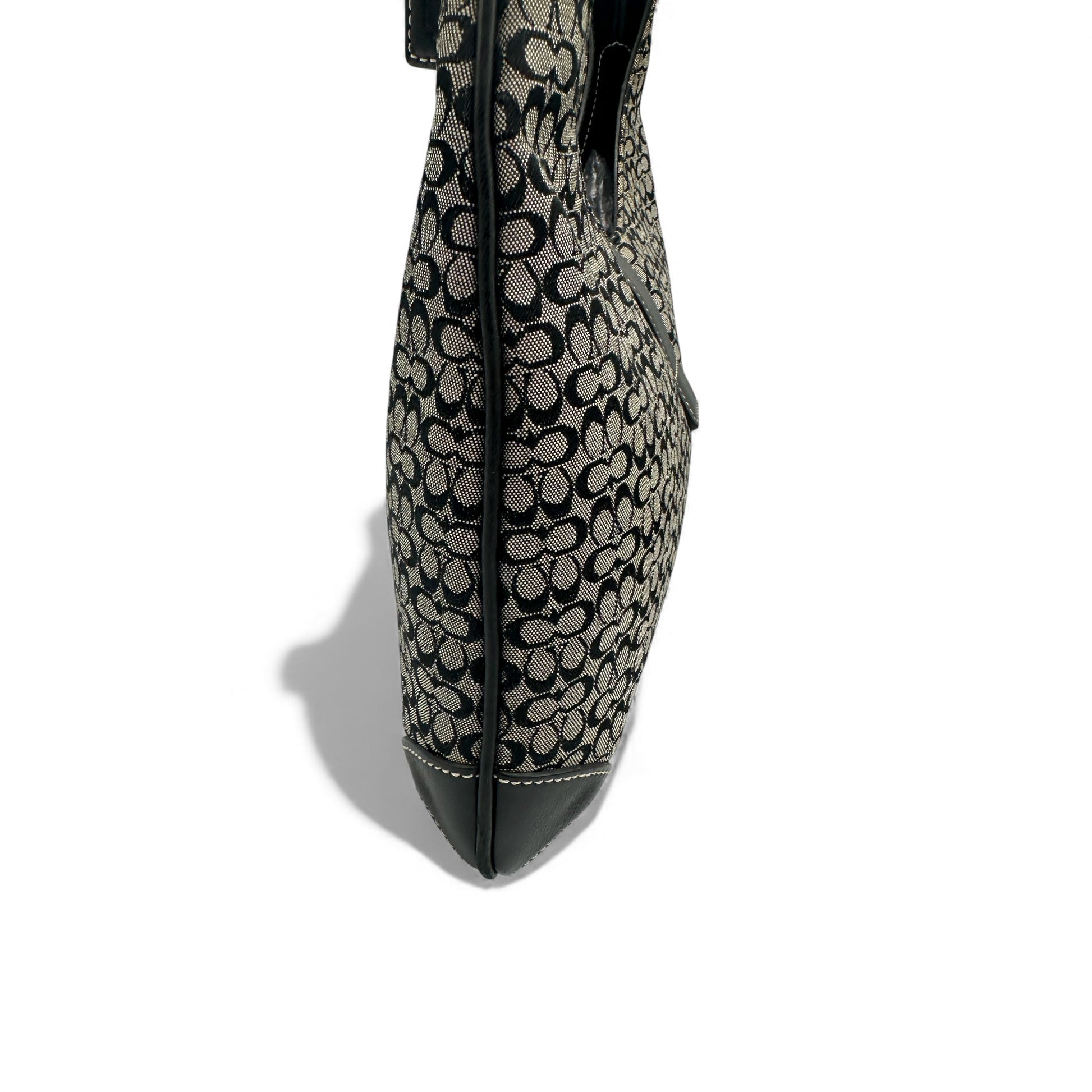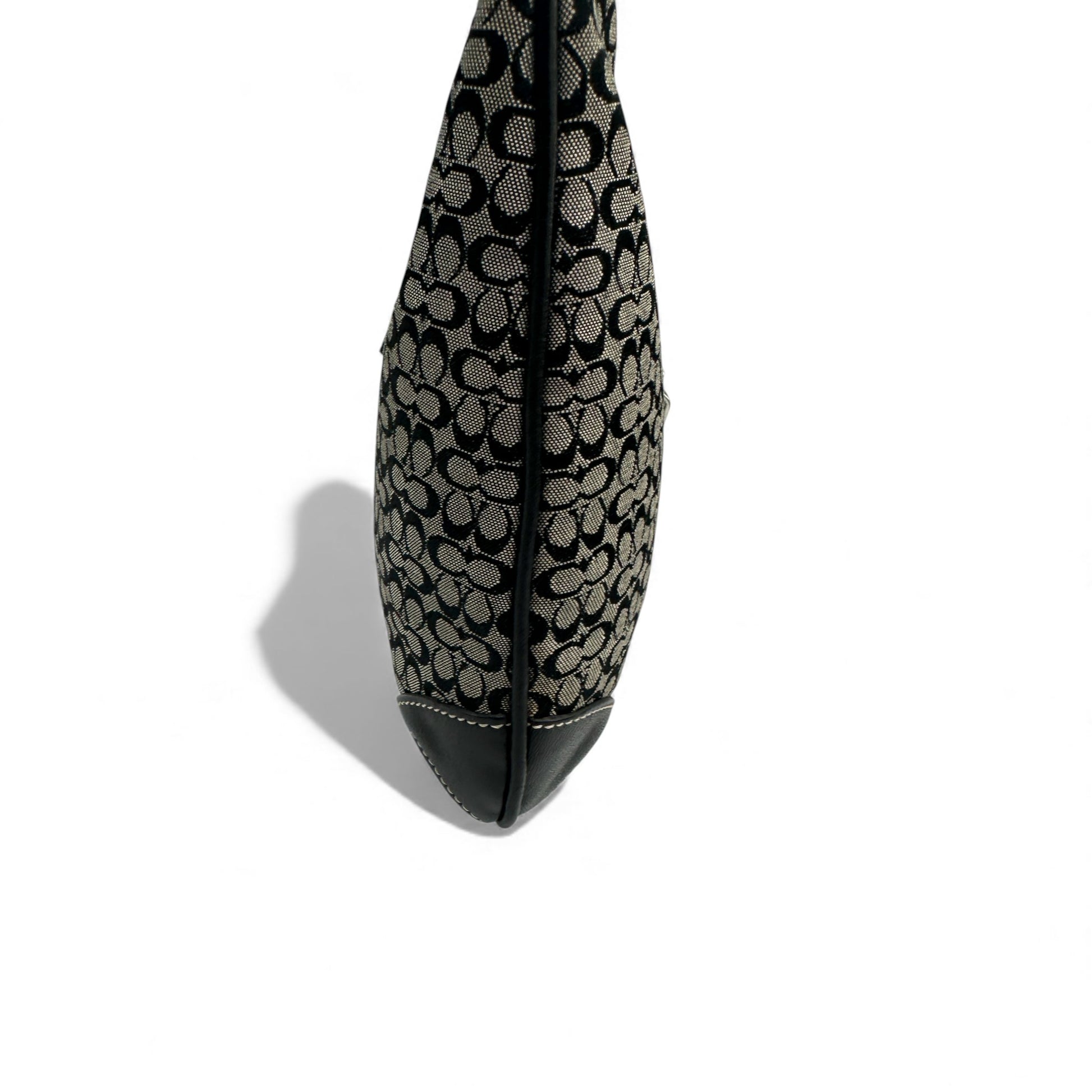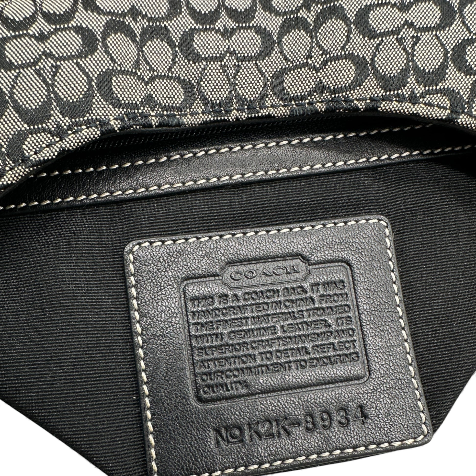 Vintage Coach 8934 Shoulder Bag in black mini monogram with black leather trim and silver-tone Hampton clip hardware. Y2K piece from 2002