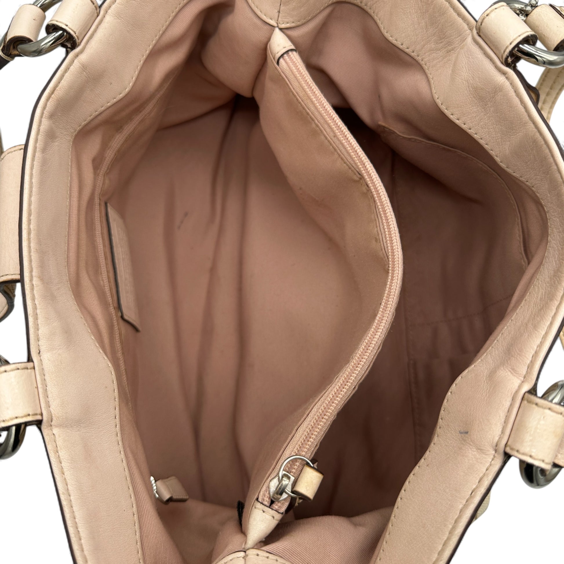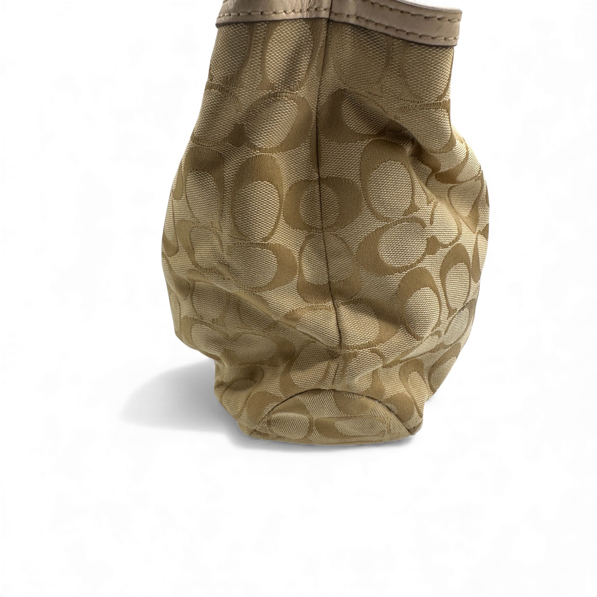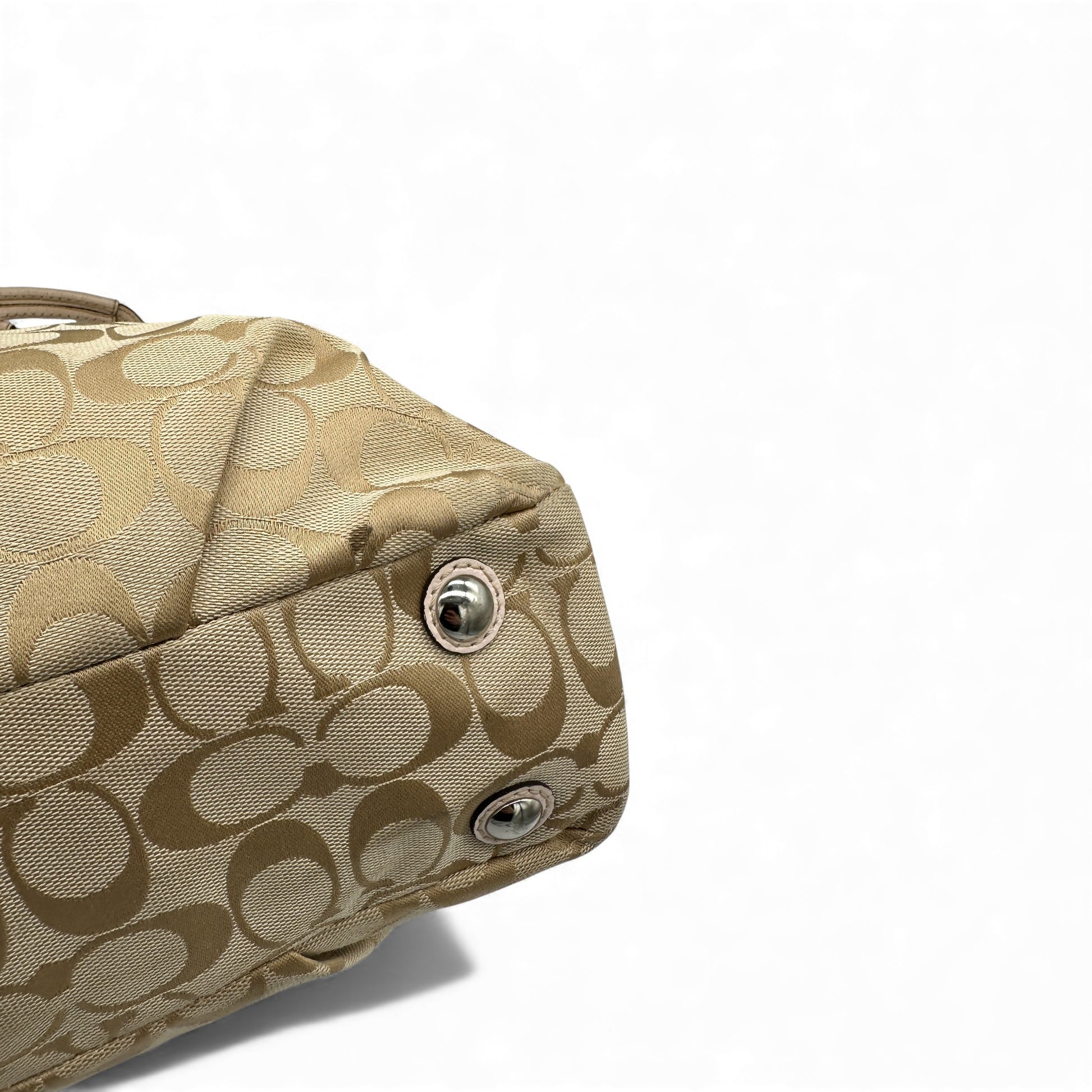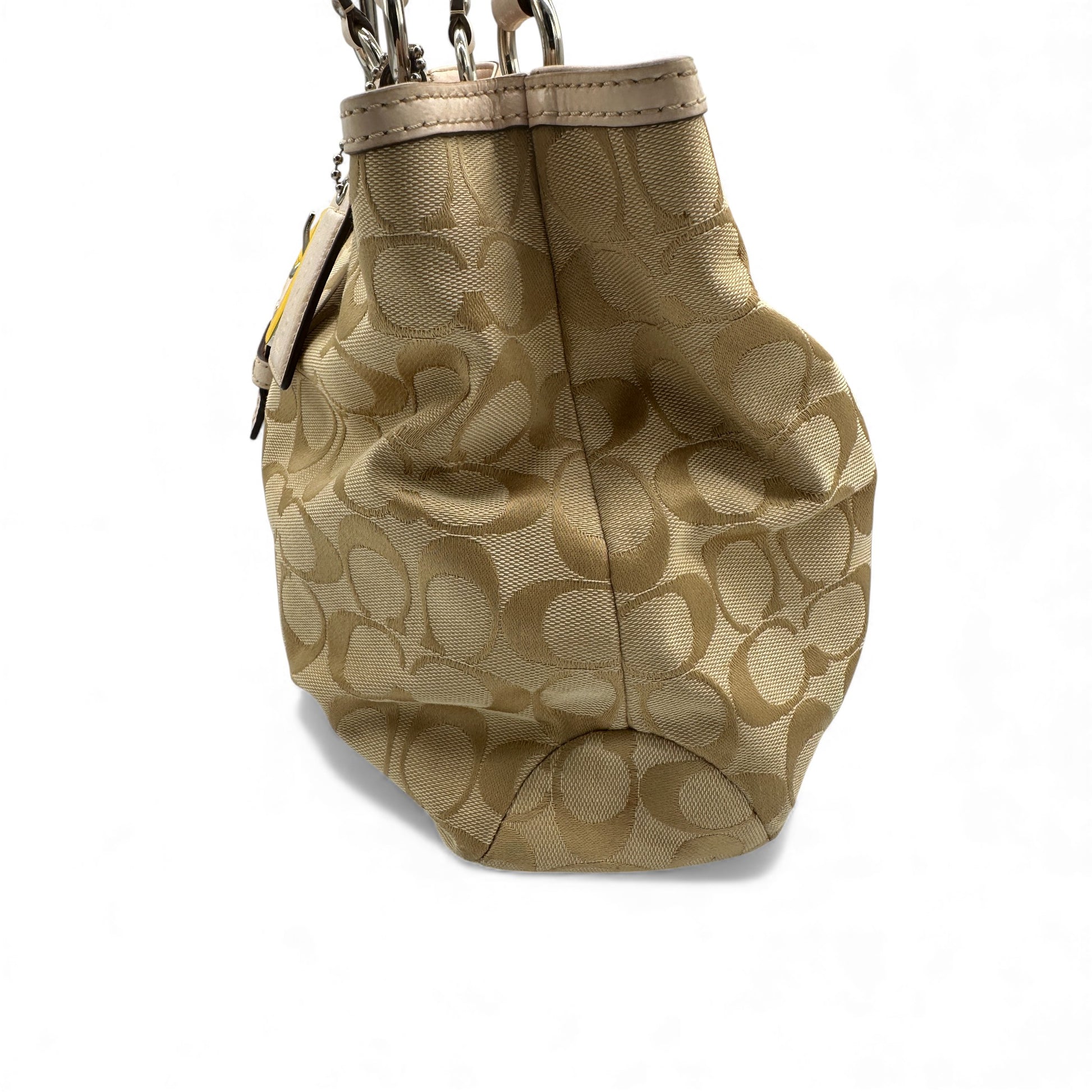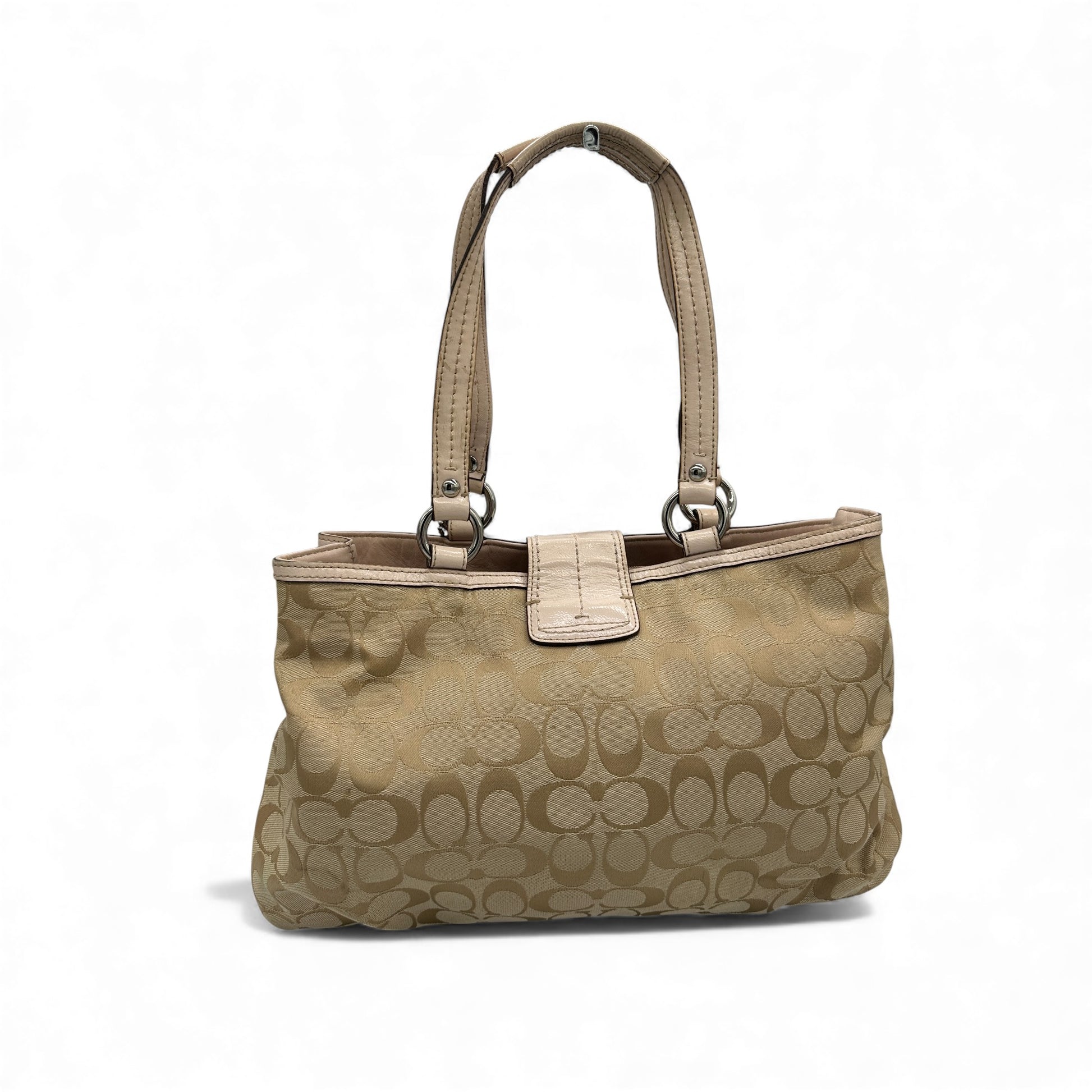 Vintage Coach F18750 Soho Tote Shoulder Bag in cream & beige signature monogram, trimmed with baby pink patent leather. A Y2K piece from 2012.
