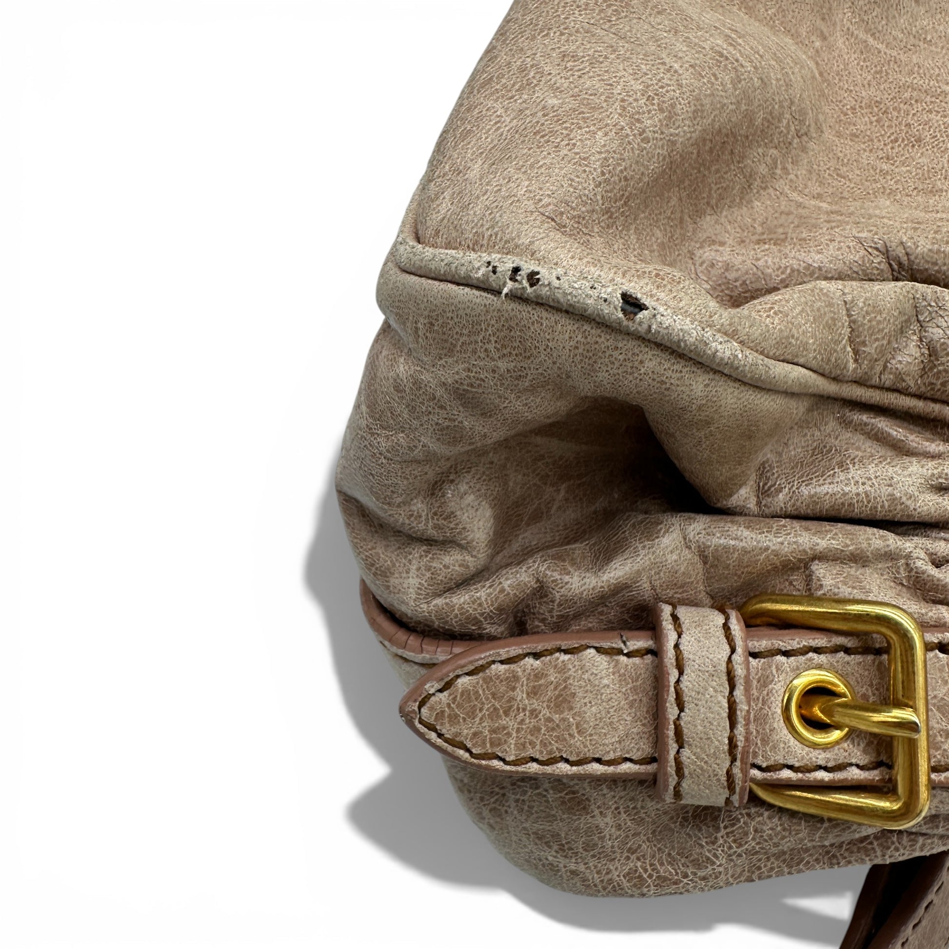 Vintage Miu Miu 2-Way Nappa Leather Handbag. In muted pink / beige distressed Nappa lambskin leather with gold-tone coloured hardware and padlock accessory. The top handles be worn as a handbag or on the shoulder, with additional detachable crossbody strap.