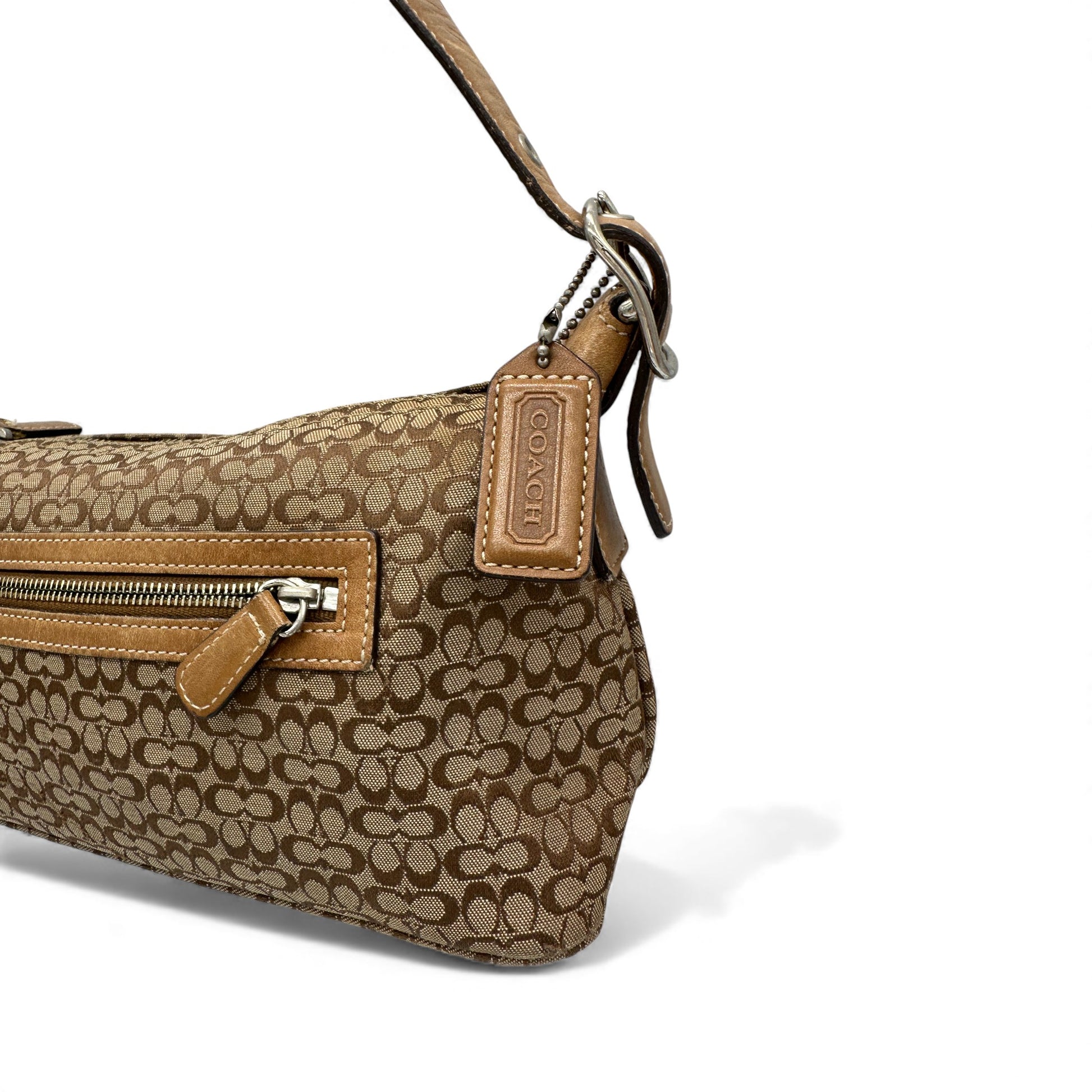 Vintage Coach 6332 Shoulder Bag. In brown and tan mini monogram, trimmed with tan leather. With silver buckle hardware detailing and front zip compartment, with Coach leather hangtag. A Y2K piece from 2002.