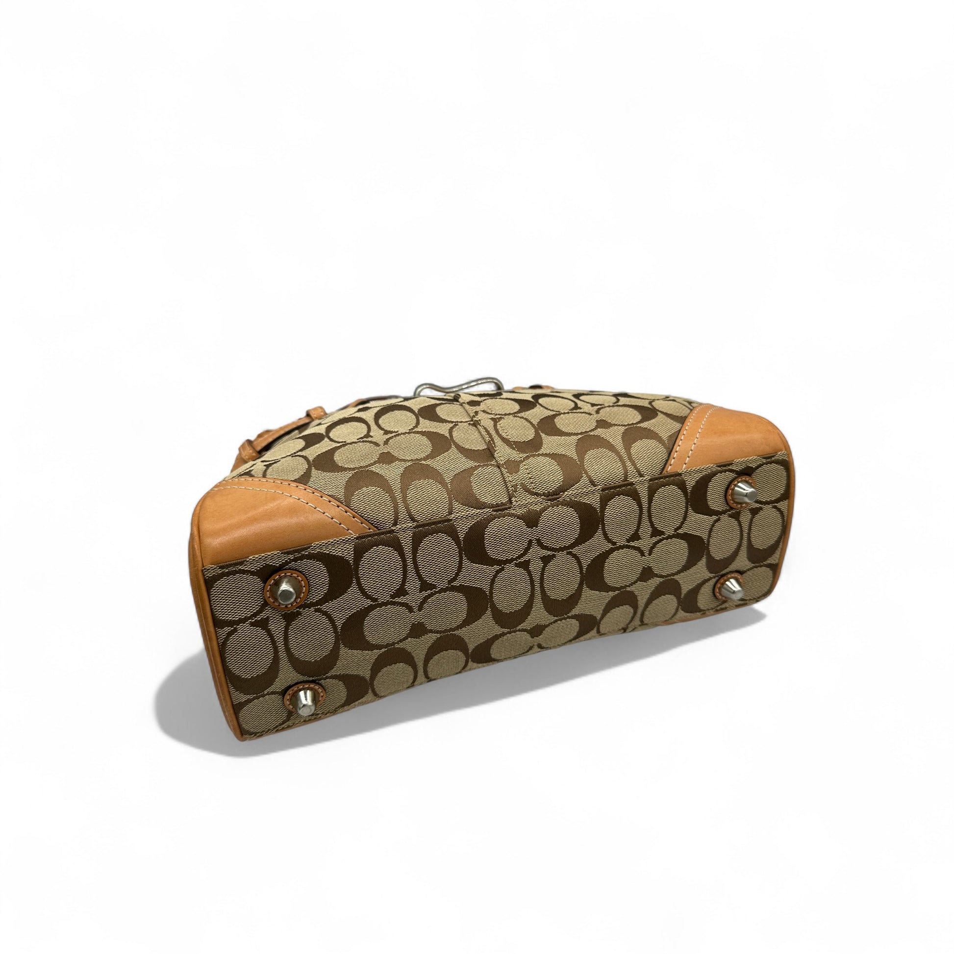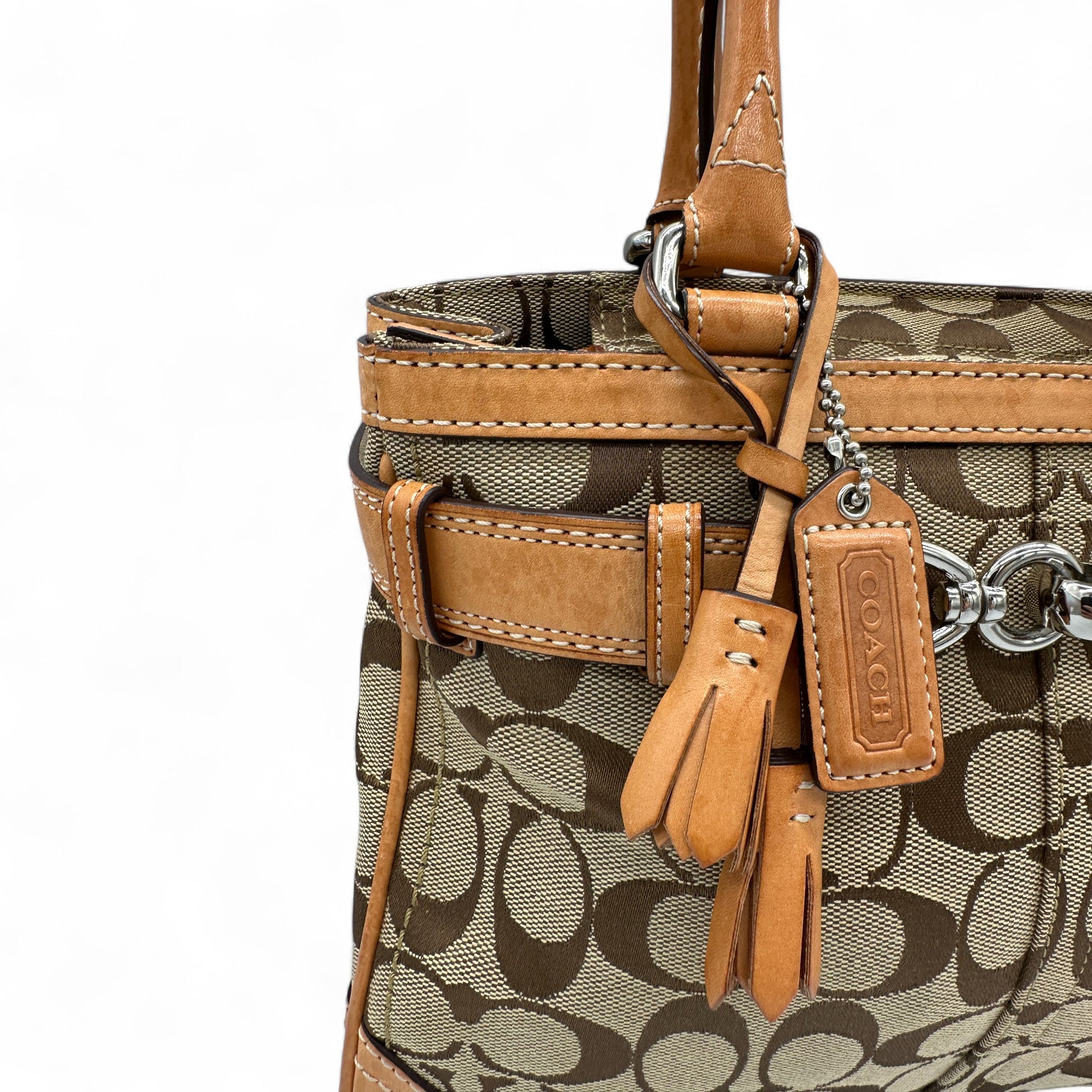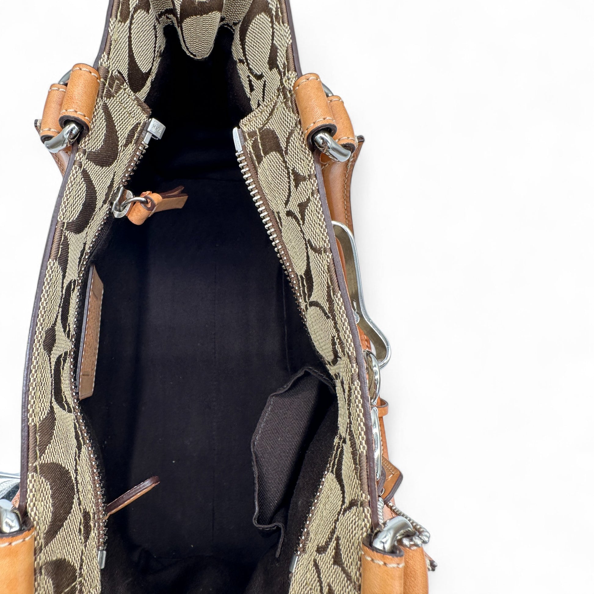 Vintage Coach 8K06 Hampton Clip Handbag. In brown and beige signature monogram with brown leather trim and silver hardware. Vintage Coach tote bag from 2005.